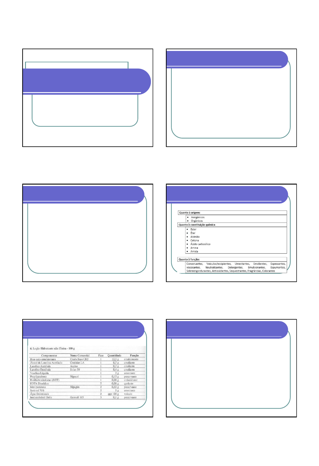 06/08/2012 1 Composição de Produtos Cosméticos DISCIPLINA: Cosmetologia I Profa. M.Sc. JESSICA MENDES NADAL Componentes Básicos de uma Formulação Cosmética A grande dificuldade encontrada em classificar e estudar os diversos itens que compõem as preparações cosméticas sob variadas formas de apresentação, nos impulsiona a agrupar as matérias-primas utilizadas e a partir destes grupos, discutir as diversas possibilidades de composição que estas preparações estão sujeitas. As matérias-primas são utilizadas nas formulações de acordo com suas propriedades funcionais e físico- químicas. Estas propriedades são derivadas de suas respectivas estruturas químicas. Componentes Básicos de uma Formulação Cosmética As substâncias que compõem uma formulação cosmética são chamadas matérias-primas e podem ser: • orgânicas (extraídas dos reinos animal e vegetal): naturais (in natura) ou semi-sintéticas (aperfeiçoadas para o uso); • inorgânicas (extraídas do reino mineral): naturais (in natura) ou sintéticas (processadas quimicamente). Componentes Básicos de uma Formulação Cosmética As matérias-primas são classificadas: Componentes Básicos de uma Formulação Cosmética Exemplo de uma formulação: Componentes Básicos de uma Formulação Cosmética VEÍCULOS É o componente que geralmente aparece em maior quantidade na fórmula e que tem a função de receber os outros componentes, isto é, nele são incorporadas estas outras substâncias. Devem ter grande capacidade de solubilização ou de dispersão, conforme o caso. A escolha do tipo de veículo deve se basear na compatibilidade com os outros componentes e também no tipo de pele a que se destina o produto. Podem ser: água, álcool, mistura hidroalcoólica, óleo, glicerina, loções base, cremes base. 06/08/2012 2 Componentes Básicos de uma Formulação Cosmética ÁGUA Ingrediente fundamental das formulações cosméticas e deve passar por uma série de tratamentos para tornar-se adequada ao processo fabril. • Filtros de areia: retêm sólidos presentes na água. • Filtros de carvão: filtram e retêm cloro e matéria orgânica presente na água. • Desmineralização: elimina íons presentes na água através da troca iônica. A água utilizada para a fabricação de cosméticos deve ser colhida na rede pública e passar por um processo de desmineralização, no qual se retiram os cátions (+) e os ânions (-). Em seguida, deve ser preservada a fim de evitar a proliferação de microorganismos. Componentes Básicos de uma Formulação Cosmética UMECTANTES São substâncias higroscópicas, capazes de absorver água do ambiente, “molhando” a superfície da pele. Adicionados às preparações cosméticas, principalmente cremes e géis. Objetivo: reduzir a dessecação superficial pelo contato com o ar (das fórmulas) e sobre a pele forma uma película que permanece sobre esta após a aplicação do produto favorecendo a hidratação. Estes reduzem a velocidade da perda da água, porém este efeito pode ser reforçado com adequado nível de vedação dado pelas tampas das embalagens. Componentes Básicos de uma Formulação Cosmética UMECTANTES Têm a propriedade de reter água na massa do creme, diminuindo a perda nos produtos acabados. Evitando o ressecamento e formação de crostas. Atuam também favorecendo o espalhamento das emulsões e conservação da umidade na camada córnea. São considerados fatores de hidratação pois impedem a perda de água pela pele. Componentes Básicos de uma Formulação Cosmética UMECTANTES Os agentes umectantes mais utilizados são propilenoglicol, glicerina, polietilenoglicol, sorbitol, lactatos, álcool etílico, PVC (policloreto de vinila) entre outros. Depois da água, os umectantes são os solventes mais utilizados em produtos farmacêuticos e cosméticos. Misturam-se à água em qualquer proporção e dissolvem muitas substâncias hidrófobas (não solúveis em água). Também possuem propriedades anti-sépticas. Componentes Básicos de uma Formulação Cosmética UMECTANTES Podem ser: - Polióis (glicois): álcoois contendo mais de um grupo OH, solúveis em água, possuem toque untuoso (pegajoso). Ex.: propilenoglicol, glicerina, sorbitol - Poliglicois: São solúveis e água, seu estado físico depende do grau de etoxilação (PM). Ex.: polietilenoglicol - Carboidratos: aldeídos ou cetonas que são ao mesmo tempo polióis. Ex.: Açucares (glicose, frutose), amido, celulose. - Derivados do ácido carboxílico: reagem com bases e formam sais orgânicos com capacidade de hidratação. Ex.: Lactato de Sódio (ac. Lático + NaOH), Glicolato de Sódio. EXEMPLOS Glicerina: (2-10%) é pegajosa em altas concentrações Propilenoglicol: é o mais utilizado e aumenta a solubilidade dos parabenos Dipropilenoglicol Sorbitol: menos volátil que a glicerina e o propilenoglicol, no entanto é pegajoso Extratos vegetais Colágeno Sacarídeos e polissacarídeos: - Umectan® - Henrifarma. Concentração: 2 – 10% 06/08/2012 3 Componentes Básicos de uma Formulação Cosmética EMOLIENTE São substâncias que têm a propriedade de tornar a pele macia e suave, evitando e atenuando seu ressecamento. São responsáveis pelo espalhamento e lubrificação da pele e cabelo, que juntamente com os umectantes serão responsáveis pela hidratação da pele e cabelo. São responsáveis nas formulações por consistência e aparência. Nos cremes e loções, são responsáveis por propriedades como espalhamento, absorção, viscosidade, sensação na pele e outras. São matérias-primas de grande importância e quimicamente pertencem a grupos diversos, citados a seguir. Emolientes São componentes da fase oleosa Os emolientes variam as características sensoriais das emulsões: Espalhamento Absorção Sensação na pele Viscosidade Solubilização de ativos Interfere diretamente na espalhabilidade e consistência Classificação Parafinicos Isoparafinicos Nao polares G