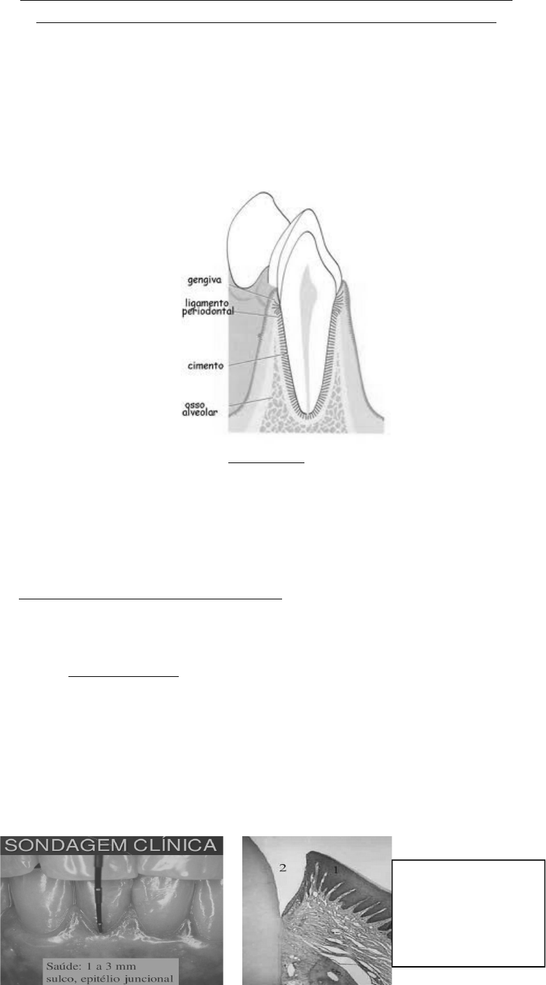 PERIODONTO DE REVESTIMENTO OU PROTEÇÃO E PERIODONTO DE INSERÇÃO OU SUSTENTAÇÃO O periodonto é constituído pelo tecido de revestimento ou proteção (gengiva) e de sustentação ou inserção do dente – fixação dos dentes (ligamento periodontal, cemento, osso alveolar). O periodonto está sujeito a variações morfológicas e funcionais, bem como a modificações com a idade. O periodonto tem como principal função inserir o dente no tecido ósseo dos maxilares e manter a integridade da superfície da mucosa mastigatória da cavidade oral. GENGIVA A mucosa oral consiste em: • gengiva e revestimento do palato duro (mucosa mastigatória); • dorso da língua, revestido pela mucosa especializada; • e membrana mucosa oral (reveste o restante da cavidade oral). A gengiva é a parte da mucosa oral que recobre os processos alveolares dos maxilares e circunda o colo dos dentes; sendo dividida em: · Gengiva marginal ou gengiva livre: “não inserida”, margem da gengiva que circunda os dentespodendo delimitar-se com a gengiva inserida adjacente pelo sulco gengival livre. Geralmente apresenta largura de aproximadamente 1 mm. · Sulco gengival – espaço raso em torno do dente, em formato de “V”, permite a entrada de uma sonda periodontal com resistência. Quanto mais raso for o sulco, melhor é, já que há menos chance de haver retenção de biofilme. O sulco gengival tem duas paredes, sendo uma parede mole, que corresponde a face interna da gengiva marginal; e uma parede dura, que corresponde ao dente. A profundidade clínica corresponde a até 2mm nas faces livres e até 3mm nas faces proximais (devido a altura das papilas). A gengiva marginal é um pouco mais lisa que a gengiva inserida, que tem aspecto de casca de laranja. · Gengiva inserida: contínua com a gengiva marginal. Ela é firme, resiliente e firmemente aderida ao periósteo subjacente do osso alveolar. A face vestibular da gengiva inserida estende-se em direção à mucosa alveolar, separada pela junção mucogengival. A largura da gengiva inserida é um importante parâmetro clínico. A gengiva inserida não tem uma medida padrão e nem é constante, pois normalmente cresce com o tempo, mas nos dentes anteriores sua extensão é maior que nos posteriores (há menos osso alveolar para que a gengiva se insira). · Gengiva interdentária: é a papila interdental, que preenche as ameias interdentárias, espaço interproximal situado abaixo da área do contato dentário. O formato da papila é piramidal, ou de “col” que é a depressão entre as papilas e está presente nas áreas entre pré-molares e molares, as papilas interdentárias nessas áreas possuem uma porção vestibular e uma porção palatina/lingual separadas pelo “col gengival”. Há cerca de 1mm entre o contato proximal e a extremidade de gengiva. O epitélio gengival apresenta três áreas: · Epitélio oral ou externo: reveste a crista e a superfície externa da gengiva marginal e a superfície da gengiva inserida. O epitélio que reveste a superfície externa da gengiva marginal e a gengiva inserida é queratinizado ou paraqueratinizado, ou apresenta variações combinadas de ambas as condições. A queratinização da mucosa oral apresenta variações nas diferentes áreas, na seguinte ordem: palato (mais queratinizado), gengiva, língua e bochechas (menos queratinizadas). Importância clínica da mucosa queratinizada: imobilização da margem gengival e vedamento entre meio interno e meio externo. · Epitélio sulcular: reveste o sulco gengival, não queratinizado; porém, pode queratinizar se refletido e exposto à cavidade oral, ou se a flora bacteriana do sulco for totalmente eliminada. Sugerindo que a irritação local do sulco impede a queratinização sulcular. Esse epitélio pode agir como uma membrana semipermeável, na qual produtos bacterianos prejudiciais atravessam para dentro da gengiva e o fluido tissular é exsudado para dentro do sulco. · Epitélio juncional: faixa em formato de colar, aderido à superfície dentária através de uma lâmina basal. A aderência do epitélio juncional ao dente é reforçada pelas fibras gengivais, sendo consideradas uma unidade funcional, conhecida como unidade dentogengival. O epitélio oral sofre renovação contínua. Sua espessura é mantida pelo equilíbrio entre nova formação celular e a exfoliação das células velhas na superfície. Cutícula dentária: superfície do esmalte não completamente mineralizada (adquirida e formada durante o desenvolvimento). Fluido gengival: “sulco gengival”. Acredita-se que o fluido pode: • lavar o sulco de substâncias; • conter proteínas plasmáticas que podem melhorar a adesividade do epitélio ao dente; • possuir propriedades antimicrobianas; e, • iniciar a atividade dos anticorpos na defesa da gengiva. Fibras gengivais: o tecido conjuntivo da gengiva marginal é composto de colágeno denso, contendo um sistema de feixes de fibras colágenas conhecido por fibras gengivais, assim distribuídas: • grupo dentogengival (superfícies vestibular, lingual e interproximal); • grupo circular (caminham através do tecido conjuntivo da gengiva marginal e interdentária e circundam o dente); • grupo transeptal (interproximalmente, formam feixes horizontais que se estendem entre o cemento de dentes adjacentes). Tem as seguintes funções: · Comprimir a gengiva marginal firmemente de encontro ao dente; · Prover a rigidez necessáriapara suportar as forças mastigatórias sem ser descolada da superfície do dente; · Unir a gengiva inserida adjacente. Características clínicas normais: ■Cor: rósea coral, produzida pelo suprimento vascular, espessura, grau de queratinização do epitélio e presença de células com pigmentos. A cor varia de acordo com a pigmentação cutânea. A mucosa alveolar é vermelha, lisa e brilhante; epitélio mais fino, não-queratinizado, tecido conjuntivo mais frouxo e vasos sanguíneos mais numerosos