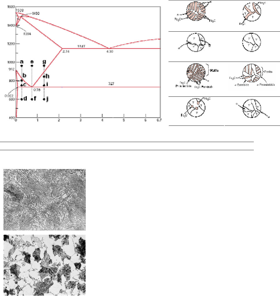 Exercícios- Diagramas QUESTÃO 1) A partir dos seus conhecimentos sobre diagramas de fases Ferro-Cementita (Fe- Fe3C) e o desenvolvimento microestrutural em ligas Ferro-Carbono, relacione as microestruturas esperadas e determine, além da classificação do aço, uma possível liga para as micrografias apresentadas. 1 2 3 4 5 6 7 8 RESPOSTA: a b c d e f g h i j ___ ___ ___ ___ ___ ___ ___ ___ ___ ___ 500 X Picral 5%, 10s Lamelas de ferrita e Cementita. Possível Classificação:___________________________ Possível Liga: ___________________________ 635 X Perlita e Ferrita Proeutetóide Possível Classificação:___________________________ Possível Liga: ___________________________ 1000 X Colonias de Perlita e Rede de Cementita proeutetóide (branca) Possível Classificação:___________________________ Possível Liga: ___________________________ QUESTÃO 2) Usando o diagrama de transformação isotérmica para o aço AISI 1045, fornecido abaixo, determine a microestrutura final de uma amostra que foi submetida aos tratamentos tempo-temperatura abaixo. Para cada caso, suponha que a amostra se encontra inicialmente a uma temperatura de 845 o C e que ela tenha sido mantida nesta temperatura tempo suficiente para a completa austenitização. (a) Resfriamento rápido até 250 oC, manutenção nessa temperatura por 103 s, e então têmpera até a temperatura ambiente. (b) Resfriamento rápido até 700 oC, manutenção nessa temperatura por 30 s, e então têmpera até a temperatura ambiente. (c) Resfriamento rápido até 400 oC, manutenção nessa temperatura por 500 s, e então têmpera até a temperatura ambiente (d) Resfriamento rápido até 700 oC, manutenção nessa temperatura por 105 s, e então têmpera até a temperatura ambiente. (e) Resfriamento rápido até 650 oC, manutenção nessa temperatura por 3 s, resfriamento rápido até 400 o C, manutenção nesta temperatura por 10 s, e então têmpera até a temperatura ambiente (f) Resfriamento rápido até 450 oC, manutenção nessa temperatura por 10 s, e então têmpera até a temperatura ambiente. (g) Resfriamento rápido até 625 oC, manutenção nessa temperatura por 1 s, e então têmpera até a temperatura ambiente (h) Resfriamento rápido até 625 oC, manutenção nessa temperatura por 10 s, resfriamento rápido até 400 o C, manutenção nesta temperatura por 5 s, e então têmpera até a temperatura ambiente. QUESTÃO 3) Qual é a estrutura mais estável, a perlítica ou a da cementita globulizada? Por que? QUESTÃO 4) Citar duas diferenças principais que existem entre as transformações martensítica e perlítica. QUESTÃO 5) O que é um tratamento termoquímico? Citar suas principais vantagens em relação aos tratamentos térmicos. QUESTÃO 6) Conceituar: cementação, nitretação, carbonitretação e boretação. Explicar como podem ser feitas.