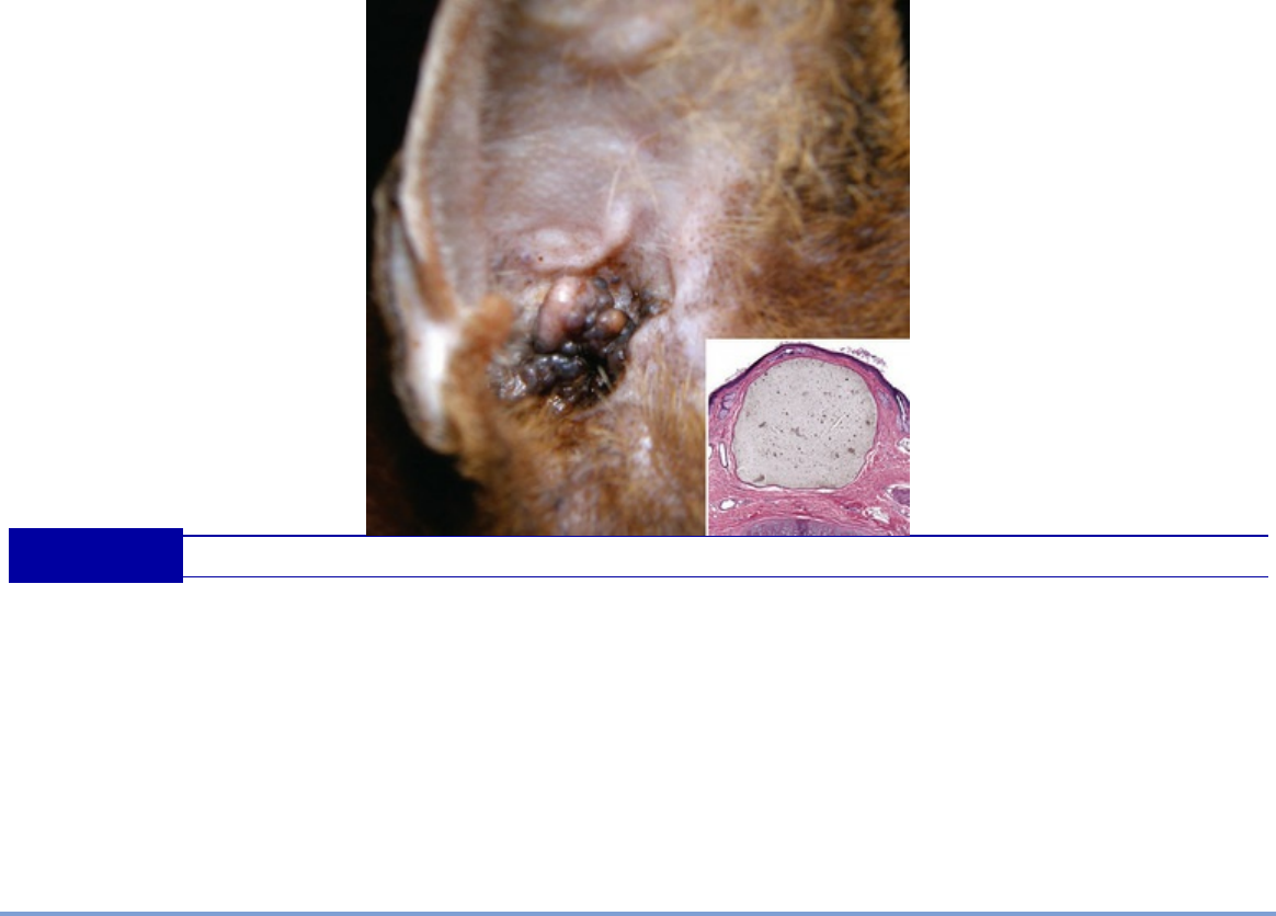 Fig. 20-54 Cistomatose ceruminosa felina, aurícula, gato Abyssinian. A, Nódulos múltiplos cinza-escuros, azuis ou pretos, se estendendo a partir da superfície côncava da aurícula são característicos da cistomatose ceruminosa felina, uma dilatação cística e hiperplasia das glândulas ceruminosas. B, Células epiteliais escamosas achatadas revestem a superfície do cisto. O lúmen está cheio de cerume cinza. Coloração H&E. (A cortesia de B. Moyes e do Dr. B. Milleson, Briarglen Veterinary Clinic, Tulsa, OK; B cortesia de Dr. B.L. Njaa, Center for Veterinary Health Sciences, Oklahoma State University.) Olho Devido à sua localização anatômica superficial e à transparência de seu polo anterior, o olho é o único órgão capaz de ser examinado diretamente em grande detalhe pelo clínico. Como resultado, a avaliação das lesões macroscópicas do olho é realmente da alçada do médico clínico e, principalmente, do clínico oftalmologista. A terminologia da patologia oftálmica é idêntica à utilizada na oftalmologia clínica, que infelizmente é complexa e aparentemente desenvolvida para intimidar qualquer um, exceto os mais determinados. O exame do bulbo do olho é realmente uma análise de post mortem em menores proporções. O desenvolvimento embrionário, as reações gerais às lesões e doenças específicas diferem entre a córnea, úvea e retina da mesma maneira que diferem entre o pulmão, fígado e rim. Portanto, é de praxe considerar as doenças dos olhos como uma série de tópicos relativamente separados, definidos por meio da porção anatômica do olho em questão. Certamente, existem doenças que acometem o olho como um todo, mas são a minoria. O bulbo do olho de todos os mamíferos adultos tem uma anatomia geral similar, 3189 representada na Figura 20-55. Trata-se de uma câmera biológica esférica com uma elaborada lente de foco automático que deriva do ectoderma superficial e uma placa de filme absorvente de luz (retina) criada por um crescimento de neurônios especializados para fora do cérebro. Todas as outras estruturas no interior e ao redor do bulbo do olho estão lá simplesmente para assegurar o funcionamento ideal da córnea, do cristalino e da retina. Fig. 20-55 Diagrama esquemático da anatomia do olho. (Modificado de Kumar V, Abbas AK, Fausto N: Robbins & Cotran pathologic basis of disease, 7ª ed, Filadélfia, 2005, Saunders; e Slatter D: Fundamentals of veterinary ophthalmology, 3ª ed, Philadelphia, 2001, Saunders.) O olho se desenvolve como um tentáculo de tecido cerebral que alcança a região externa logo abaixo da pele superficial do embrião em desenvolvimento. O propósito do olho é reunir informações sensoriais na forma de fótons de luz, que são absorvidos por neurônios especificamente adaptados para converter a luz em energia elétrica. Para facilitar o acesso desses fótons aos neurônios fotossensíveis da retina, o ectoderma superficial, que normalmente formaria a pele comum, sofre um processo de diferenciação especializada, dando origem à córnea e ao cristalino à medida que o tentáculo de tecido cerebral se aproxima dessa superfície. Mais detalhes sobre essa embriogênese serão discutidos em seções posteriores deste capítulo. Os detalhes da anatomia ocular podem ser encontrados em qualquer livro de histologia; contudo, existem algumas características específicas que são particularmente relevantes para a patologia ocular. Algumas das características mais 3190 importantes estão enfatizadas a seguir: 1. O bulbo do olho é uma esfera selada e preenchida por fluido, que está protegida das influências nocivas por meio de uma órbita óssea, pálpebras móveis, uma estrutura externa espessa e fibrosa de córnea e esclera, e uma série de junções ocludentes epiteliais e vasculares no interior da úvea e retina, referida como barreira hemato-ocular. 2. Embora a anatomia e a fisiologia do bulbo do olho sirvam para protegê-lo das inúmeras lesões que afetam outras partes do corpo, esses mesmos aspectos únicos o tornam extremamente suscetível à propagação da lesão, uma vez que suas defesas tenham sido superadas. O meio fluido no interior do bulbo do olho permite a difusão de agentes infecciosos e dos mediadores químicos da inflamação por todo o bulbo do olho. Os mesmos mecanismos de defesa que previnem a entrada de vários tipos de agentes biológicos ou químicos também impedem a drenagem dos metabólitos nocivos sintetizados na lesão e inflamação tecidual. 3. Para uma função visual adequada, requer-se que a precisa relação anatômica entre as partes constituintes do bulbo do olho seja mantida. Pequenas mudanças nessa relação, que seriam insignificantes na maioria dos outros tecidos, podem ter resultados devastadores no interior do órgão. Exemplos comuns incluem a cegueira resultante de um acúmulo mínimo de exsudato seroso atrás da retina (deslocamento seroso da retina), ou o acúmulo de fluido de edema no interior da córnea, que altera significativamente sua clareza até o ponto de causar cegueira. Muitos dos tecidos críticos dentro do bulbo do olho não suportam nem as mínimas mudanças associadas à inflamação ou à reparação da ferida, as quais, em outros tecidos, seriam insignificantes. 4. A maioria dos tecidos visualmente críticos do interior do bulbo do olho tem uma capacidade regenerativa insignificante. Alguns, como a retina adulta, são essencialmente pós-mitóticos e não têm a menor capacidade de se regenerar. Outros, tais como o cristalino e a córnea, apresentam uma capacidade de regeneração limitada, contudo ela nunca recria uma réplica estrutural ou funcional perfeita do tecido original. Muitas das lesões intraoculares significativas estão relacionadas a eventos de reparação da ferida (proliferação epitelial, angiogênese e fibrose), que são eventos desejáveis na maioria dos tecidos, mas que causam graves deficiências funcionais no bulbo d