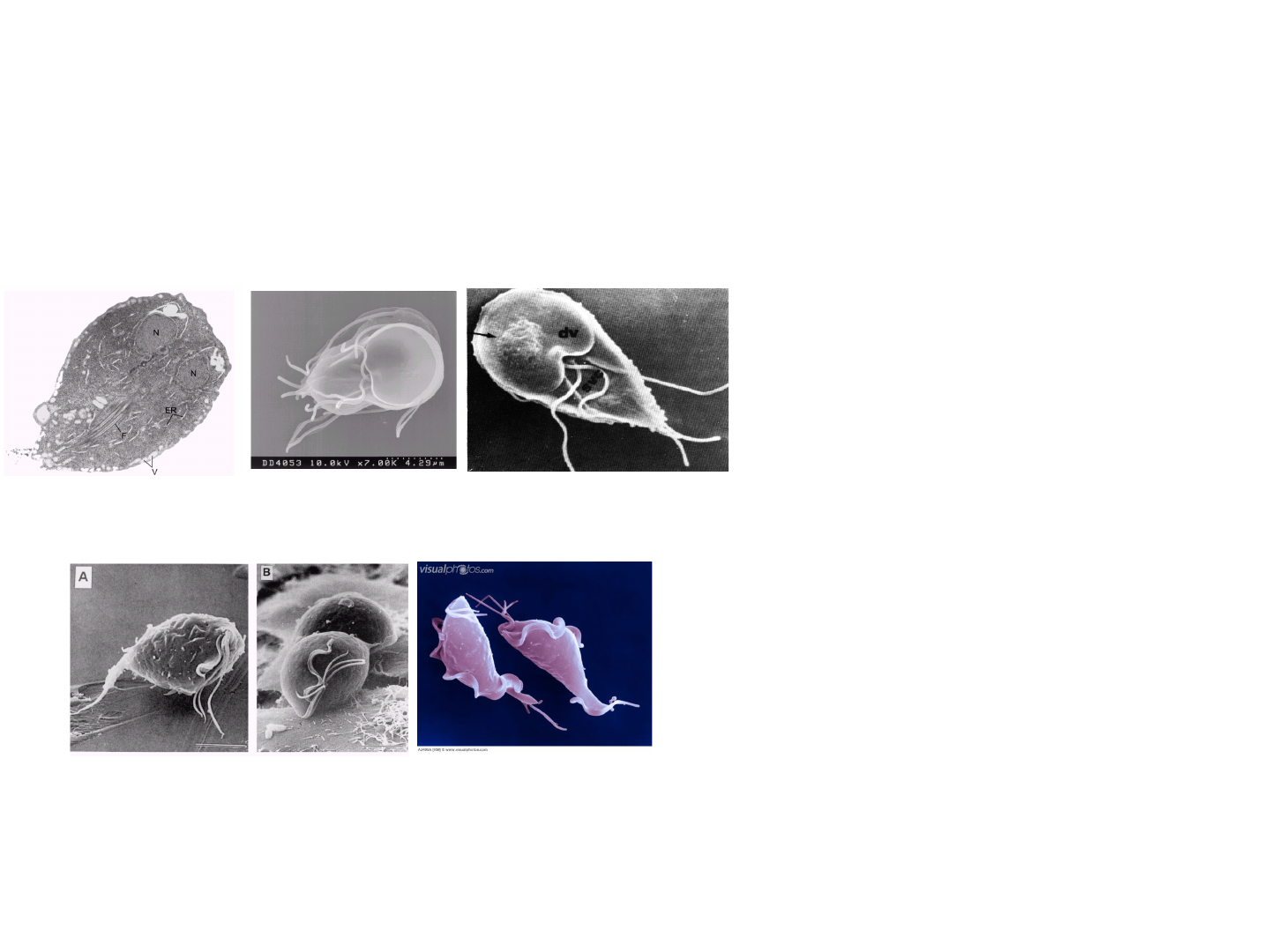 Filo: Sarcomastigophora - Gênero Giardia - Gênero Trichomonas Ordem Diplomonadida: Corpo com simetria bilateral; um a quatro pares de flagelos; cistos presentes; Subordem Diplomonadina: dois corpos parabasais Ordem Trichomonadida: tipicamente com 4-6 flagelos, um deles formando membrana ondulante; presença de corpo parabasal Classificação Protozoários flagelados - espécies patogênicas: Giardia lamblia (Giardíase) Trichomonas vaginalis (Tricomoníase) Flagelados das Vias Digestivas e Geniturinárias CDC parasitology Microscopia eletrônica de varredura da superfície ventral de trofozoíto de Giardia lamblia Photo courtesy of David Dorward, Rocky Mountain Laboratory, National Institutes of Health, Hamilton Giardia lamblia Ø A giardíase é uma parasitose intestinal mais frequente em crianças do que em adultos e que tem como agente etiológico a Giardia lamblia. Infecção por protozoários que atinge, principalmente, a porção superior do intestino delgado. Ø A infecção sintomática pode apresentar-se de forma aguda com diarréia, acompanhada de dor abdominal (enterite aguda) ou de natureza crônica, caracterizada por fezes amolecidas, com aspecto gorduroso, fadiga, anorexia, flatulência e distensão abdominal. Ø Anorexia, associada com má absorção, pode ocasionar perda de peso e anemia. Não há invasão intestinal. Giardia lamblia 6 Giardia apresenta duas formas evolutivas: • trofozoíto: formato de pêra, com simetria bilateral e mede 20pm de comprimentopor 10pmde largura - quatro pares de flagelos • cisto: oval (12/8 uM) - dois ou quatro núcleos. Forma infectante encontrada no ambiente Giardia Lamblia Morfologia Reservatório - O homem e alguns animais domésticos ou selvagens, como cães, gatos e castores. Modo de transmissão - Fecal-oral. Direta, pela contaminação das mãos e consequente ingestão de cistos existentes em dejetos de pessoa infectada; ou indireta, por meio da ingestão de água ou alimento contaminado. Período de incubação - De 1 a 4 semanas, com média de 7 a 10 dias. Período de transmissibilidade - Enquanto persistir a infecção. Complicações - Síndrome de má absorção Giardia Lamblia Giardia Lamblia - Ciclo Biológico Diagnóstico - Identificação de cistos ou trofozoítos, no exame direto de fezes, pelo método de Faust; ou identificação de trofozoítos no fluido duodenal, obtido através de aspiração. São necessárias, pelo menos, três amostras de fezes para obter uma boa sensibilidade. A detecção de antígenos pode ser realizada pelo Elisa, com confirmação diagnóstica. Secretaria de Vigilância em Saúde / MS Giardia Lamblia Profilaxia - Medidas de higiene pessoal. -Educação sanitária, -lavar as mãos após o uso do banheiro, -Filtração da água potável. Saneamento. *Isolamento — Pessoas com Giardíase devem ser afastadas do cuidado de crianças. Com pacientes internados, devem ser adotadas precauções entéricas, com a adoção de medidas de desinfecção concorrente para fezes e material contaminado; controle de cura: feito com o exame parasitológico de fezes, negativo no 7º, 14º e 21º dias após o término do tratamento. Tratamento Giardia Lamblia Família Trichomonadidae, da ordem Trichomonadida, da do filo Sarcomastigophora. Dentre as espécies presentes no homem, a de maior importância clinica é o Trichomonas vaginalis. Como todos os Tricomonadídeos, não possui a forma cística, somente a trofozoítica. Trichomonas vaginalis e Tricomoníase Trichomonas 10-30 um comp x 5-12 um largura Alongado, ovóide ou piriforme • Membrana ondulante • Alongado, ovóide ou piriforme • 10-30 um comprimento x 5-12 um largura • Núcleo elipsóide com dupla membrana podendo se observar um nucléolo pequeno • Hidrogenossomos (grânulos densos) Trichomonas vaginalis e Tricomoníase Local da Infecção O T. vaginalis habita o trato genitourinário do homem e da mulher, onde produz a infecção e não sobrevive fora do sistema urogenital. v Organismo anaeróbio facultativo. Cresce perfeitamente bem na ausência de oxigênio. v Desprovido de mitocôndrias (faz uso da enzima piruvato ferredoxina- oxidorredutase (PFOR) Piruvato - Acetato - ATP). Transmissão v Sexual - Homem é o vetor: com a ejaculação, os tricomonas presentes na mucosa da uretra são levados a vagina pelo esperma. • A tricomoníase neonatal em meninas é adquirida durante o parto. • É responsável por cerca de 10 a 15% das DSTs em países desenvolvidos. v Complicações: Promove a transmissão do HIV; é causa de baixo peso, bem como de nascimento prematuro; predispõe mulheres a doença inflamatória pélvica atípica, câncer cervical e infertilidade. • Infertilidade é quase duas vezes maior em mulheres com história de tricomoníase comparado com as que nunca tiveram tal infecção. Trichomonas vaginalis e Tricomoníase T. vaginalis em cultura e na superfície de células epiteliais da vagina antes da transformação amebóide 1 6 STI estimates, WHO, 2008. Epidemiologia: Estimativa de incidência global de doenças sexualmente transmissíveis em 2005 e 2008 (milhões de casos) A tricomoníase é a DST não-viral mais comum no mundo. Trichomonas vaginalis e Tricomoníase Trichomonas vaginalis Ciclo Biológico Diagnóstico • Clínico e anamnese • Parasitológico –Encontro do parasito no corrimento (mulher), secreção prostática ou urina (homem); • Imunológico – IFI • Colpocitologia –Preparação a fresco ou corada (Papanicolaou ou Shorr). • Molecular –Tem sido implementado e revelado maior acurácia. Tratar Tricomoníase · Metronidazol 2 g, VO, dose única, · Tinidazol 2 g, VO, dose única; · Metronidazol 500 mg, VO, de 12/12 horas, por 7 dias; · Secnidazol 2 g, VO, dose única. v Gestantes: tratar somente após completado o primeiro trimestre com Metronidazol 2 g, VO, dose única. Profilaxia: – Use sempre camisinha durante as relações sexuais – Evite ter múltiplos parceiros (as). – Evite rela