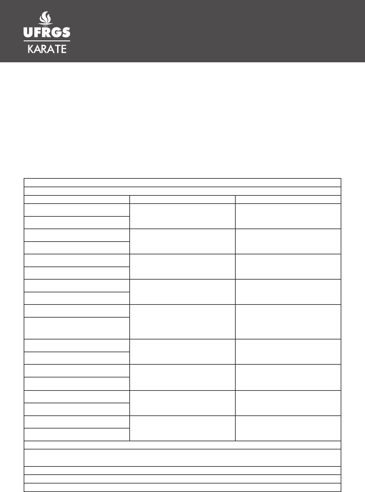 UNIVERSIDADE FEDERAL DO RIO GRANDE DO SUL Núcleo de Apoio à Educação à Distância - NAPEAD UFRGS Curso de Extensão em Karate-Dō UFRGS Professor Mestre Tiago Oviedo Frosi - 3º Dan JKS - CREF 16973-G/RS 4º kyu é entregue àqueles que aprimoraram as mais básicas técnicas de Karate e estão próximos de desenvolver a maturidade do controle sobre seu corpo. A cor da faixa é roxa, e assim como o galho liga as flores e folhas ao tronco, esta faixa representa um estágio intermediário mais próximo do cerne do treinamento que ocorre nos estágios Dan. 4º Kyu (四級) Faixa Roxa (紫帯) 4º Kyu (四級) Kihon (基本) Postura Exercício Tipo de passo Gedan-gamae Chûdan Oi-Zuki (中段追突) Ayumi (avança) Zenkutsu dachi Gedan-gamae Jôdan Ageuke, Gyaku Zuki (上段上げ受, 逆突) Sagate (recua) Zenkutsu dachi Gedan-gamae Chûdan Sotouke, Gyaku Zuki (中段外受, 逆突) Ayumi (avança) Zenkutsu dachi Shutô-gamae Shutou Uke (手刀受) Sagate (recua) Kokutsu dachi Gedan-gamae Gedan Barai (下段払い), Ne- koashi dachi (猫足立ち) Chûdan Uchiuke, Gyaku Zuki (中 段内受, 逆突) Ayumi (avança) Zenkutsu dachi Jiyu-na-gamae Mae Geri, Oizuki (前蹴, 追突) Ayumi (avança) Zenkutsu dachi Jiyu-na-gamae Mawashi-geri (廻蹴) Ayumi (avança) Zenkutsu dachi Kakiwake-gamae Yoko Keage (横蹴上) Ukimi-waza (passo lateral) Kiba dachi Kakiwake-gamae Yoko-kekomi (横蹴込) Ukimi-waza (passo lateral) Kiba dachi Kumite (三本組手) Kihon Ippon Kumite (基本一本組手) (Jôdan Oi-Zuki, Chûdan Oi-Zuki, Mae Geri, Yoko-geri, Mawashi-geri) Kata Heian Godan (平安五段) Junro Nidan (順路二段) UNIVERSIDADE FEDERAL DO RIO GRANDE DO SUL Núcleo de Apoio à Educação à Distância - NAPEAD UFRGS Curso de Extensão em Karate-Dō UFRGS Professor Mestre Tiago Oviedo Frosi - 3º Dan JKS - CREF 16973-G/RS KIHON Kihon Ippon Kumite (基本一本組手) (Jôdan Oi-Zuki, Chûdan Oi-Zuki, Mae Geri, Yoko-geri, Mawashi-geri) Nessa etapa, executa-se Chuudan Oizuki (中段追突), Joudan Ageuke, Gyaku Zuki (上段上げ受, 逆突), Chuudan Sotouke, Gyaku Zuki (中段外受, 逆突), Shutou Uke (手刀受), Gedan Barai (下段払い), Nekoashi dachi (猫足立ち), Chûdan Uchiuke, Gyaku Zuki (中段内受, 逆突), Gedan Barai, Gyaku Zuki (下段払い, 逆突), Mae Geri, Oizuki (前蹴, 追突), Mawashi Geri (廻蹴), Yoko Keage (横蹴上), Yoko Kekomi (横蹴込). UNIVERSIDADE FEDERAL DO RIO GRANDE DO SUL Núcleo de Apoio à Educação à Distância - NAPEAD UFRGS Curso de Extensão em Karate-Dō UFRGS Professor Mestre Tiago Oviedo Frosi - 3º Dan JKS - CREF 16973-G/RS Kihon Ippon Kumite UNIVERSIDADE FEDERAL DO RIO GRANDE DO SUL Núcleo de Apoio à Educação à Distância - NAPEAD UFRGS Curso de Extensão em Karate-Dō UFRGS Professor Mestre Tiago Oviedo Frosi - 3º Dan JKS - CREF 16973-G/RS Heian Godan (平安五段) Hachinojidachi Shizentai (Yoi) 1 Uchi-uke Kokutsu-dachi Chudan 2 Gyaku-zuki Kokutsu-dachi Chudan 4 Uchi-uke Kokutsu-dachi Chudan 5 Gyaku-zuki Kokutsu-dachi Chudan 3 Mizu-nagare-no-kamae Heisoku-dachi UNIVERSIDADE FEDERAL DO RIO GRANDE DO SUL Núcleo de Apoio à Educação à Distância - NAPEAD UFRGS Curso de Extensão em Karate-Dō UFRGS Professor Mestre Tiago Oviedo Frosi - 3º Dan JKS - CREF 16973-G/RS 7 Morote-uke Kokutsu-dachi Chudan 8 Ryoken-kosa-uke (Ryoken-juji-uke) Zenkutsu-dachi Gedan 9 Kaisho-kosa-uke (Ryosho-juji-uke) Zenkutsu-dachi Jodan 10 Ryosho-juji-osae-uke Zenkutsu- dachi Chudan 11 Tsuki (uke zuki) Zenkutsu-dachi Chudan 6 Mizu-nagare-no-kamae Heisoku-dachi UNIVERSIDADE FEDERAL DO RIO GRANDE DO SUL Núcleo de Apoio à Educação à Distância - NAPEAD UFRGS Curso de Extensão em Karate-Dō UFRGS Professor Mestre Tiago Oviedo Frosi - 3º Dan JKS - CREF 16973-G/RS 12 Oi-zuki Zenkutsu-dachi Chudan 15 Mikazuki-geri Ashi-dachi Chudan 16 Mae-empi-uchi Kiba-dachi Chudan 17 Morote-uke Kosa-dachi Chudan 13 Gedan-barai Gedan Fumikomi 14 Kake-uke Kiba-dachi Chudan UNIVERSIDADE FEDERAL DO RIO GRANDE DO SUL Núcleo de Apoio à Educação à Distância - NAPEAD UFRGS Curso de Extensão em Karate-Dō UFRGS Professor Mestre Tiago Oviedo Frosi - 3º Dan JKS - CREF 16973-G/RS 19 Ryoken-kosa-uke (Ryoken-juji-uke) Kosa-dachi Gedan Tobikomi (Tobi) 20 Morote-uke Zenkutsu-dachi Chudan 21 Soto-nagashi-uke / shuto-uchikomi uchi-uke / gedan-uke (manji-uke) Ashi- zenkutsu / Kokutsu-dachi Jodan / Gedan / Jodan/ Gedan 18 Koho-tsukiage Renoji-dachi Jodan UNIVERSIDADE FEDERAL DO RIO GRANDE DO SUL Núcleo de Apoio à Educação à Distância - NAPEAD UFRGS Curso de Extensão em Karate-Dō UFRGS Professor Mestre Tiago Oviedo Frosi - 3º Dan JKS - CREF 16973-G/RS 23 Soto-nagashi-uke / shuto-uchikomi e uchi-uke / gedan-uke (manji-uke) Ashi-zenkutsu / Kokutsu-dachi Jodan / Gedan / Jodan/ Gedan22 Jotai-sonomama (Manji-kamae) Heisoku-dachi Hachinojidachi Shizentai (Yame) UNIVERSIDADE FEDERAL DO RIO GRANDE DO SUL Núcleo de Apoio à Educação à Distância - NAPEAD UFRGS Curso de Extensão em Karate-Dō UFRGS Professor Mestre Tiago Oviedo Frosi - 3º Dan JKS - CREF 16973-G/RS Junro Nidan (順路二段) 2 Hidari zenkutsu dachi, migi gyaku zuki to hidari uchi-uke (simultâneo) 3 Kiba dachi, chudan tetsui uchi 4 Hidari zenkutsu dachi, hidari muchiken gedan uke 5 Hidari neko ashi dachi, migi gedan barai hachinojidachi shizentai (yoi) 1 Migi neko ashi dachi, hidari gedan barai UNIVERSIDADE FEDERAL DO RIO GRANDE DO SUL Núcleo de Apoio à Educação à Distância - NAPEAD UFRGS Curso de Extensão em Karate-Dō UFRGS Professor Mestre Tiago Oviedo Frosi - 3º Dan JKS - CREF 16973-G/RS 6 Migi zenkutsu dachi, hidari gyaku zuki to migi uchi-uke (simultâneo) 8 Migi zenkutsu dachi, migi muchiken gedan uke 9 Hidari zenkutsu dachi, migi gyaku zuki to hidari gedan barai (simultâneo) 10 Migi zenkutsu dachi, hidari gyaku zuki to migi gedan barai (simultâneo) 11 Hidari zenkutsu dachi, heiko muchiken zuki 7 Kiba dachi, chudan tetsui uchi UNIVERSIDADE FEDERAL DO RIO GRANDE DO SUL Núcleo de Apoio à Educaç