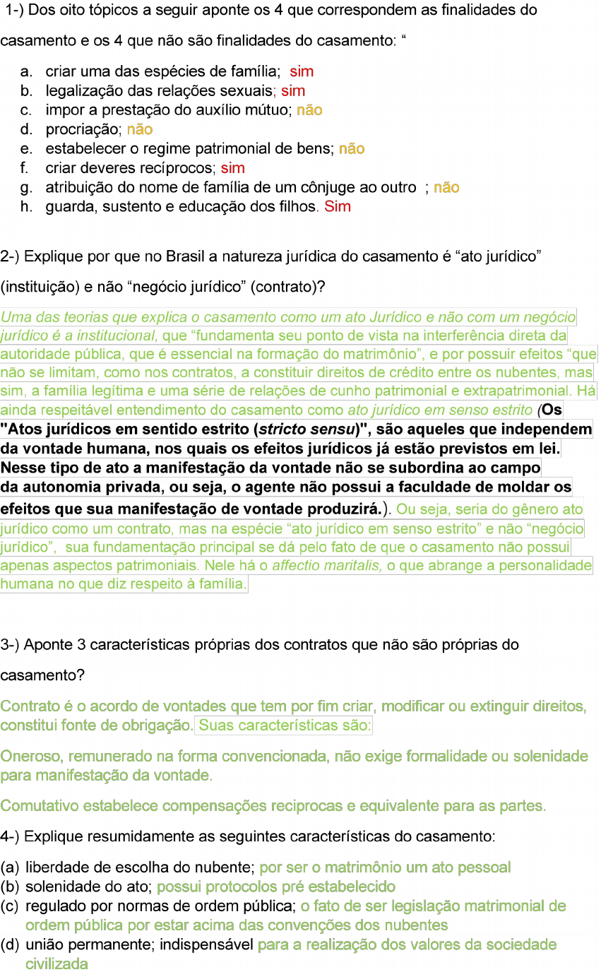 1-) Dos oito tópicos a seguir aponte os 4 que correspondem as finalidades do casamento e os 4 que não são finalidades do casamento: “ a. criar uma das espécies de família; sim b. legalização das relações sexuais ; sim c. impor a prestação do auxílio mútuo; não d. procriação; não e. estabelecer o regime patrimonial de bens; não f. criar deveres recíprocos; sim g. atribuição do nome de família de um cônjuge ao outro ; não h. guarda, sustento e educação dos filhos . Sim 2-) Explique por que no Brasil a natureza jurídica do casament o é “ato jurídico” (instituição) e não “negócio jurídico” (contrato)? Uma das teorias que explica o casamento como um ato Jurídico e não com um negócio jurídico é a institucional, que “fundamenta seu ponto de vista na interferência direta da autoridade pública, que é essencial na formação do matrimônio”, e por possuir efeitos “que não se limitam, como nos contratos, a constituir direitos de crédito entre os nubentes, mas sim, a família legítima e uma série de relações de cunho patrimonial e extrapatrimonial. Há ainda respeitável entendimento do casamento como ato jurídico em senso estrit o (Os "Atos jurídicos em sentido estrito (stricto sensu)", são aqueles que independem da vontade humana, nos quais os efeitos jurídicos já estão previstos em lei. Nesse tipo de ato a manifestação da vontade não se subordina ao campo da autonomia privada, ou seja, o agente não possui a faculdade de moldar os efeitos que sua manifestação de vontade produzirá .). Ou seja, seria do gênero ato jurídico como um contrato, mas na espécie “ato jurídico em senso estrito” e não “negócio jurídico”, sua fundamentação principal se dá pelo fato de qu e o casamento não possui apenas aspectos patrimoniais. Nele há o affectio maritalis, o que abrange a personalidade humana no que diz respeito à família . 3-) Aponte 3 características próprias dos contratos que não são próprias do casamento? Contrato é o acordo de vontades que tem por fim criar, modificar ou extinguir direitos, constitui fonte de obrigação. Suas características são: Oneroso, remunerado na forma convencionada, não exige formalidade ou solenidade para manifestação da vontade. Comutativo estabelece compensações reciprocas e eq uivalente para as partes. 4-) Explique resumidamente as seguintes características do casamento: (a) liberdade de escolha do nubente; por ser o matrimônio um ato pessoal (b) solenidade do ato; possui protocolos pré estabelecido (c) regulado por normas de ordem pública; o fato de ser legislação matrimonial de ordem pública por estar acima das convenções dos nubentes (d) união permanente; indispensável para a realização dos valores da sociedade civilizada