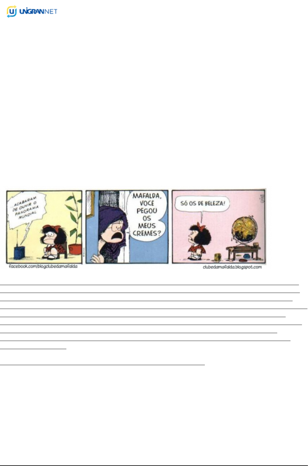 GABARITO Protocolo: 639805 Página 1 - 27/03/2020 às 09:56 Prova Data de aplicação: 09/03/2020 Curso: Pedagogia Disciplina: Leitura e Produção de Texto II Ano: 20201 / Semestre: 2 RGM: 053.19632 / Aluno: NISSELENE MENDES PROVA 01 Questão 1 Observe a tira de Mafalda e produza um parágrafo interpretativo . Nas tiras, em geral, o humor e a crítica sempre estão presentes. Não deixe de abordar esses dois itens. Resposta do aluno: No primeiro Quadro, tem se a imagem de um aparelho sonoro, O texto verbal do primeiro quadro é emitido pela mãe de mafalda, é proveniente de uma emissora de rário, representa a fafa do mundo, poluição sonora que não desperta a atenção de Mafalda, que está preocupada em fazer uso dos cremes de beleza da mãe. Mafalda faz uso dos cremes de beleza da mãe para ficar tão bonita quanto ela, porque diante da má aparência da mãe observa que eles não fazem efeito sobre esta. Ela acredita que eles tem piorado a aparência da mãe. No terceiro quadro sobre a mesa, tem um globo terrestre, O velho globo terrestre tem uma aparência rejuvenecida. A partir da tirinha em questão, é possivel afirmar que a personagem Mafalda demonstra descaso com os problemas do mundo e sim com as noticias que acaba de ouvir, é uma criança vaidosa e desobediente. Parecer do professor: Qual a crítica? E o humor? Reveja o conteúdo da tira. Questão 2 Leia o texto a seguir e elabore um resumo (principais ideias). Lembre-se de que o resumo deve ser feito com suas palavras. A escrita é parte da avaliação. CAPITAL HUMANO Reinaldo Gomes* 1 Nunca em todo período da história houve demanda tão elevada por profissionais qualificados. Também nunca foi tão difícil manter esses profissionais dentro das corporações. Eles agregam valores às empresas e são considerados o principal capital. 2 Porém, essa visão ainda faz parte de um grupo seleto. A maioria dos gestores, até o momento, não enxergou o valor desse capital humano e trata com desdém esse assunto. Muitos GABARITO Protocolo: 639805 Página 2 - 27/03/2020 às 09:56 executivos atribuem o sucesso profissional à sua capacidade de escolher a pessoa certa para atuar no seu grupo. O sucesso de outros executivos deve-se à capacidade de manter sua equipe ordenada e produzindo harmoniosamente. 3 De fato, é muito difícil escolher a pessoa certa. Às vezes, você se depara com situações muito complicadas quando, por exemplo, um amigo está precisando de uma recolocação no mercado. Você sabe que aquele profissional não é a pessoa certa para atuar na sua equipe, mas, por outro lado, você é posto no paredão por si próprio e expõe a dúvida no ar: se eu posso ajudar o amigo, por que não dar uma chance? Por que não ajudar e tentar torná-lo o profissional ideal para a equipe, treinando-o e reciclando seus conhecimentos? Mas, não é bem assim que as coisas funcionam. Às vezes, a amizade é confundida com a hierarquia e, quando você tem de chamar a atenção por qualquer motivo, sua atitude não é bem aceita e a amizade começa a ser posta em jogo. Existe um velho ditado que se encaixa perfeitamente: "Amigos, amigos, negócios à parte". 4 O time deve atuar satisfeito, harmonioso e bem recompensado. De fato, quando você vê publicações sobre as melhores empresas para trabalhar, um dos itens avaliados é a harmonia interna da equipe em relação ao resultado. Quem avalia a melhor empresa são os próprios funcionários e, se o ambiente de trabalho não é harmonioso, isso recai sobre a empresa. Para chegar ao estágio de satisfação, houve primeiro a seleção da equipe. Não importa qual seja o seu negócio, seu produto, sua estratégia ou seu serviço, tudo é feito por pessoas que têm de ser escolhidas a dedo. 5 Quanto maior for o nível de qualificação profissional, maior é a produtividade, melhor é a qualidade e menor é o custo dos produtos e serviços gerados.Vem agora a parte também difícil: a manutenção de tudo isso. Para manter os bons profissionais, as pequenas e médias empresas oferecem em primeiro lugar, benefícios; em segundo, vem a remuneração e, por último, investem em treinamento. Já as grandes - entenda, nem todas são assim- trazem, num pacote, só os benefícios, a remuneração e os treinamentos. Palavras como satisfação, motivação e reconhecimento fazem parte do vocabulário da área chamada de gestão de pessoas. *Especialista em gestão corporativa e de pessoas e economia. (Estado de Minas- 1º de Janeiro de 2011- Caderno Opinião- p. 9 ). Resposta do aluno: O autor Reinaldo Gomes se refere ao texto da forma a indagar a elevada demada para com os profissionais qualificados, por assim dizer e ressaltar os seus valores e a dificuldade de tê-los nas empresas. Mais isso nao é considerado como uma opinião geral sendo que alguns executivos pensam que o sucesso profissional visa na escolha certa do profissional, sendo que nem toda pessoa serve para o cargo, mesmo sendo algué próximo, isso pode influenciar no trabalho por ter que tomar algumas medidas que nao serao bem vistas por conta da amizade que ali se instiui. Também se ressalta o ambiente de trabalho como sendo um local de bem estar para que haja produtividade. O texto menciona a escolha certa dos profissionais para que se tenhaum bom negocio, sendo que os mesmos tenham que ter uma boa qualificação. Exibindo as dificuldades de todo contexto seria a manutençao do mesmo incliindo os beneficios, remuneração e o investimento em treinar esses profissionais. Questão 3 Em relação à leitura, as afirmações abaixo estão corretas, exceto: a) Para se ensinar a ler um texto e compreendê-lo, faz-se necessário lidar com o conhecimento prévio do aluno, ou seja, tudo o que aprendeu ao longo de sua existência. b) O peso da bagagem cultural que o indivíduo carrega é fator relevante na compreensão de textos. c) Há três componentes no processo de composição de um texto: o linguístico, o enciclopédico e o