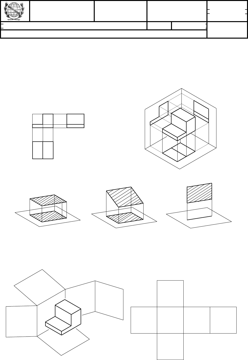 “No desenho técnico, as representações gráficas obtidas através da projeção (cilindrica) ortogonal do objeto nos planos de projeção, corresponderão às três vistas ortográficas principais. → A projeção no plano vertical (π’) corresponde à vista de frente ou frontal. → A projeção no plano horizontal (π) corresponde à vista de cima ou superior. → A projeção no plano de perfil (π”) corresponde à vista lateral esquerda. (π) (π’) (π”) Posições das figuras em relação a um plano de projeção. figura // ao plano figura ∠ ao plano figura ⊥ ao plano As três vistas ortográficas principais (frontal, superior e lateral esquerda) por vezes não conseguem esclarecer suficientemente a forma de objetos mais complexos. Além de outros recursos, pode-se aumentar o número de vistas para seis. LATERAL DIREITA FRONTAL INFERIOR SUPERIOR LATERAL ESQUERDA POSTERIOR F S LD I LE P COLÉGIO PEDRO II U. E. CENTRO NOME: Disciplina: DESENHO Professora: Berta Toste 2ª série Ensino Médio Nº Vistas Ortográficas TURMA: Apostila extra 3 Data: GABARITO (Apostila elaborada pela prof.ª M. Begoña Salgado Noval) Deve-se executar tantas vistas quantas forem necessárias à perfeita caracterização da forma de objetos; estas devem ser selecionadas conforme os seguintes critérios. a)A vista mais importante de um objeto deve ser utilizada como a vista frontal, contendo preferencialmente o comprimento da peça e/ou maior número de detalhes. b) Limitar ao máximo o número de vistas. c) Evitar vistas com repetição de detalhes. Leitura e interpretação: c Linhas � Para contornos e arestas visíveis: linha contínua e uniforme. � Para contornos e arestas não-vispiveis: linha tracejada e uniforme. � Eixo de simetria: linha traço e ponto e uniforme que indica que o objeto é simétrico, isto é, que pode ser dividido em duas partes iguais e opostas. c Ordem de prioridade de linhas coincidentes Se ocorrer coincidência, em projeção, de duas ou mais linhas de diferentes tipos, a representação será feita com a seguinte ordem de prioridade. j Arestas e contornos visíveis. k Arestas e contornos não visíveis. l Linhas de centro e eixos de simetria. 1. Represente as vistas ortográficas principais da peça abaixo representada pelo desenho isométrico. (α) (β) (δ) VISTA FRONTAL 1 0 3 0 53 10 20 15 VISTA FRONTAL 10 20 05 2 0 10 20 Lembre-se que as vistas ortográficas são do sistema cilíndrico. Não correspondem à nossa visão, que é cônica. Assim, o “olhar cilíndrico” é perpendicular ao plano de pro- jeção. Por isso, em cada vista só temos duas dimensões. As vistas são obrigatoriamente alinhadas. E as distâncias entre as vistas são congruentes. Observe que a vista frontal só apre- senta largura e altura, assim como a superior apresenta largura e pro- fundidade. E a vista lateral esquerda, profundidade e altura. EXERCÍCIOS: 15 10 10 10 10 20 10 2 0 1 0 VISTA FRONTAL As aresta visíveis são representadas por linhas contínuas e as arestas não-visíveis por linhas tracejadas. 2. Complete as lacunas de cada vista com as dimensões corretas. Atribua (A) para altura, (L) para largura e (P) para profundidade. VISTA FRONTAL ( ) ( ) ( ) ( ) ( ) ( )A A L L P P 3. Observe a peça representada no desenho isométrico e suas respectivas vistas. As construções foram feitas com linhas tracejadas para favorecer o contraste entre o exercício e sua resposta. Identifique nas vistas ortográficas principais as arestas destacadas no desenho isométrico. VISTA FRONTAL 4. Represente as vistas ortográficas principais da peça abaixo representada pelo desenho isométrico. Destaque a resposta com a lapiseira. VISTA FRONTAL 50 20 20 30 10 05 0 1 1 0 0 1 5. Analise as três vistas ortográficas principais e complete com as arestas que estão faltando. a) b) c) Atividades adaptadas do livro “ Desenho Técnico Básico”, Maria Teresa Miceli e Patricia Ferreira, Ed. Ao Livro Técnico. 1 5
