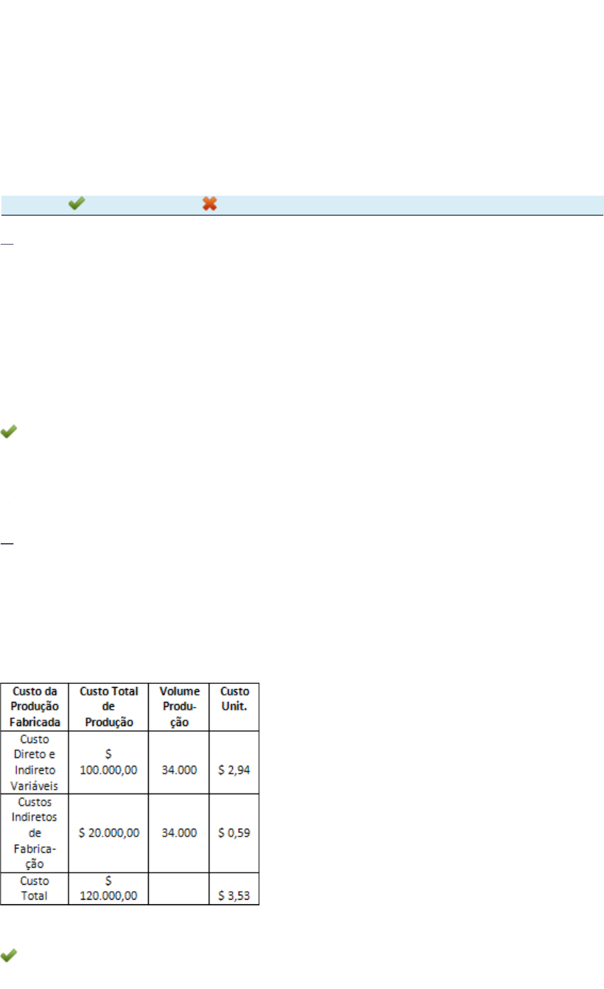 adêmico: Edimarcia Ricardo Pedroso (1299146) Disciplina: Gestão de Custos (EMD07) Avaliação: Avaliação Final (Objetiva) - Individual Semipresencial ( Cod.:637926) ( peso.:3,00) Prova: 15906602 Nota da Prova: 9,00 Legenda: Resposta Certa Sua Resposta Errada Parte superior do formulário 1. Analise os dados a seguir: * PIS/COFINS - 5% * COMISSÃO - 7,5% * ICMS - 17% * LUCRO - 18,5% * DEPRECIAÇÃO - 6% Assinale a alternativa que apresenta o valor aproximado do Mark-up divisor: a) O valor do Mark-up divisor é de 0,54. b) O valor do Mark-up divisor é de 0,46. c) O valor do Mark-up divisor é de 2,17. d) O valor do Mark-up divisor é de 1,85. 2. Analise os dados apresentados de uma empresa fictícia sobre sua estrutura de custos de fabricação. * Despesas administrativas gerais: R$ 7.500,00. * PIS/COFINS: 3,65%. * Margem de lucro: 25%. * ICMS: 15%. Assinale a alternativa que apresente o preço de venda pelo Método de Custeio por Absorção, para se obter 25% de margem de lucro: a) O preço de venda é de aproximadamente R$ 6,50. b) O preço de venda é de aproximadamente R$ 6,65. c) O preço de venda é de aproximadamente R$ 6,26. d) O preço de venda é de aproximadamente R$ 5,22. 3. Na gestão de custos, aplicada em todos os segmentos empresariais, é importante compreender o impacto do critério de rateio na composição dos custos dos produtos. Com base neste contexto, podemos afirmar que os custos a serem rateados são denominados de: a) Custos indiretos de fabricação. b) Embalagem utilizada no produto. c) Mão de obra indireta. d) Diretos e indiretos de fabricação. 4. As atividades nas empresas são corriqueiras e, no seu cotidiano, devem gerar resultados positivos para a mesma, com o objetivo de proporcionar a perpetuidade do seu negócio no mercado. A qualidade da informação gerada na área de custos está ligada ao Princípio da Confrontação, entre Despesas e Receitas. Desta forma, sobre as ações que são consideradas como receitas e despesas realizadas, classifique V para as sentenças verdadeiras e F para as falsas: ( ) Quando forem realizadas as operações com terceiros, quando ocorre o pagamento ou assumirem o compromisso de realizá-lo. ( ) Quando for liquidado um passivo, sem que ocorra a baixa ou a extinção de um ativo, mesmo que ocorra a correlação com a Reserva de Resultados gerada no período em análise da empresa. ( ) Quando da elaboração de novos ativos, mesmo que não exista a interferência de terceiros. ( ) Quando a empresa receber efetivamente doações de diversas espécies e subvenções governamentais. Assinale a alternativa que apresenta a sequência CORRETA: a) V - F - V - V. b) V - V - F - F. c) V - F - V - F. d) F - V - V - F. 5. As empresas na área industrial necessitam utilizar o método de custeio por absorção. Há a premissa de se reconhecer os custos variáveis da produção pelo seu consumo atribuído, e os custos fixos são reconhecidos por rateio. Para a apuração dos custos dos produtos, há a necessidade de agregar os custos variáveis e os custos fixos de fabricação (área industrial). Para a confecção de um tipo de camiseta, uma empresa possui os seguintes gastos associados aos respectivos setores: Quantidade produzida = 34.000 Quantidade vendida = 30.000 Preço de venda = R$ 7,50 CUSTO DA PRODUÇÃO: Algodão ? R$ 23.800,00 Poliéster ? R$ 18.700,00 Fios ? R$ 4.080,00 Salário das costureiras da fábrica ? R$ 20.400,00 Salário dos administradores ? R$ 15.000,00 Salário dos vendedores ? R$ 12.000,00 Aluguel da fábrica ? R$ 10.200,00 Energia elétrica da fábrica ? R$ 2.720,00 De acordo com o exposto, analise as sentenças a seguir: I- O valor do Estoque Final, pelo método de custeio por absorção, está apurado no valor de R$ 70.500,00. II- O valor do CPV (Custo dos Produtos Vendidos), pelo método de custeio por absorção, está apurado no valor de R$ 50.500,00. III- O valor do Estoque Final, pelo método de custeio por absorção, está apurado no valor de R$ 92.670,00. IV- O valor do CPV (Custo dos Produtos Vendidos), pelo método de custeio por absorção, está apurado no valor de R$ 70.500,00. Agora, assinale a alternativa CORRETA: a) Somente a sentença IV está correta. b) Somente a sentença I está correta. c) Somente a sentença II está correta. d) Somente a sentença III está correta. 6. Para que se faça uma boa gestão de custos, primeiramente é necessário que se compreenda quais são as características do que são os custos, as despesas, os gastos, entre outros. Assim, é possível separar e adequar os registros contábeis para que se apure os custos de forma correta. Também é primordial que se entenda e se aplique esses conceitos de maneira correta, pois assim é possível aprimorar os controles internos da empresa e assim evitar eventuais erros. Sobre o exposto, analise as afirmativas a seguir: I- Investimentos representam gastos que são ativados, constam no balanço patrimonial da empresa e ficam ali até o momento em que são utilizados ou consumidos, recebendo uma classificação como custos ou despesas. II- Os custos de uma organização são os gastos que foram consumidos no ambiente de fabricação de um produto ou serviço. III- As despesas da área financeira de uma organização são os gastos que foram gerados ou consumidos no ambiente de fabricação de um produto ou serviço. IV- Os gastos ou dispêndios consistem no sacrifício financeiro que a entidade arca para a obtenção de um produto ou serviço qualquer. Agora, assinale a alternativa CORRETA: a) As afirmativas I, III e IV estão corretas. b) As afirmativas II e III estão corretas. c) As afirmativas I, II e IV estão corretas. d) As afirmativas III e IV estão corretas. 7. Analise os dados apresentados de uma empresa fictícia sobre sua estrutura de custos de fabricação na tabela a seguir: * Despesas administrativas gerais: R$ 7.500,00. * PIS/COFINS: 3,65%. * Margem de lucro: 25%. * ICMS: 15%. Assinale a alterna