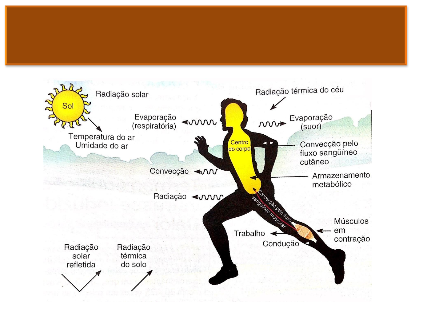 Termorregulação e exercício Termorregulação Controle da temperatura Ativação de enzimas Manutenção de estruturas proteicas Manutenção do metabolismo Controle cardíaco Equilíbrio térmico Hipotálamo Receptores térmicos Ponto de ajuste 37°C Aumento da temperatura Arteríolas da pele vasodilatação Glândulas sudoríparas vasodilatação Perda de calor Ramo simpático vasodilatador acetilcolina Redução do tônus simpático Equilíbrio térmico Hipotálamo Receptores térmicos Ponto de ajuste 37°C redução da temperatura Arteríolas da pele vasoconstricção Glândulas sudoríparas vasoconstricção Ganho de calor Musculatura Tremor Tremor Termogênese bioquímica Exercício Mecanismos de troca de calor Radiação Transferência de calor na superfície sob forma de raios infravermelhos ganho perda Transferência do sol pra terra Mecanismos de troca de calor Condução Transferência de calor entre corpos por contato Mecanismos de troca de calor Convecção Calor é transmitido para as moléculas de ar ou de água em contato com o corpo Moléculas se movem para longe do corpo Na água é 25x maior a perda de calor do que no ar na mesma temperatura Evaporação – principal meio de perda de calor - Calor transmitido do corpo para as gotículas de água sobre a superfície da pele - Ganho de calor suficiente = Evaporação Calor para longe do corpo Exercício Glândulas sudoríparas Sistema nervoso Secreção de Suor Principal meio de perda de calor durante o exercício 25% da perda durante o repouso Resfriamento Evaporação – fatores que favorecem a evaporação 1 temperatura e umidade relativa 2 correntes convectivas em torno do corpo 3 quantidade de superfície cutânea exposta ao meio ambiente Ambiente Ambiente Exercício - Ambiente quente e Úmido Umidade Evaporação Sensação Térmica mais elevada Dificuldade de dissipação do calor Hipertermia Exercício - Ambiente quente e Seco Umidade Evaporação Cuidados com Rápida desidratação Dificuldade de respiração – danifica vias aéreas Exercício com saco plástico emagrece?? Perda de Líquido UTILIZADO PARA ACLIMATAÇÃO NO CALOR Exercício em Ambiente extremamente quente e úmido Competição entre os vasos sanguíneos cutâneos e musculares Deficiência no Sistema Nervos Central Dificuldade de transmissão dos impulsos nervosos Maior Utilização de glicogênio câimbras FA D IG A M U SC U LA R VESTIMENTA – AMBIENTE QUENTE Folgada – Facilita a convecção Poliamida- Preferência Rápida absorção Tecidos secos Dificultam a evaporação Em ambientes com umidade favorável a evaporação, enxugar o corpo dificulta o esfriamento da pele !!! Leves – Possuem rápida absorção?? VESTIMENTA – AMBIENTE QUENTE Capacete especial - Facilita a Convecção Cabeça – Principal perda de calor Proteção contra traumatismo Aclimatação ao calor Aumento do volume plasmático – Menor FC Início precoce da sudorese – resfriamento mais rápido Produção de proteínas de choque térmico. Maior taxa de evaporação Sessões repetidas e prolongadas de exercício de baixa intensidade Temperatura corporal interna aumenta menos do que antes da aclimatação 9 a 14 dias, indivíduos treinados tempo menor ADH (VASOPRESSINA) Produção de metabólitos Atração de água para o espaço intersticial Termorregulação Atração de água para glândulas sudoríparas Redução do volume plasmático Liberação de ADH Reabsorção de água Antidiurese Evita desidratação Aldosterona Produção de metabólitos K+ Liberação de Aldosterona Retenção de sódio Reabsorção de água Excreção de Potássio Desidratação 1L de desidratação pelo suor – aumento de 8bpm na FC Diuréticos Maior perda de água do plasma Problemas cardiovasculares Maior perda de minerais Disfunção neuromuscular Exercício no frio Os mecanismos de produção de calor decorrentes do frio são insuficientes Envolve mudança de comportamento Ex: vestir agasalhos, buscar abrigo Equilíbrio térmico Hipotálamo Receptores térmicos Ponto de ajuste 37º c redução da temperatura Arteríolas da pela vasoconstricção Glândulas sudoríparas vasoconstricção Ganho de calor Musculatura Tremor Tremor Termogênese bioquímica Exercício Exercício no frio Mulheres e obesos levam vantagem na preservação de calor Gordura corporal Insulação Insulação: Resistência de troca de calor por meio de radiação, convecção e evaporação Idosos: diminuição de massa = sensíveis à hipotermia Respostas fisiológicas do Exercício no frio Músculos volumosos e Profundos Velocidade de encurtamento Potência muscular Altera o sistema neuromuscular - padrão de recrutamento de fibras musculares Suprimento contínuo de fluxo sanguíneo: se mantêm aquecidos Respostas fisiológicas do Exercício no frio Convecção Vestimenta Poder de resfriamento maior risco de congelamento dos tecidos Deve aprisionar massa de ar quente Roupas largas Facilitam Convecção Algodão: Boa absorção, baixa evaporação. Aumenta a temperatura em demasia durante o exercício Esfria pós-exercício: Calafrio Respostas fisiológicas do Exercício no frio Aclimatação Metabolismo acelerado Maior vasoconstricção periférica Associado à mudanças comportamentais favorece o emagrecimento Respostas fisiológicas do Exercício no frio Riscos Água: Condutividade 26 vezes maior do que o ar Hipotermia Perda de calor quatro vezes mais rápida 23,9 e 27,8 graus são apropriadas para treinos e competições • Porque um aumento da temperatura central representa uma ameaça a vida? • Descreva o papel do hipotálamo no controle da temperatura. Cite um exemplo de resposta eferente ao frio e um ao calor • Quais são os meios de troca de calor? • um ambiente quente e úmido gera facilidade ou dificuldade na perda de calor? Por quê? • Um judoca resolve fazer um aquecimento em uma sauna quente e úmida 10min antes da luta. Comente sobre a estratégia do judoca explicando fisiologicam