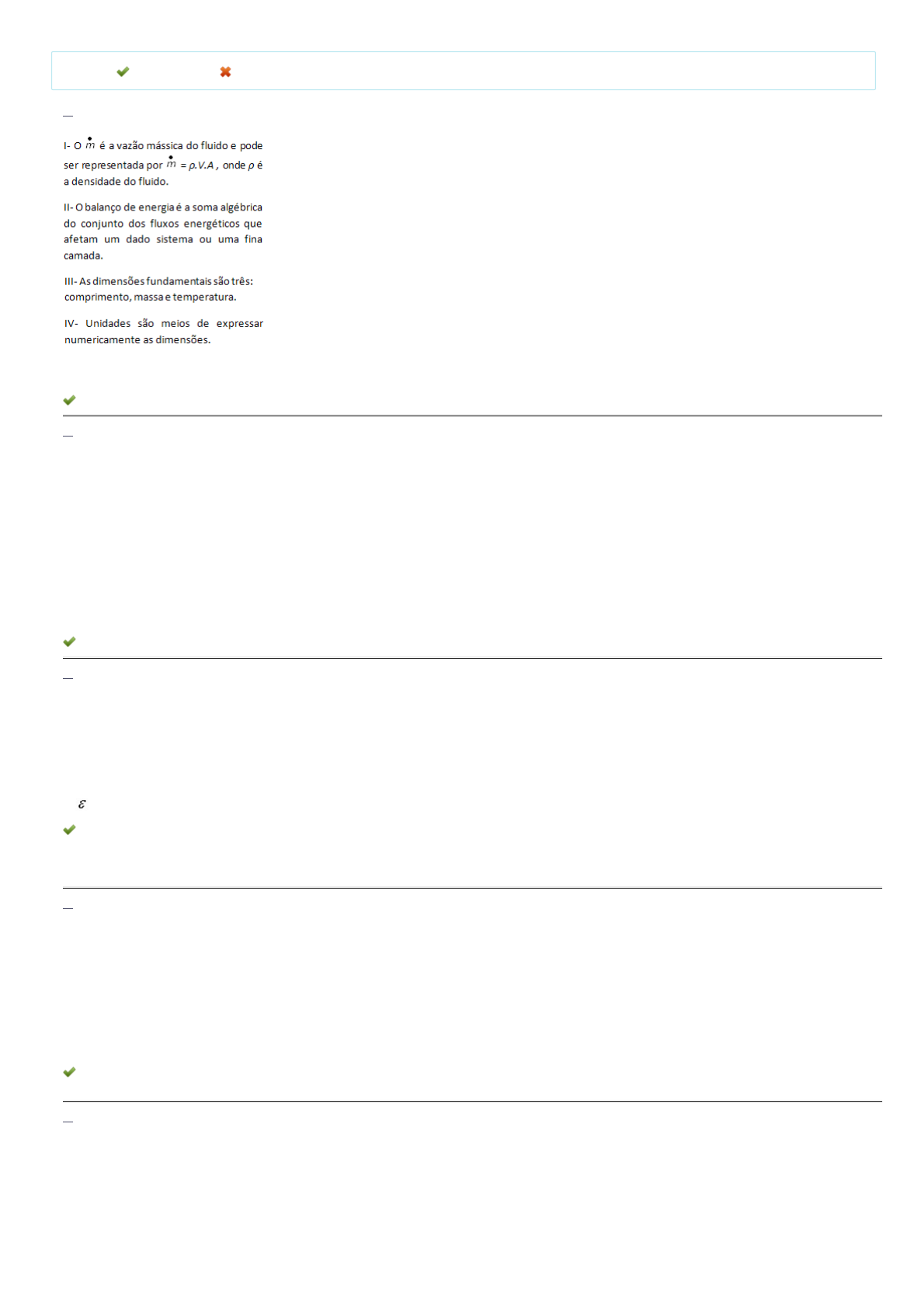 19/03/2020 UNIASSELVI - Centro Universitário Leonardo Da Vinci - Portal do Aluno - Portal do Aluno - Grupo UNIASSELVI https://portaldoalunoead.uniasselvi.com.br/ava/avaliacao/avaliacao_lista.php 1/3 Legenda: Resposta Certa Sua Resposta Errada 1. A transferência de calor é fundamental para todos os ramos da engenharia. Sobre a transferência de calor e seus aspectos, analise as sentenças assinale a alternativa CORRETA: a) As sentenças III e IV estão corretas. b) Somente a sentença III está correta. c) As sentenças I, III e IV estão corretas. d) As sentenças I, II e IV estão corretas. 2. Complete as lacunas das sentenças a seguir: Os diferentes processos de transferência de calor são referidos como mecanismos de transferência de calor que podem ser descritos: Quando a transferência de energia ocorrer em um meio estacionário, que pode ser um sólido ou um fluido, em virtude de um gradiente de tempera usamos o termo ____________. Quando a transferência de energia ocorrer entre uma superfície e um fluido em movimento em virtude da diferença de temperatura entre eles, usa termo ____________. Quando, na ausência de um meio interveniente, existe uma troca líquida de energia (emitida na forma de ondas eletromagnéticas) entre duas sup diferentes temperaturas, usamos o termo ____________ entre duas superfícies a diferentes temperaturas. Agora, assinale a alternativa CORRETA: a) transferência de calor por radiação - transferência de calor por convecção - transferência de calor por condução. b) transferência de calor por convecção - transferência de calor por condução - transferência de calor por radiação. c) transferência de calor por condução - transferência de calor por radiação - transferência de calor por convecção. d) transferência de calor por condução - transferência de calor por convecção - transferência de calor por radiação. 3. Classifique V para as sentenças verdadeiras e F para as falsas: ( ) A transferência por radiação ocorre mais eficientemente no vácuo. ( ) Todos os corpos emitem continuamente energia em virtude da sua espessura. ( ) Radiação térmica é a energia emitida pela matéria que se encontra a uma temperatura não nula. ( ) A taxa na qual a energia é liberada por unidade de área (W/m²) é conhecida como poder emissivo da superfície. ( ) O símbolo a seguir é uma propriedade radiante da superfície conhecida por absortividade. Agora, assinale a alternativa que apresenta a sequência CORRETA: a) V - F - V - V - F. b) F - V - V - V - F. c) V - F - F - V - F. d) F - V - V - F - V. 4. Um dos mecanismos de transferência de calor é a convecção. Este tipo de mecanismo difere da condução e da radiação em alguns aspectos. So convecção de calor, analise as sentenças a seguir: I- A convecção de calor é um mecanismo de transferência de energia térmica que ocorre entre uma superfície sólida e um fluido, mesmo que o flu totalmente parado. II- Convecção forçada ocorre quando o fluido é impulsionado sobre a superfície sólida por meios externos, como um ventilador. III- Convecção natural ou livre ocorre quando o movimento do fluido sobre a superfície sólida é causado pela diferença de densidade do fluido, ind variação de temperatura. Assinale a alternativa CORRETA: a) Somente a sentença III está correta. b) Somente a sentença I está correta. c) As sentenças II e III estão corretas. d) As sentenças I e II estão corretas. 5. Classifique V para as sentenças verdadeiras e F para as falsas: ( ) Os líquidos possuem uma melhor condutividade do que os metais, isso ocorre devido às moléculas dos líquidos estarem mais próximas umas outras. ( ) A condutividade térmica normalmente oferece uma forte dependência com a temperatura. ( ) Difusividade térmica na transferência de calor é a razão entre a condutividade térmica e a temperatura absoluta. ( ) Em geral a energia térmica do metal é maior que a energia térmica do não metal. ( ) O parâmetro (a seguir) mede o calor específico do material e sua unidade é (a seguir). Assinale a alternativa que apresenta a sequência CORRETA: https://portaldoalunoead.uniasselvi.com.br/ava/notas/request_gabarito_n2.php?action1=RUVBMDAzNQ==&action2=RUVMMTI=&action3=NjM4MTQ2&action4=MjAyMC8x&prova=MTU4NjYyMjM=#questao_1%20aria-label= https://portaldoalunoead.uniasselvi.com.br/ava/notas/request_gabarito_n2.php?action1=RUVBMDAzNQ==&action2=RUVMMTI=&action3=NjM4MTQ2&action4=MjAyMC8x&prova=MTU4NjYyMjM=#questao_2%20aria-label= https://portaldoalunoead.uniasselvi.com.br/ava/notas/request_gabarito_n2.php?action1=RUVBMDAzNQ==&action2=RUVMMTI=&action3=NjM4MTQ2&action4=MjAyMC8x&prova=MTU4NjYyMjM=#questao_3%20aria-label= https://portaldoalunoead.uniasselvi.com.br/ava/notas/request_gabarito_n2.php?action1=RUVBMDAzNQ==&action2=RUVMMTI=&action3=NjM4MTQ2&action4=MjAyMC8x&prova=MTU4NjYyMjM=#questao_4%20aria-label= https://portaldoalunoead.uniasselvi.com.br/ava/notas/request_gabarito_n2.php?action1=RUVBMDAzNQ==&action2=RUVMMTI=&action3=NjM4MTQ2&action4=MjAyMC8x&prova=MTU4NjYyMjM=#questao_5%20aria-label= 19/03/2020 UNIASSELVI - Centro Universitário Leonardo Da Vinci - Portal do Aluno - Portal do Aluno - Grupo UNIASSELVI https://portaldoalunoead.uniasselvi.com.br/ava/avaliacao/avaliacao_lista.php 2/3 a) V - V - F - F - V. b) F - V - F - V - F. c) F - V - V - V - F. d) F - F - F - V - V. 6. As faces das paredes (k = 1,83 W/m.K) de um reservatório apresentam as temperaturas de 25ºC e 125ºC. Deseja-se que o fluxo de calor seja de Para que esta situação se torne real, qual deve ser a espessura da parede? a) A espessura deve ser de 61 cm. b) A espessura deve ser de 6,1 cm. c) A espessura deve ser de 30,5 cm. d) A espessura deve ser de 24,4 cm. 7. Sobre a transferência de calor em sólidos, superfícies e fluidos em movimento, analise as sentenças a seguir, e assinale a alternativa CORRETA: I- Na condução de calor unidimensional em uma parede plana, a temperat
