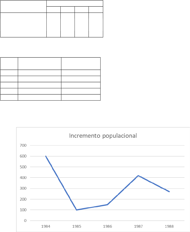CURSO DE CIÊNCIAS BIOLÓGICAS DISCIPLINA DE ECOLOGIA DE POPULAÇÕES E COMUNIDADES Atividade: 1. Durante quatro anos, foram coletados dados de uma população de capivaras numa fazenda experimental de 100 ha (1 ha = 10000 m2). Os determinantes populacionais variaram da seguinte maneira: Determinantes Populacionais Ano 1985 1986 1987 1988 Natalidade 150 220 450 500 Mortalidade 50 87 55 118 Imigração 10 30 50 30 Emigração 10 13 25 142 a) Com base nesses dados, preencha as lacunas no quadro: Ano Tamanho inicial da população Tamanho final da população 1984 - 600 1985 600 700 1986 700 850 1987 850 1270 1988 1270 1540 b) Trace a curva que representa o número de indivíduos que se acrescentaram à população durante os quatro anos. c) Calcule a densidade da população no final do ano de 1986. DA= 0,085 i/m2 d) Proponha uma hipótese que explique os valores observados para a mortalidade e emigração no ano de 1988 em relação aos anos anteriores. Como a população cresceu muito os recursos de espaço e alimento se tornaram escassos. Os que conseguiram fugir e procurar outro espaço o fizeram, e aqueles que não podiam fazê-lo acabaram morrendo. e) Indique a provável tendência a ser observada no tamanho da população a partir de 1989. A população tende a se estabilizar após fugirem para outro local. 2. Suponha que capturemos 20 peixes de um pequeno lago e os marquemos com fitas coloridas. Considere que vários dias mais tarde, capturemos uma outra amostra de 50 peixes dos quais 6 tenham nossas fitas coloridas. Neste exemplo, podemos estimar a população de peixes no lago em quantos indivíduos? 20 peixes marcados 50 peixes na recaptura 6 peixes com marca N = 166 aproximadamente DA � QUOTE � ��� DA � QUOTE � ��� N = � QUOTE � ��� N = � QUOTE � ���