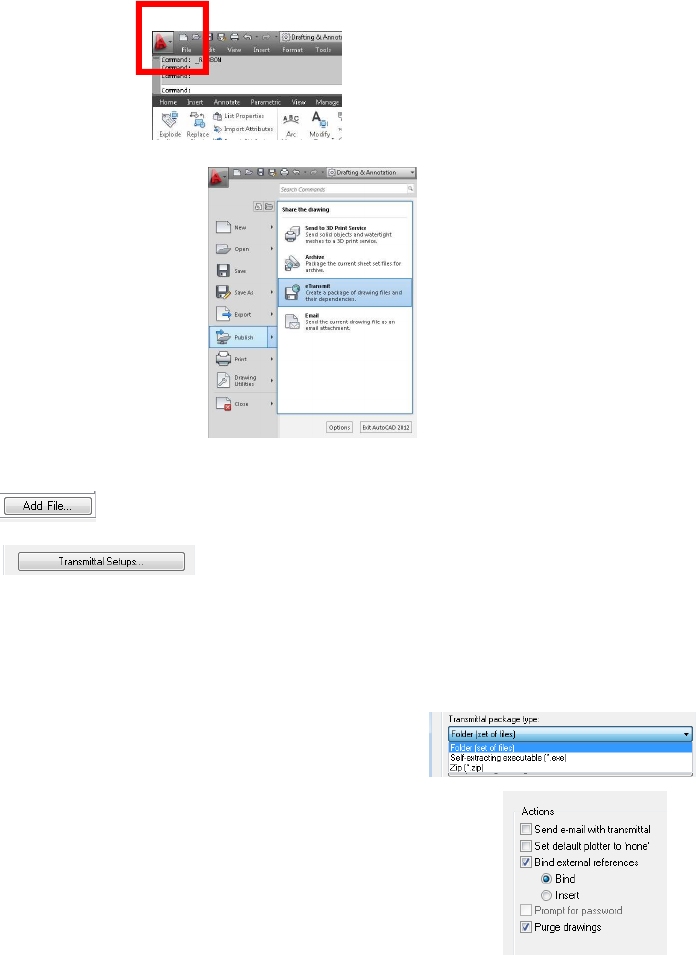 O comando eTransmit permite dar bind e purge em vários arquivos ao mesmo tempo de um mesmo diretório. Ele cria uma cópia dos arquivos selecionados quebrando os vínculos das referências externas (xref). Como usar: 1. Abra um dos arquivos que se quer dar bind. Pode ser na pasta dwg mesmo, visto que o comando irá criar cópias dos arquivos. 2. Clique no menu aplicação 3. Expanda o submenu publish 4. Dê o comando eTransmit 5. Abrirá uma caixa de diálogo 6. Clique em , adicione os arquivos que se quer dar bind. 7. Clique em 8. Abrirá uma caixa de diálogo. Clique em modify 9. Abrirá outra caixa de diálogo, onde serão definidas as ações que o comando deverá executar. • Clique no transmittal packagetype e selecione - folder (set of files) • Selecione os itens bind e purge • Transmite file folder é a pasta onde ficará os arquivos sem referência. Encontre a pasta desejada • Por fim, confira se o caminho no path options é a pasta onde estão os arquivos originais que se quer dar bind 10. Depois de tudo configurado clique em OK, depois Close e depois ok de novo. Ele inicia o processo de criar os arquivos sem vínculo o que pode demorar alguns minutos.