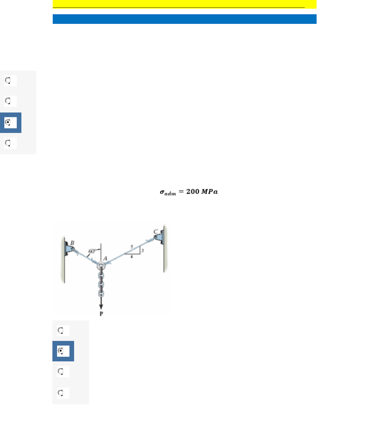 APOL 2 Princípios de Mecânica e Resistência dos Materiais 2020 NOTA : 100 Questão 1/10 - Princípios de Mecânica e Resistência dos Materiais Para o estudo e projeto de estruturas sob a óptica da Resistência dos Materiais, é necessário que os engenheiros compreendam e dominem os conceitos de deformação. Sobre deformações em corpos, é INCORRETO afirmar: A A deformação é o conceito que relaciona a força aplicada a um corpo com a mudança de tamanho e formato do mesmo; B A deformação normal de um corpo pode assumir valores positivos e negativos; C A deformação por cisalhamento e a deformação normal não ocorrem ao mesmo tempo nos corpos; D A maioria dos projetos de engenharia envolve aplicações para as quais são permitidas somente pequenas deformações; Questão 2/10 - Princípios de Mecânica e Resistência dos Materiais Os dois cabos de aço AB e AC são usados para suportar a carga. Se ambos tiverem uma tensão de tração admissível , determine o diâmetro exigido para cada cabo se a carga aplicada for P=5 kN. A dAB=4,77 mm; dAC=5,31 mm; B dAB=5,26 mm; dAC=5,48 mm; C dAB=5,45 mm; dAC=5,61 mm; D dAB=5,89 mm; dAC=5,72 mm; Questão 3/10 - Princípios de Mecânica e Resistência dos Materiais Determine os diagramas de esforço cortante e de momento fletor para a viga. Qual o momento fletor máximo (em módulo) desenvolvido na viga? A M=99 kN.m B M=106 kN.m C M=114 kN.m D M=125 kN.m Questão 4/10 - Princípios de Mecânica e Resistência dos Materiais Os diâmetros das hastes AB e BC são 4 mm e 6 mm, respectivamente. Se for aplicada uma carga de 8 kN ao anel em B, determine a tensão normal média em cada haste se . A "a" é a alternativa correta B "b" é a alternativa correta C "c" é a alternativa correta D "d" é a alternativa correta E "e" é a alternativa correta Questão 5/10 - Princípios de Mecânica e Resistência dos Materiais Determine os diagramas de esforço cortante e de momento fletor para a viga simplesmente apoiada. Qual o momento fletor máximo (em módulo) desenvolvido na viga? A M=4 kN.m B M=5 kN.m C M=7 kN.m D M=6 kN.m Questão 6/10 - Princípios de Mecânica e Resistência dos Materiais Determine os diagramas de esforço cortante e de momento fletor para a viga. Qual o momento fletor máximo (em módulo) desenvolvido na viga? A M=19,3 kN.m B M=22,6 kN.m C M=23,4 kN.m D M=25,7 kN.m Questão 7/10 - Princípios de Mecânica e Resistência dos Materiais A coluna está sujeita a uma força axial de 10 kN aplicada no centroide da área da seção transversal. Determine a tensão média que age na seção a-a. Analise as alternativas abaixo e marque a correta. A "a" é a alternativa correta B "b" é a alternativa correta C "c" é a alternativa correta D "d" é a alternativa correta Questão 8/10 - Princípios de Mecânica e Resistência dos Materiais O parafuso de olhal é usado para sustentar a carga de 30 kN. Determine o diâmetro d e a espessura exigida h, sabendo que a espessura do suporte deve ser o dobro do diâmetro do parafuso. A tensão de ruptura por cisalhamento do suporte é de 80 MPa e o fator de segurança adotado é 2. A d= 10,93 mm; h= 19,04 mm B d= 10,93 mm; h= 21,86 mm C d= 10,93 mm; h= 32,86 mm D d= 13,93 mm; h= 26,86 mm Questão 9/10 - Princípios de Mecânica e Resistência dos Materiais Determine os diagramas de esforço cortante e de momento fletor para a viga. Qual o momento fletor máximo (em módulo) desenvolvido na viga? Faça P=4 kN, a=1,5 m e L=3,6 m. A M=3 kN.m B M=4 kN.m C M=5 kN.m D M=6 kN.m Questão 10/10 - Princípios de Mecânica e Resistência dos Materiais O pino está submetido à carga mostrada, visto que é usado para interligar os três elos. Determine o diâmetro d do pino se a tensão de ruptura for de 240 MPa. Considere um fator de segurança de 2,5 para cisalhamento e de 3,0 para tração. A carga P vale 50 kN. A 17,26 mm B 18,21 mm C 19,73 mm D 24,93 mm