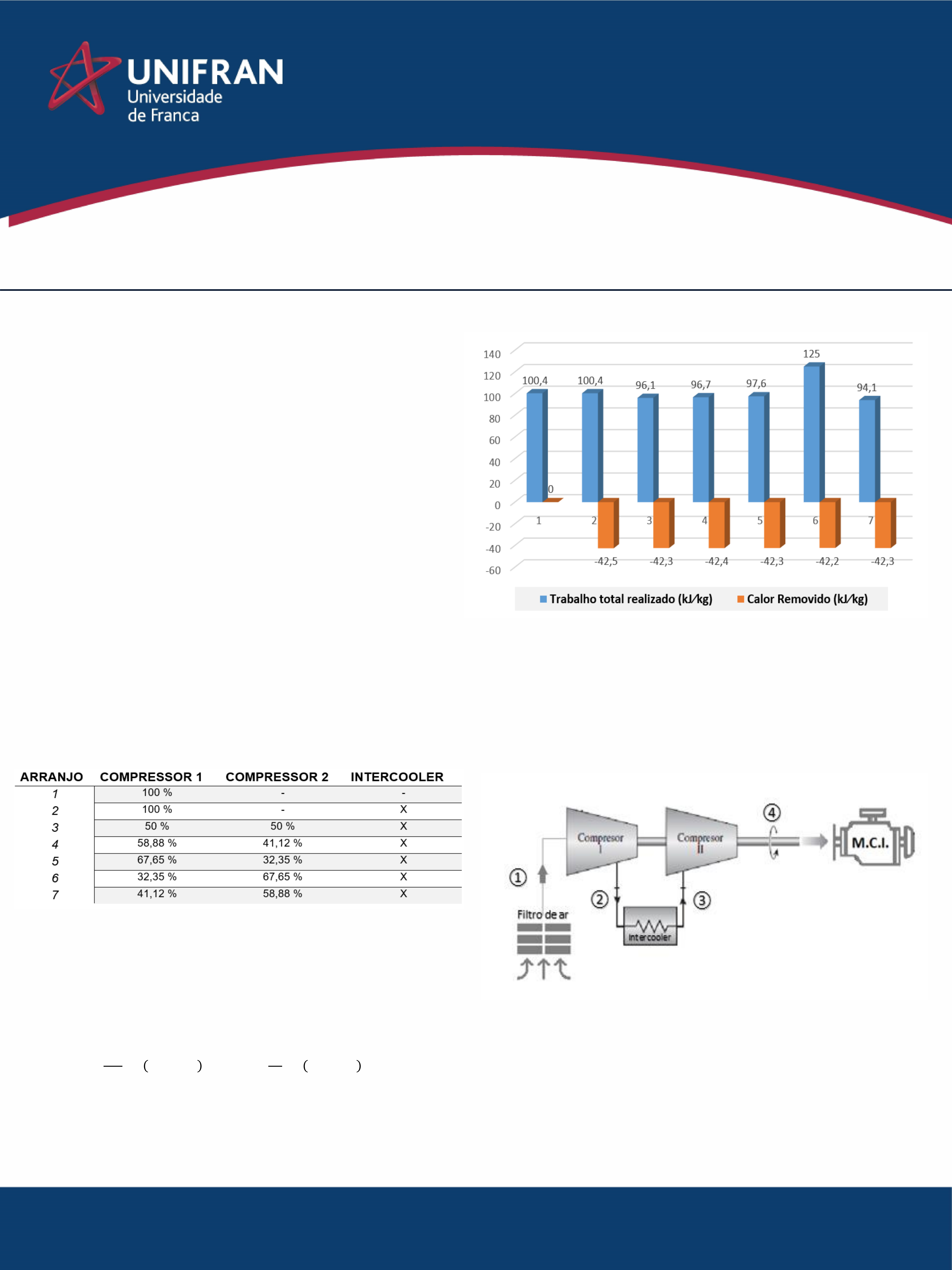 ANÁLISE DE COMPRESSOR DE DOIS ESTÁGIOS COM INTER-RESFRIAMENTO Introdução Nos motores de combustão interna, o ar é comprimido até a uma temperatura acima da temperatura de autoignição do combustível, e a combustão é iniciada pelo o contato, assim que o combustível é injetado no ar de temperatura elevada na câmara de combustão. As eficiências térmicas desses motores variam de 35 a 40%, onde a maior eficiência possui os menores custos de combustível em geral, tornando-se uma opção para aplicações que exigem quantidades significativas de potência, justificando os estudos de sistemas que possam atribuir uma melhoria ainda maior na eficiência desses motores (ÇENGEL, BOLES 2013). Os processos e ciclos desses motores despertam pesquisas focadas no aumento da quantidade de ar adicionado à mistura para a queima em um mesmo volume especifico, com o intuito de racionalizar o combustível e aumentar no ganho de potência no sistema. Um dos métodos apresentados é o estudo do ganho de trabalho nos compressores pelo ciclo de Brayton (HORODECKI, 2014). Feira de Engenharia 04, 05 e 06 de dezembro de 2018 Fábio Castro Martins Rafael de Oliveira Zaparoli Orientador: Prof. Me. Almilson Vilhena Leite Neto Materiais e Métodos Foram compostos e analisados sete arranjos, conforme descrito na tabela abaixo. Objetivos Avaliar e propor configurações diferentes em ciclos de compressão pelo o sistema de Brayton, com o intuito de reduzir o trabalho dos compressores por unidade de massa. Resultados Conclusões Foi demonstrado que sistemas com dois estágios de compressão com um Inter resfriador, onde no primeiro estágio o compressor é responsável por aproximadamente 41% da compressão total, e o segundo representa 59% da compressão são mais vantajosos quando comparados a outros sistemas com apenas um processo de compressão ou dois onde as compressões são divididas igualmente. Referências CENGEL, Yunus A; BOLES, Michael A. Termodinâmica. 5ª.ed. São Paulo: Artmed, 2006. HORODECKI, Yuri M. Comparação do desempenho de um motor de combustão interna normalmente aspirado movido a gasolina e turbocomprimido operando com etano. 2014. 109 f. Trabalho de conclusão de curso (Graduação em engenharia mecânica) – Universidade Federal Tecnológica do Paraná – Ponta Grossa. Figura: Compressão em dois estágios com intercooler. Fonte: O autor. Figura: Comparação dos resultados obtidos por intermédio de um gráfico. Fonte: O autor. Foi utilizado o software Computer Aided – Thermodynamic Tables para consulta dos dados termodinâmicos necessários. As análises dos cálculos indicados acima foram comparativas, no intuito de atingir o objetivo deste trabalho. Tabela: Definição dos arranjos indicando as porcentagens de compressão em cada estágio e a presença ou não de intercooler. Fonte: O autor. A partir dos dados termodinâmicos, calcula-se o trabalho fornecido por unidade de massa para cada compressor (Equação 1). Também calcula- se a quantidade de calor retirada por unidade de massa pelo intercooler (Equação 2) de cada arranjo. ሶ𝑾𝒄 ሶ𝒎 = 𝒉𝟐 − 𝒉𝟏 Equação 1 ሶ𝐐𝐈 ሶ𝐦 = 𝐡𝟑 − 𝐡𝟐 Equação 2