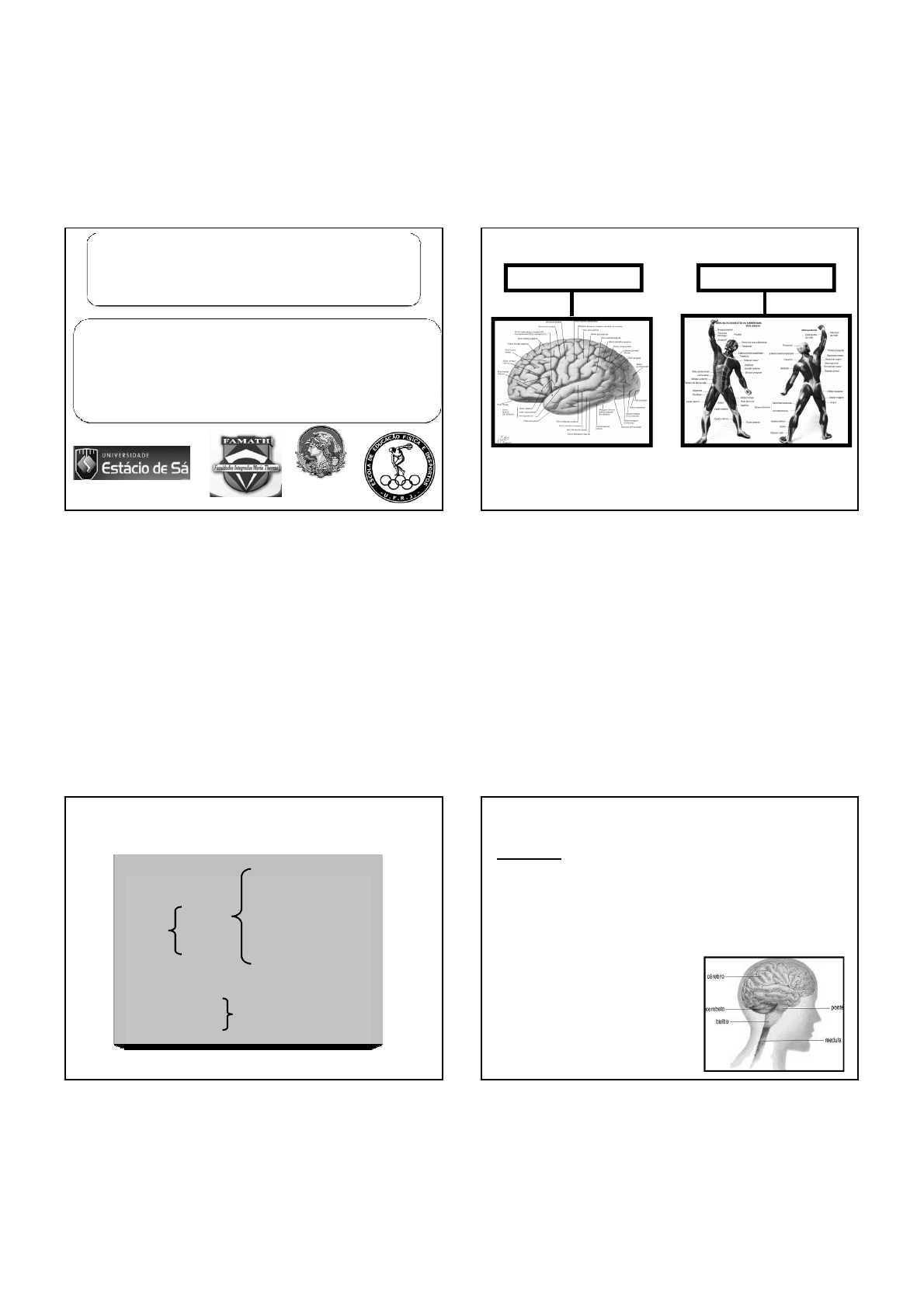 30/8/2010 1 FISIOLOGIA FISIOLOGIA NEUROMUSCULARNEUROMUSCULAR Prof. Thiago Matassoli Gomes Graduado em Educação Física – UNESA Especialista em Treinamento de Força - UNIMATH Mestre em Biodinâmica do Movimento Humano – EEFD/UFRJ Membro do Grupo de Pesquisas em Treinamento de Força – EEFD/UFRJ Membro Internacional da National Strength and Conditioning Association (NSCA) UFRJ Sistema NevosoSistema Nevoso Sistema MuscularSistema Muscular SNC Encéfalo Medula SNP Nervos Gânglios Cérebro Cerebelo Mesencéfalo Ponte Bulbo Sistema NervosoSistema Nervoso Sistema NervosoSistema Nervoso �Ajustar o organismo animal ao ambiente; �Processamento e integração das informações; �Perceber e identificar as condições ambientais externas e internas do organismo. FunçãoFunção 30/8/2010 2 � Parte mais desenvolvida do encéfalo � Relacionado com o pensamento, memória, fala, inteligência, sentidos, emoções. � Hemisfério direito: criatividade e habilidades artísticas � Hemisfério esquerdo: habilidades analíticas e matemáticas CérebroCérebro �Cerebelo: manutenção do equilíbrio corporal e do tônus muscular �Mesencéfalo: coordenação das informações referentes ao estado de contração dos músculos e postura corporal �Bulbo: presença de centro nervosos relacionados com batimentos cardíacos, movimentos respiratórios e do tubo digestivo Medula espinhalMedula espinhal � Liga o encéfalo aos nervos espinhais; �Relacionada com os atos reflexos – respostas rápidas sem participação do encéfalo. Sistema nervoso periféricoSistema nervoso periférico �Constituído de nervos e gânglios �Nervos: feixes de fibras nervosas envoltas por tecido conjuntivo �Gânglios: aglomerados de corpos de neurônios fora do SNC � Função: conectar o SNC as diversas partes corpo. 30/8/2010 3 Tipos de nervosTipos de nervos �Nervos sensoriais (aferentes): contém apenas fibras sensoriais. Impulso do órgão receptor para o SNC; �Nervos motores (eferentes): contém apenas fibras motoras. Impulso do SNC para o órgão efetuador; �Nervos mistos: contém fibras motoras e sensoriais. Impulso do SNC para o órgão e do órgão para o SNC; SISTEMA MOTOR DECISÃO DE MOVIMENTODECISÃO DE MOVIMENTO ⇓⇓⇓⇓⇓⇓⇓⇓ ÁREAS PLANEJAMENTO MOTOR ÁREAS PLANEJAMENTO MOTOR ⇓⇓⇓⇓⇓⇓⇓⇓ CIRCUITOS DE CONTROLECIRCUITOS DE CONTROLE ⇓⇓⇓⇓⇓⇓⇓⇓ VIAS MOTORAS VIAS MOTORAS DESCENDENTESDESCENDENTES ⇓⇓⇓⇓⇓⇓⇓⇓ INTERNEURÔNIOSINTERNEURÔNIOS MEDULARES MEDULARES ⇓⇓⇓⇓ ⇓⇓⇓⇓ MOTONEURÔNIOS INFERIORESMOTONEURÔNIOS INFERIORES ⇓⇓⇓⇓⇓⇓⇓⇓ MÚSCULOS ESQUELÉTICOSMÚSCULOS ESQUELÉTICOS Sensório Motor Equilíbrio Dinâmico Onde estou ? O que tenho que fazer ? Determinação da Posição do Corpo Comparar, selecionar e combinar os sentidos Sistema Visual Sistema Vestibular Sensação somática Interação Ambiental Escolha do Movimento Corporal Selecionar e ajustar o padrão de contração Muscular Tornozelo Coxa Pescoço e Tronco Olhos e Cabeça Geração do Movimento Corporal 30/8/2010 4 Mecanismo de Controle Neural • Receptores localizados nos músculos, tendões, fáscia e na pele; • O reflexo de estiramento é o elemento funcional mais simples da atividade motora; • Representam reações automáticas e consistentes ao estímulo sensorial; KOMI, 2006. 1º - Fusos musculares dos extensores são estimulados; 2º - Provocam excitação do motoneurônio inibidor (Ia); � Células de Renshaw também são responsáveis pela inibição dos antagonistas; KOMI, 2006. Inervação (inibição) recíproca ou Inibição dissináptica Ação de “inibir” a ação principal do músculo antagonista para que ocorra um movimento do músculo agonista. “O INTERNEURÔNIO INIBIDOR Ia RECEBE RICOS INPUTS CONVERGENTES DE MUITAS OUTRAS FONTES E OS PROCESSA DE MANEIRA QUE A QUANTIDADE APROPRIADA DE INIBIÇÃO MUSCULAR ANTAGONISTA SEJA ALCANÇADA.” KOMI, 2006. Ações MuscularesAções Musculares �Concêntrica: Ocasiona o encurtamento do músculo. Força > resistência externa. �Excêntrica: Ocasiona o estiramento do músculo. Força< resistência externa �Isométrica: não há modificação no comprimento do músculo. Força = resistência externa. 30/8/2010 5 Classificação quanto a funçãoClassificação quanto a função �Agonista: Responsável pela ação muscular desejada; �Antagonista: Se opõem ao movimento do agonista; �Sinergista: Auxiliam a ação desejada do músculo agonista; �Estabilizador: Estabiliza uma articulação para que outro músculo realize o movimento. Mecanismos da Força Muscular � Estruturais � Neurais � Pré-estiramento Fatores Neurais � Ativação das UM; � Coordenação intermuscular; � Sincronização das UM; � Mecanismos inibitórios; UNIDADE MOTORA músculo + nervos = unidade neuromuscular � É o componente funcional básico do sistema neuromuscular. UM NEURÔNIO MOTOR ALFA E TODAS AS FIBRAS MUSCULARES QUE ELE INERVA. KOMI, 2006. 30/8/2010 6 SISTEMA NERVOSO E CONTROLE SISTEMA NERVOSO E CONTROLE DA ATIVIDADE MUSCULARDA ATIVIDADE MUSCULAR UNIDADE MOTORA = UNIDADE BÁSICA NEUROMUSCULAR 250 milhões de fibras musculares para 420 mil nervos motores. OLHO = 1 motoneurônio enerva 10 fibras musculares QUADRÍCEPS = 1 motoneurônio enerva 150 fibras musculares Particularidades: � Cada fibra muscular é inervada no mínimo por um motoneurônio alfa. � O número de fibras musculares numa UM depende do nível de controle motor. � Duas fibras musculares adjacentes não pertencem necessariamente à mesma UM. Dendritos – recebem a informação; Axônio – conduz a informação (potencial de ação); Mielinizados – condução saltatória de impulsos; Amielinizados – condução local; Condução de Impulsos O tipo de condução depende: Tipo de motoneurônio (mielinizado e amielinizado) Mielinizado- 60 a 100 m/s Amielinizado – 0,5 a 10 m/s Diâmetro do motoneurôni