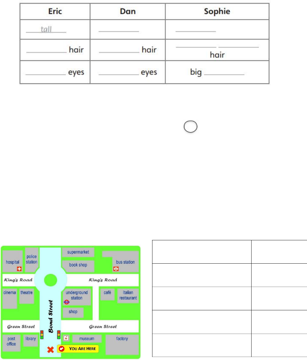 LÍNGUA INGLESA - 5.º ANO 1. Listen and write. Source: Unit test 00 – Track 02 2. Listen and circle. There is one example. 01. A. hotel B. bus station C. bank 02. A. traffic light B. zebra crossing C. square 03. A. bus station B. underground station C. museum 04. A. restaurant B. square C. shopping centre 05. A. museum B. bank C. hotel 06. A. restaurant B. shopping centre C. traffic light 07. A. hotel B. square C. underground station 08. A. traffic light B. zebra crossing C. bank Source: Unit test 02 – Track 02 3. Look and read. Write YES or NO. 1. The underground station is next to the shop. 2. The museum is below the factory. 3. The Italian restaurant is opposite the bus station. 4. The cinema is far from the hospital. 5. The supermarket is near the library. 4. Read and circle 5. Read and complete. There is an example for you (00). I’m Kate and I’ve got one sister. Her name’s Isabelle and we’re very different. I’m tall, but Isabelle’s (00) _ short_. I’m 1 metre 58 centimetres (01) ____________________and she’s (02) 1_____________ 27 centimetres. She’s got short fair hair, but I’ve got long (03) ________________ hair. My hair’s straight, but her hair’s (04) _________________ . I’ve got brown eyes, but Isabelle’s got (05) __________________ eyes. She’s got small (06) ______________________ . I haven’t, but I’ve got some big sunglasses. 6. Read and match. There is an example for you. 1. What are you not very good at? 2. Are you good at Maths? 3. What are you good at? 4. What do you want to be good at? 5. Are you good at sailing? ( ) No, I’m not. ( ) Yes, I am. I love boats. ( ) I want to be good at snowboarding. ( ) Music. And I can’t sing. ( ) I’m very good at volleyball. 2 7. Read the text below and answer the questions correctly. 1. The Beatles were a famous rock group in the 1970s. 2. There are 2008 shops at Liverpool ONE. 3. You can go to the cinema at the Liverpool ONE. 4. The Anfield stadium is open on weekends. 5. You can take a tour at the Anfield football stadium. You can learn history of Liverpool at the Liverpool 6. Museum. 8. Choose the correct option. TRUE FALSE A ( ) B ( ) A ( ) B ( ) A ( ) B ( ) A ( ) B ( ) A ( ) B ( ) A ( ) B ( ) 01. A: What does Tom look __? B: He’s very tall. A. have B. like C. can 02. A: __ tall is Lisa? B: She’s 1 metre 31 centimetres. A. What B. Why C. How 03. A: What are you good at? A. Making films B. I can’t swim C. It looks great 3 J5 - Written Production – First Term 04. A: Do you like skiing? A. Yes, I do B. Yes, I can C. Yes, I have 5. It means stop and go. It’s red, yellow and green A. museum B. zebra crossing C. traffic light 06. A: Where’s the underground station? A. It’s below the square B. Turn right C. Start at the restaurant 9. Match the pictures to the descriptions. A B C D E ( ( ( ) He’s got long curly hair. ) She’s short. She’s got big glasses. ) She’s got long curly hair. ( ( ) She’s got long straight hair. ) He’s tall. He’s got short straight hair. 10. Read the story. Choose a word from the box. Write the correct word next to numbers 1 – 5. Hi, I’m Fred. I’m twelve years old and I love sports. I like skiing and snowboarding, but my favourite sport is (01) __________________. My dad and I are big fans of the Los Angeles Lakers. And we go to all their games. On Tuesdays and Thursdays I go to the (02) __________________ and play with my friend Jim. I also enjoy going to the (03) __________________. I love the water. My dad and I love water sports, so sometimes we go (04) __________________ together. On Saturdays I sometimes go to the park because it’s the best place to (05) __________________. My brother never comes with me. He just wants to stay home and play computer games. Really boring! 5