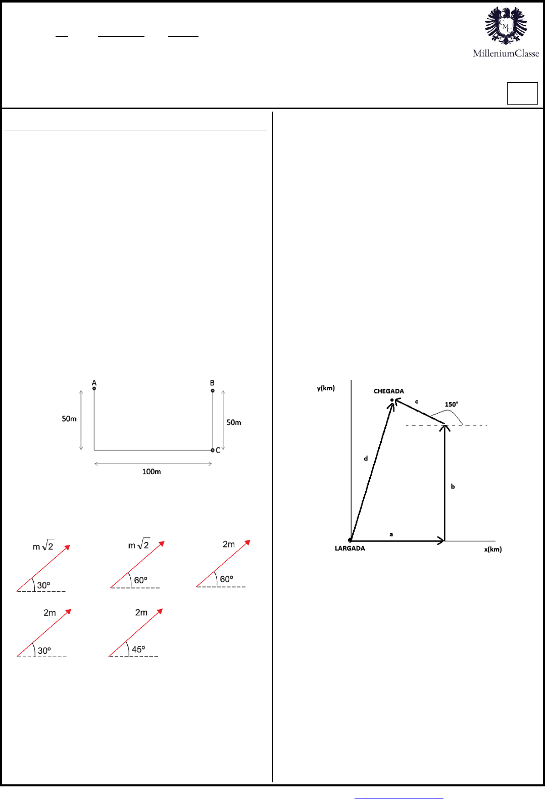 LISTA DE EXERCÍCIOS Goiânia, _20_ de _Fevereiro_ de 2018 Aluno(a):___________________________________________________________________ Série: Curso • Turma: _____ Código:__|__|__|__|__ Disciplina: Física Professor: Renato Berenguel Rua T-53 Qd. 92 Lt. 10/11 nº 1336 - Setor Bueno – Goiânia-GO - Fone: 3285-7473 – www.milleniumclasse.com.br - 1 - 03 ASSUNTO: CINEMÁTICA VETORIAL 01 - (UEPG PR/2015) As grandezas físicas classificadas como vetoriais são representadas por um vetor. Sobre os vetores e os res-pectivos cálculos, assinale o que for correto. 01. Um vetor é representado graficamente por um segmento de reta orientado, onde a direção é dada pela reta suporte e o comprimento do segmento é o seu módulo. 02. O produto de um número real n por um vetor v é também um vetor, de mesma direção e sentido de v , se n for positivo, e de sentido contrário, se n for negativo. 04. A soma de dois vetores colineares é igual à soma de seus módulos, e a diferença é a subtração entre seus módulos. 08. É impossível obter o valor do vetor resultante da soma de três vetores não colineares pelo método do paralelogramo. 16. Graficamente, a diferença entre dois vetores sobre um plano é um terceiro vetor representado pela diagonal maior do paralelogramo formado entre eles. 02 - (UNIC MT/2017) Um homem normal de meia idade vai a um hospital para fazer exames de rotina. A atendente anota o tempo que ele gasta para caminhar seguindo a trajetória mostrada na figura. Sendo de 2,0 min o tempo gasto pelo homem para sair do ponto A, ir ao ponto B e voltar para o ponto C, é correto afirmar que o módulo do vetor velocidade média desenvolvida por ele, em m/s, é igual a 01) 1,45 02) 1,40 03) 1,35 04) 1,30 05) 1,25 03 - (Uni-FaceF SP/2017) Considere um vetor A de módulo m√3, horizontal para a direita, e um vetor B de módulo m, vertical para cima. A soma BA resulta em um vetor, cujo módulo e cuja direção estão corretamente representados por a) b) c) d) e) 04 - (UEFS BA/2015) Três vetores A, B e C possuem as seguintes direções x e y: Ax = 9, Ay = –4; Bx = –4, By = 3; Cx = 2, Cy = 3. Dessa forma, o módulo do vetor X = A + B – C é igual a a) 5,0 b) 4,8 c) 4,5 d) 4,0 e) 3,3 05 - (UEFS BA/2015) O conceito fundamental da Mecânica é o de movimento, ou seja, da mudança da posição dos corpos ao longo do tempo e em relação a um determinado referencial. Considerando-se uma pedra presa à extremidade de um fio ideal e posta a girar, descrevendo uma circunferência de 50,0cm de raio em um referencial fixo na mão que segura a outra extremidade do fio, conclui-se que o módulo do deslocamento sofrido pela pedra em 2,25 voltas, em m, é, aproximadamente, igual a a) 0,71 b) 0,68 c) 0,57 d) 0,53 e) 0,49 06 - (UniRV GO/2017) A figura a seguir representa um mapa para competidores de um rali automobilístico, em que a, b e c é a sequência de trajetos que devem ser seguidos pelos navegadores para completarem a prova. Porém houve um problema na impressão do mapa e o valor do deslocamento b não ficou legível, podendo fazer com que os competidores não completem a prova com êxito. Os trajetos conhecidos eram: a igual 30 km, c igual a 20 km e d igual a 50 km. Os trajetos a e b são perpendiculares entre si. (Adote: cos 150º = –0,8 e sen 150º = 0,5) Assinale V (verdadeiro) ou F (falso) para as alternativas. a) O navegador que percorrer 38 km em b chegará ao destino com êxito. b) O navegador que percorrer 48 km em b chegará ao destino com êxito. c) O deslocamento dos competidores em relação ao eixo y equivale a 48 km. d) O deslocamento dos competidores ao percorrerem as trajetórias a e b é maior do que quando percorrem b e c. 07 - (UF-PB) Um cidadão está à procura de uma festa. Ele parte de uma praça, com a informação de que o endereço procurado estaria situado a 2 km ao norte. Após chegar ao referido local, ele recebe nova informação de que deveria se deslocar 4 km para o leste. Não encontrando ainda o endereço, o cidadão pede informação a outra pessoa, que diz estar a festa acontecendo a 5 km ao sul daquele ponto. Seguindo essa dica, ele finalmente chega ao evento. Na situação descrita, o módulo do vetor deslocamento do cidadão, da praça até o destino final, é: a) 11 km. b) 7 km. c) 5 km. d) 4 km. e) 3 km. Rua T-53 Qd. 92 Lt. 10/11 nº 1336 - Setor Bueno – Goiânia-GO - Fone: 3285-7473 – www.milleniumclasse.com.br - 2 - 08 - (Centro Universitário de Franca SP/2016) Um móvel descreve movimento circular no sentido horário, tendo sido anotado 8 instantâneos de velocidade, como mostra a figura. Verifica-se o maior módulo da variação do vetor velocidade, ou v , entre os pontos a) A e E. b) B e F. c) C e G. d) A e G. e) C e H. 09 - (ACAFE SC) A copa das Confederações é uma competição realizada de quatro em quatro anos organizada pela FIFA (Federação internacional de Futebol) e terá o Brasil como sede em 2013. Essa competição servirá como teste para a copa do mundo em 2014. Imagine que, buscando melhorar as marcações da regra de futebol em um jogo, fosse desenvolvido um chip que embutido na bola seria capaz de auxiliar o juiz e ajudar em toda a estatística da partida. Para testar esse chip foi, então, realizado um experimento onde quatro jogadores trocaram passes com a bola de um ponto a outro do campo, como mostra a figura abaixo. (Considere as faixas de grama da mesma largura.) O jogador de número 8 passou a bola para o de número 5 que, em seguida, passou para o de numero 7 e que, finalmente, passou para o de número 9. O módulo do deslocamento, em m, sofrido pela bola do início ao final do teste é: a) 41 b) 10 c) 34 d) 26 10 - (UEM PR) Um motorista traça uma rota para uma viagem de carro, partindo da cidade de Curitiba com destino a Santa Maria, no Rio Grande do Sul, passando pela cidade de Foz do Iguaçu. Esse motorista, numa primeira aproximação, considera as posições que essas cidades ocupam no mapa com