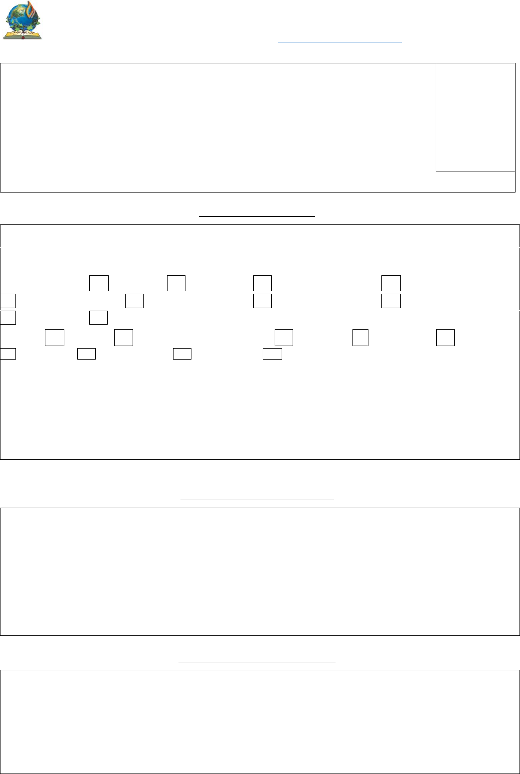 IGREJA PENTECOSTAL ASSEMBLEIA DE DEUS - MINISTÉRIO RESTAURAÇÃO Sede Internacional: Av. Farrapos, 312, Floresta – Porto Alegre/ RS – Brasil Fone: (51) 3931-6000 – www.restauramundo.com Atualizado em Nov/2016. FICHA DE CADASTRO DE MEMBRO Cole aqui a foto do Membro ÁREA: ________________________________________ Código: ________ CONGREGAÇÃO: ______________________________________________ MUNICÍPIO: __________________________________ Estado: __________ Fotos entregues: ( ) Sim ( ) Não Carteira Entregue em: ___/___/_____ DADOS PESSOAIS Nome: _______________________________________ Data de Nasc: ___/____/____ Naturalidade _______________________ Estado ____ Nacionalidade _____________ Escolaridade: 1. Analfabeto 2. Alfabetizado 3. Fund/ 1º Grau Incomp. 4. Fund/ 1º Grau Completo 5. Médio/ 2º Grau Incomp. 6. Médio/ 2ºGrau Comp. 7. Superior Incomp. 8. Superior Completo 9. Mestrado 10. Especialização/ Pós-Graduação Formação Acadêmica: ______________________________________ Sexo: Masculino Feminino Estado Civil: 1. Casado (a) 2.Divorciado(a) 3. Solteiro (a) 4. Viúvo (a) 5. Desquitado (a) 6. Separado (a) 7. Outro ___________________________________________ E-mail: ________________________________ Site: _________________________________ RG: ___________________________________ CPF: ________________________________ Título de Eleitor: ________________________ Seção: _________ Zona: _______________ Nome Pai: _____________________________ Nome Mãe_____________________________ DADOS DOMICILIARES CEP: __________________ Endereço: ___________________________________________ Complemento: ____________________________ Bairro: ____________________________ Cidade: __________________________________ Estado: ___________________________ País: ____________________________________ Fone Com.: ________________________ Fone Res.: _______________________________ Celular: ___________________________ DADOS PROFISSIONAIS Profissão: ________________________________ Trabalhador: ( ) Ativo ( ) Aposentado Empresa: ___________________________________________________________________ Endereço: ________________________________ Bairro: ____________________________ CEP: _____________________ Cidade: __________________________ Estado: ________ Fone Com.: ________________________ Res.: ____________ Celular: _______________ http://www.restauramundo.com/ IGREJA PENTECOSTAL ASSEMBLEIA DE DEUS - MINISTÉRIO RESTAURAÇÃO Sede Internacional: Av. Farrapos, 312, Floresta – Porto Alegre/ RS – Brasil Fone: (51) 3931-6000 – www.restauramundo.com Atualizado em Nov/2016. DADOS FAMILIARES Cônjuge: ______________________________________________ Crente: ( ) Sim ( ) Não Escolaridade: 1. Analfabeto 2. Alfabetizado 3. Fund./ 1º Grau Incomp. 4. Fund./ 1º Grau Completo 5. Médio/ 2º Grau Incomp. 6. Médio/ 2ºGrau Comp. 7. Superior Incomp. 8. Superior Completo 9. Mestrado 10. Especialização/ Pós-Graduação Formação Acadêmica: ______________________________________ Profissão do Cônjuge: ____________________________ Data de Nascimento: ___/__/___ Religião: ________________________________________ Batizado (a): ( ) Sim ( ) Não Data de Batismo: ___/___/____ Nº de filhos: _____ Data de Casamento: ___/____/_____ DADOS ECLESIÁSTICOS Data de Batismo: ___/___/____ Obreiro: ( ) Não ( ) Sim, cargo ________________ Recebido por: ( ) Batismo ( ) Adesão ( ) Transferência ( ) Reconciliação Igreja de Origem: ____________________________________________________________ Data de Apresentação: ____/____/_____ Data de Recebimento: ____/____/_____ Cursou Discipulado Intensivo em: ____/____/_____ Batizado c/ Espírito Santo: ( ) Sim ( ) Não Experiência Ministerial (Cargos e funções exercidas com as respectivas Datas) Cargo/Função Datas O que o levou a vir à IPAD - Ministério Restauração? ______________________________________ ___________________________________________________________________________________ Qual a principal razão que o levou a decidir por ser membro da Igreja? ______________________ ___________________________________________________________________________________ Atividades que pode executar na obra de Deus: __________________________________________ ___________________________________________________________________________________ ___________________________________________________________________________________ Local (Município) ____/____/______ Data Assinatura do Membro Assinatura do Obreiro _________________________________________________ Em ____/____/____ Abonado pelo encarregado da Área _______________________________________ Em ____/____/____ http://www.restauramundo.com/