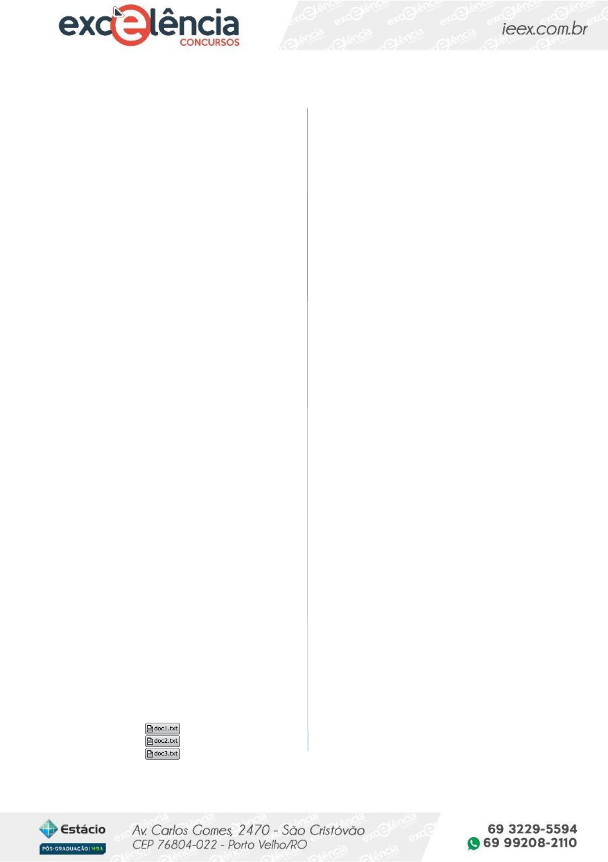 INFORMÁTICA PARA CONCURSOS SIMULADO Windows Explorer 1. O usuário de um computador com sistema operacional Windows 7 armazenou o arquivo Relatório Anual.docx na pasta Documentos da sua pasta de arquivos pessoais. Para facilitar o acesso a esse arquivo, o usuário decidiu criar um Atalho para esse arquivo na Área de Trabalho. Para isso ele deve, supondo o mouse em sua configuração padrão, selecionar o arquivo Relatório Anual.docx na pasta Documentos, arrastá-lo para a Área de Trabalho e soltá-lo, mantendo pressionados simultaneamente durante essa ação o botão esquerdo do mouse e a tecla. a) Shift. b) Alt. c) Ctrl. d) Tab. e) Esc. 2. O navegador para a internet Google Chrome, em sua versão mais atual, está instalado no disco C: de um computador com sistema operacional Windows 7. Ao fazer um download de um arquivo utilizando o Chrome, por padrão, o arquivo será armazenado na pasta: a) C:\Área de Trabalho\<nome de usuário>\Downloads. b) C:\<nome de usuário>\Área de Trabalho\Downloads. c) C:/home/<nome de usuário>/Downloads. d) C:\<nome de usuário>\Documentos\Downloads. e) C:\Usuários\<nome de usuário>\Downloads. 3. A imagem a seguir foi feita no Windows Explorer, do MS-Windows 7, em sua configuração padrão, e mostra 3 arquivos selecionados. Ao apertar a tecla Enter, com os 3 arquivos selecionados, a) Apenas o primeiro arquivo (doc1.txt) será aberto. b) Apenas o último arquivo (doc3.txt) será aberto. c) Nenhum arquivo será aberto. d) Todos os arquivos serão abertos. e) Uma janela de confirmação de ação será aberta. 4. Acerca do uso do Windows Explorer (WE) para o gerenciamento de arquivos, pastas e programas sob os sistemas Windows Vista e Windows 7 Professional, assinale a opção correta. a) No WE, para ver a data de modificação de um arquivo, uma possibilidade é selecionar a opção Lista entre as opções de visualização de pastas. b) No WE, para se verificar que processador e que quantidade de memória RAM estão instalada no computador, uma opção é clicar o ícone Computador com o botão direito do mouse e, em seguida, escolher a opção Propriedades. c) Em sua configuração padrão, a área da janela do WE apresenta dois painéis: o do lado esquerdo mostra a árvore de pastas e os arquivos; no do lado direito, visualiza-se o conteúdo dos arquivos. d) O WE permite que o usuário criptografe o conteúdo de uma pasta mediante a seguinte sequência de procedimentos: clicar o botão direito do mouse, selecionar a opção Criptografar e digitar a senha desejada. e) O WE não permite que arquivos localizados na pasta c:\Windows\system32 sejam removidos, pois eles são arquivos de configuração do sistema operacional. 5. No MS-Windows 7, em sua configuração padrão, três usuários selecionaram, em instantes diferentes, o arquivo Teste.txt armazenado em uma pasta, e cada um executou a seguinte sequência de comandos: Usuário 1: CTRL + C, CTRL + V Usuário 2: CTRL + X, CTRL + V Usuário 3: CTRL + C, CTRL + V, CTRL + Z Sobre essas ações, é correto afirmar que para o Usuário. a) 1 foi gerado o arquivo Teste (1).txt no mesmo diretório. b) 1 surgiu uma caixa de diálogo com a mensagem contendo “Os nomes de arquivos de origem e de destino são iguais.” e os botões “Ignorar” e “Cancelar”. c) 2 foi gerado o arquivo Teste-Copia.txt no mesmo diretório. d) 3 surgiu uma caixa de diálogo com a mensagem contendo “Os nomes de arquivos de origem e de destino são iguais.” e o botão “Cancelar”. e) 3 foi gerado o arquivo Teste-Copia.txt no mesmo diretório, e, em seguida, essa cópia foi desfeita. 6. Em seu computador de mesa local, depois de trabalhar em um ofício destinado a outro órgão federal, Gustavo salvou esse ofício com o nome “of24.odt” em um subdiretório chamado “Ofícios 2017”, que está contido no diretório “Documentos”. Este, por sua vez, está acessível por uma unidade mapeada ao local do servidor de arquivos gerenciado pela equipe de dados corporativos da instituição. Assinale a alternativa que indica o caminho correto do arquivo salvo. a) Z:\Documentos\Oficios 2017\of24.ods b) T:\Documentos\Oficios 2017\of24.odt c) C:\\Documentos\Oficios 2017\of24.odt d) C:\Documentos\Oficios 2017\of24.doc e) E:\\Documentos\Oficios 2017\of24.odt 7. Ao utilizar uma estação de trabalho, a servidora Lúcia, que atua na seção de registros de dados funcionais, precisa baixar alguns arquivos do Diário Oficial da União para posterior armazenamento na pasta digital do seu setor, localizada na rede local desse setor. Para realizar essa tarefa, Lúcia pode utilizar um aplicativo de navegação em sítios da internet. Das opções a seguir, assinale a que NÃO condiz com um aplicativo de navegação em sítios da internet. a) Google Chrome. b) Windows Explorer. c) Microsoft Edge. d) Mozilla Firefox. e) Chromium. 8. Com relação às pastas, aos arquivos e ao Explorador de Arquivos do sistema operacional Windows, é correto afirmar que. a) Uma pasta compactada não pode ter zero arquivo, isto é, estar vazia. b) O painel de visualização, quando ativado, permite a visualização de vários tipos de arquivos, exceto imagens com extensão .png. c) É possível renomear arquivos em lote. d) A tecla F4, quando pressionada, exclui arquivos da mesma forma que o botão Delete ou Del. e) As propriedades de uma pasta não informam quantos arquivos ela contém. 9. Analise a figura a seguir. No Windows Explorer, para selecionar pastas consecutivas, como na figura acima, é necessário clicar na primeira pasta, e, mantendo uma tecla pressionada, clicar na última pasta. Qual tecla é essa? a) INS b) ALT c) CTRL d) SHIFT 10. Sem usar o mouse, qual é a combinação de teclas usadas para abrir o Windows Explorer? a) Tecla Windows + tecla E. b) Tecla Windows + tecla A. c) Tecla Windows + tecla R. d) Tecla Windows + tecla M. 11. Observe a figura abaixo, que se refere a janela do Windows Explorer, no Windows 7, e assinale a alternat