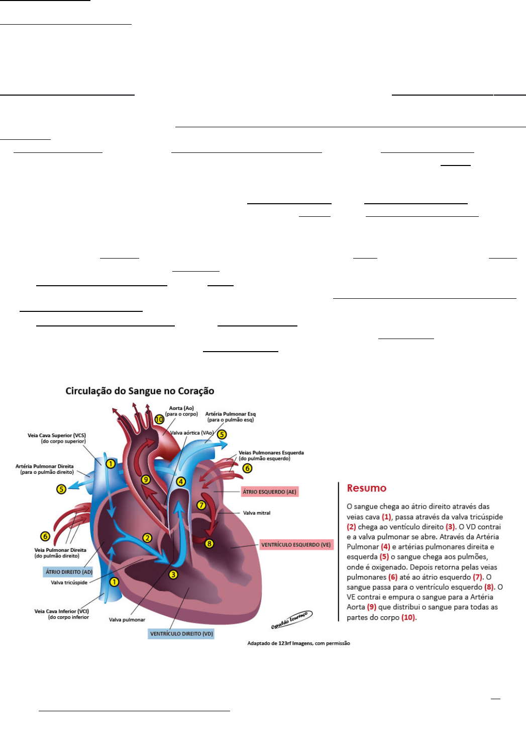 CICLO CARDÍACO Ana Paula Hilgemberg - 83 Ciclo cardíaco é a expressão referente aos eventos relacionados ao fluxo e pressão sanguínea que ocorrem desde o início de um batimento cardíaco até o próximo batimento. Em resumo, dividimos o ciclo em dois períodos: o de relaxamento, chamado diástole, quando o coração se distende ao receber o sangue, e o de contração, denominado sístole, quando ele ejeta o sangue. O ciclo cardíaco é iniciado pela geração espontânea de potencial de ação no nodo sinoatrial (NSA), pelas células marcapasso. O impulso elétrico difunde-se pelo miocárdio atrial e, posteriormente, passa para os ventrículos através do feixe atrioventricular, que apresenta velocidade de condução mais baixa, gerando um atraso na transmissão, garantindo que os átrios (as aurículas) contraiam-se antes dos ventrículos, favorecendo a função do coração como bomba. · O coração é composto por quatro câmaras. Pelas câmaras esquerdas, circula sangue rico em oxigênio, proveniente dos pulmões e dirigido às demais partes do corpo. Pelas câmaras direitas, circula sangue pobre em oxigênio, vindo de todo o corpo e direcionado ao pulmão. · No adulto saudável, não existe comunicação entre as câmaras esquerdas e direitas. · As câmaras de recepção do sangue, mais complacentes, são chamadas de átrios, enquanto as câmaras de ejeção, mais musculosas, são chamadas de ventrículos. · Entre os átrios e os ventrículos, existem valvas. Estas valvas permitem a passagem do sangue apenas no sentido do átrio para o ventrículo. São chamadas de valvas atrioventriculares. No lado direito, temos a valva tricúspide, e no lado esquerdo a valva mitral. · Entre os ventrículos e as artérias, ficam as valvas semilunares. Estas valvas permitem apenas a saída do sangue dos ventrículos em direção das artérias. Entre o ventrículo esquerdo e a aorta, fica a valva aórtica. Entre o ventrículo direito e o tronco da artéria pulmonar, fica a valva pulmonar. Sístole - subfases 1. Fase de Contração Isovolumétrica: O ventrículo está cheio de sangue e começa a contrair-se. A pressão ventricular é superior à auricular e as valvas auriculoventriculares fecham-se. No entanto, a pressão ventricular é inferior à aórtica (no caso do ventrículo esquerdo) e à pulmonar (ventrículo direito), contraindo-se assim sem alteração de volume no seu interior. Esta fase é caracterizada por um aumento brusco de pressão. 2. Fase de expulsão rápida: A pressão no interior do ventrículo esquerdo é maior que a aórtica (classicamente valores acima dos 80 mmHg) abrindo-se a valva aórtica de modo a que o sangue saia do ventrículo a grande velocidade e pressão. 3. Fase de expulsão lenta: A aorta é uma artéria muito elástica e tem uma grande capacidade de distensão, esta propriedade permite que o fluxo sanguíneo pelo organismo seja contínuo. À medida que o sangue entra na aorta, está se distende para acomodar o volume, aumentando, assim, a pressão no seu interior. Deste modo, a diferença de pressões entre ventrículo e aorta é cada vez menor, saindo o sangue do ventrículo a cada vez com menor velocidade. 4. Protodiastole: É uma fase virtual que separa a sístole da diástole. Em dado momento, a pressão aórtica iguala a ventricular, não havendo, deste modo, qualquer ejeção de sangue, embora ainda haja pouco fluxo devido à inércia. Imediatamente após, o ventrículo começa a distender-se, dando-se origem à diástole. Diástole - subfases Fase de Relaxamento Isovolumétrico. Quando a pressão ventricular é inferior à pressão aórtica (no caso do ventrículo esquerdo) mas superior à pressão atrial, estando assim ambas valvas fechadas, não havendo variação no volume de sangue dentro do ventrículo. 1. Fase de enchimento rápido: Quando a pressão ventricular por fim se reduz abaixo da pressão atrial, que nesse momento é máxima (ápice da onda v da curva de pressão atrial), as valvas AV se abrem, deixando passar um grande fluxo rapidamente em direção ao ventrículo. 70% do enchimento ventricular ocorre nessa fase. 2. Fase de enchimento lento: Também chamado de diástase. Com o enchimento do ventrículo e o fim da fase ativa do relaxamento do músculo cardíaco, ocorre uma desaceleração importante do fluxo. As valvas AV tendem a se fechar passivamente. No momento da desaceleração do fluxo rápido para o fluxo lento é que ocorre o 3º ruído cardíaco. O fluxo do átrio para o ventrículo é bastante reduzido, chegando a quase parar. 3. Sístole atrial: Ocorre a contração atrial. As valvas AV se abrem, momento em que ocorre a onda A da válvula mitral ao ECO unidimensional e o 4º ruído cardíaco. A sístole atrial pode representar até 20% do volume diastólico final do ventrículo, sendo de grande importância para a manutenção do débito cardíaco nos pacientes que possuam algum tipo de restrição funcional do VE. Valvas Cardíacas Regulação do bombeamento cardíaco 1. Mecanismo de Frank-Starling (intrínseca) Capacidade intrínseca o coração de se adaptar a variação do retorno venoso Quanto maior forem as forças de estiramento do músculo durante a diástole, maiores serão a força de contração e quantidade de sengue bombeado para o corpo · Retorno venoso regulado pela limitação natural do coração Lei de Frank-Starling Quanto maior a distensão da parede ventricular maior sua força contrátil, até um limite fisiológico 2. Pré Carga e Pós Carga · Pré Carga Grau de tensão contra o qual o músculo começa a se contrair (máximo de estresse da parede do ventrículo, quando está cheio de sangue) Pressão Diastólica final do Ventrículo · Pós Carga Carga contra a qual o músculo exerce seu trabalho (dificuldade enfrentada pelo ventrículo durante o processo de ejeção) Quanto maior a pressão arterial, maior é a pós-carga, ou seja, mais difícil é a ejeção. O aumento da pós-carga, tanto 
