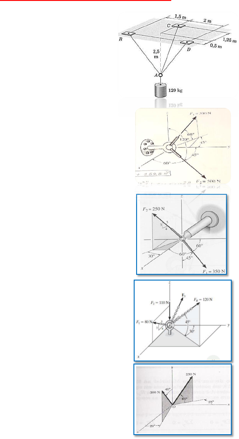 EXERCÍCIOS REFERÊNCIAS PROVAS MACKENZIE E APOSTILA PROF. CARLA CAMPOS. 1 PARTE PRÁTICA – LISTA DE EXERCÍCIOS 1) Três cabos sustentam uma carga de 120 kg como mostra a figura. Considerando o sistema em equilíbrio, determine a força de tração em cada um dos cabos. Resposta: Tab= (97,7;293,13; 488,56) N; Tac= (171; 0; 320,86) N Tad= (73,22; 293,37; 367,07) N 2) A junta da figura é submetida às duas forças mostradas. a) Expresse cada uma das forças na forma de um vetor cartesiano. F1= (-106,06; 106,06; 259,8) N; F2= (250; 353,55; -250) N b) Determine a força resultante seu módulo e sua direção. FR= 481,72 N; Ângulos diretores: α = 72,61º β=17,43º γ= 88,83º 3) Para o sistema de forças apresentado: a) Expresse cada força como um vetor cartesiano; b) Determine o ângulo formado entre as duas forças; c) Determine a força resultante e seus ângulos diretores. Resposta: a) F1= (175;175; -247,49) N; F2= (173; -100; 150) N b) Θ= 106,15º d) Ângulos diretores: α = 19,45º β=78,28º γ= 105,3º 4) Três forças concorrentes atuam sobre o anel. Considerando a força resultante com magnitude de 120 N e posicionada como indicado na figura, determine: a) a força 𝐹3 que atua sobre o anel, bem como seu módulo; b) os ângulos diretores da força 𝐹3 Resposta: a) F3= (-21,574; 73,485; 146,852) N; F3= 165,623 N b) Ângulos diretores: α = 97,485º β=63,661º γ= 27,543º 5) Para o sistema de forças apresentado: a) Determine o ângulo formado entre as duas forças; b) Determine a força resultante e seus ângulos diretores. Resposta: a) Θ= 50,65ºb) FR= 497,8N Ângulos diretores: α = 68,9º β=26,29º γ= 75,05º