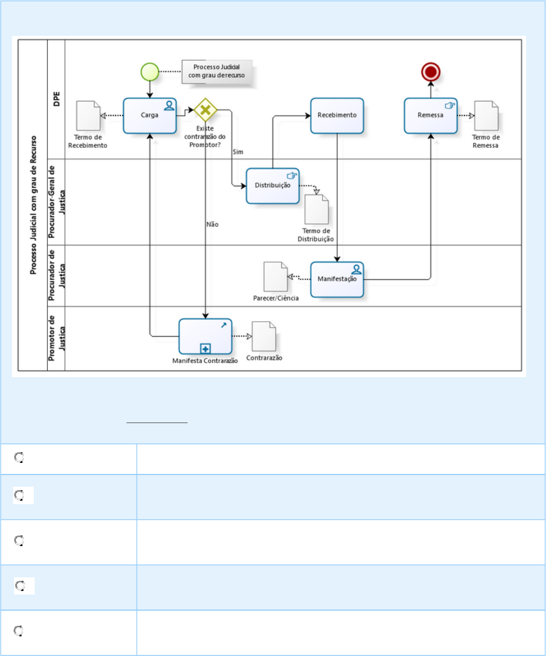 Analise o diagrama de processos abaixo: É um diagrama BPM para processos. Escolha a opção correta a respeita de diagramas de processo. A A UML tem um diagrama similar a este apresentado. B Um processo não pode ser desenvolvido se não for voltado para um sistema. C A UML pode representar atividades de um processo através do diagrama de atividades. D Um processo não pode ser desenvolvido se envolver passos em um sistema. E A UML é incompativel com a implementação de um sistema que seja baseado em um processo desenvolvido em BPM. RESPOSTA: C. JUSTIFICATIVA: a UML é uma linguagem que define uma série de artefatos que nos ajuda na tarefa de modelar e documentar os sistemas orientados a objetos que desenvolvemos. Analise as afirmativas abaixo sobre processos de negócio: I. Um processo de negócio envolve sempre a automação da informação. II. Um processo de negócio não pode se transformar em um processo de sistema. III. Um processo de negócio pode envolver atores e atividades de um sistema. IV. Um processo de negócio mal projetado pode levar a uma automação do caos. As afirmativas corretas são: A I e II. B II e III. C III e IV. D I e IV. E II, III e IV. RESPOSTA: C. JUSTIFICATIVA: I. O processo do negócio deve existir mesmo sem a automação. II. O processo de negócio diz respeito ao negócio enquanto o sistema deve facilitar esses processos. III. Os atores são as pessoas que utilizarão o sistema que o negócio poderá ter ou não. IV. Sem o processo de negócio bem definido é possível a automação do mesmo não funcione de forma adequada.