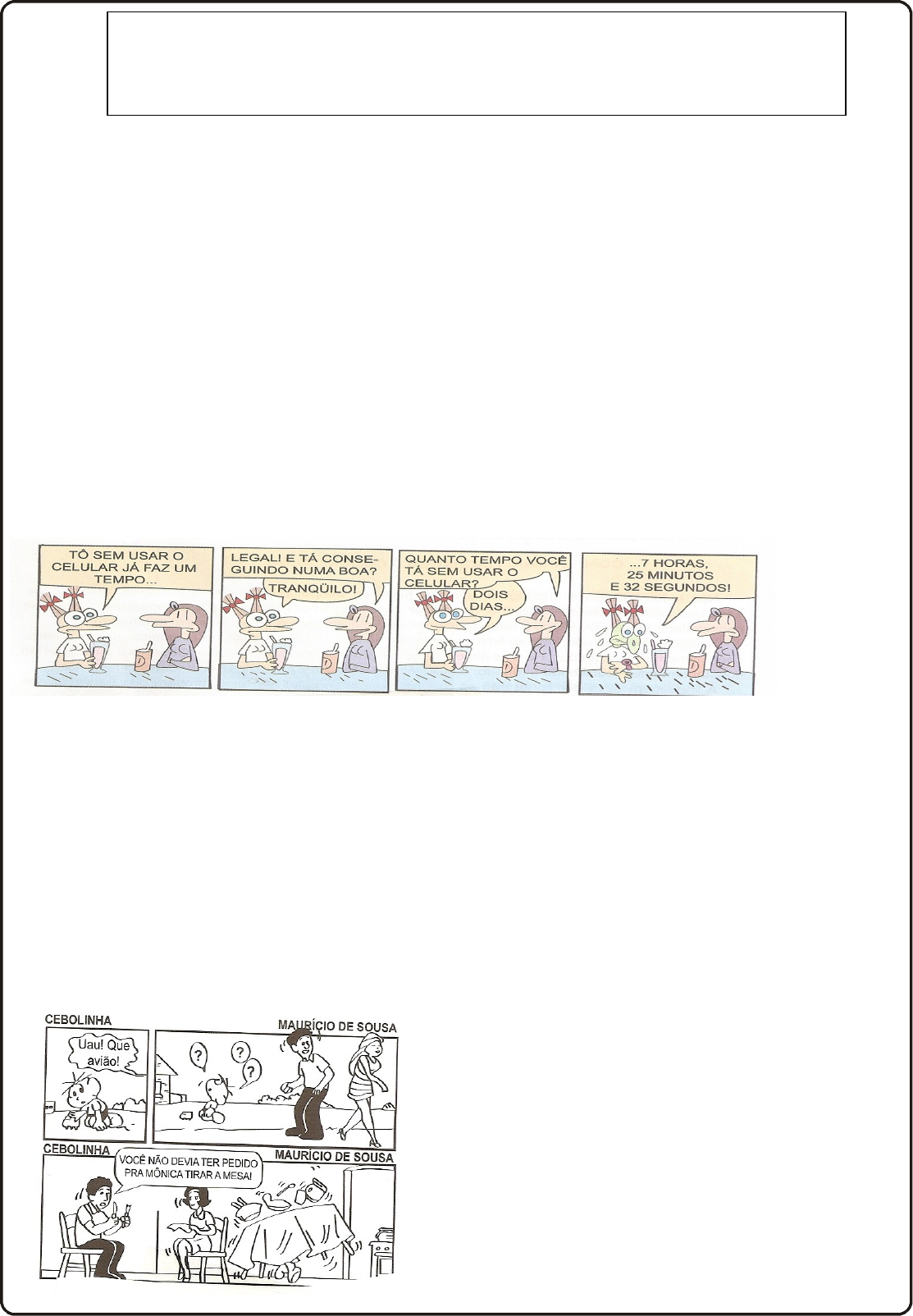 Colégio Cenecista “Prof. Sérgio Ferreira” Língua Portuguesa Professora – Catarina Vitor 1º ano 1º trimestre II. Elementos da comunicação A realização da comunicação depende de seis fatores principais. · EMISSOR (ou locutor) – quem fala ou transmite a mensagem a alguém. · RECEPTOR ( ou interlocutor) – quem recebe a mensagem comunicada pelo emissor. · MENSAGEM – a informação ou o texto transmitido pelo emissor. · CÓDIGO – o sistema de sinais que permite a compreensão da mensagem. · CANAL – o meio empregado para o envio da mensagem. · REFERENTE – o contexto ou o assunto da mensagem. 1. Na situação a seguir, registre os elementos básicos da comunicação. Emissor - _________________________________ Receptor - _______________________________ Mensagem - ____________________________________________________________________________ ___________________________________________________________________________ Código - ___________________________________ Canal - __________________________________ Referente - _____________________________________________________________________________ 2. Numa situação comunicativa, ocorrem, às vezes, problemas de compreensão que podem chegar a produzir efeito de humor. Estabeleça uma relação entre essa afirmativa e as situações verificadas nas tirinhas a seguir ________________________________________________________________________________________________________________________________________________________________________________________________________________________________________________________________________ III. Funções da Linguagem A realização da comunicação depende de seis fatores principais (elementos da comunicação). · EMISSOR (ou locutor) – quem fala ou transmite a mensagem a alguém. · RECEPTOR ( ou interlocutor) – quem recebe a mensagem comunicada pelo emissor. · MENSAGEM – a informação ou o texto transmitido pelo emissor. · CÓDIGO – o sistema de sinais que permite a compreensão da mensagem. · CANAL – o meio empregado para o envio da mensagem. · REFERENTE – o contexto ou o assunto da mensagem. Em todo processo de comunicação, a linguagem é expressa de acordo com a função que se deseja enfatizar. No momento em que se estabelece uma comunicação verbal, um dos fatores essenciais vistos acima acaba prevalecendo e determinando uma das funções da linguagem. Há seis funções da linguagem: emotiva, referencial, apelativa, fática, metalinguística e poética. · Função emotiva ou expressiva – o emissor procura expressar seu mundo emocional (marcado pela 1ª pessoa). SAMBA EM PRELÚDIO Eu sem você Não tenho porquê Porque sem você Não sei nem chorar... Vinícius de Moraes · Função referencial ou denotativa – essa função ocorre quando o destaque na comunicação é o referente. Segunda-feira, dia 20 de agosto, não haverá aula. · Função apelativa ou conativa - o objetivo da transmissão é persuadir o receptor ( uso de verbos no imperativo) COMPRE BATOM, COMPRE BATOM!! · Função fática – a intenção é estabelecer contato. Olá!, Bom dia!, Como vai? · Função metalinguística – tem como fator essencial o código. O objetivo da mensagem é referir se à própria linguagem. Curitiba: o nome da capital do Paraná vem de CURI(pinheiro) e TYBA (muito, grande quantidade). Curitiba, portanto, significa originariamente “lugar onde há muitos pinheiros”. · Função poética – ocorre quando se enfatiza a mensagem ou o texto, quando é trabalhada a própria forma da linguagem. Isto “Dizem que eu finjo ou minto Tudo o que escrevo. Não. Eu simplesmente sinto Com a imaginação. [...] Fernando Pessoa Atividades 1. Leia o texto para responder à questão. Prevenção contra assaltos “Como os assaltos crescem dia a dia, não podendo contê-los, a PM, sabiamente, dá conselhos aos cidadãos para serem menos assaltados: 1) Não demonstre que carrega dinheiro; 2) Jamais deixe objetos à vista, dentro do carro; 3) Levante todos os vidros, mesmo em movimento; 4) Não deixe documentos no veículo. (...)” Fernandes, Millôr. Prevenção contra assaltos Nesse fragmento, a função da linguagem predominante é: a) fática b) emotiva c) conativa d) referencial e) metalinguística 2. Assinale a opção que apresenta a função da linguagem predominante nos fragmentos a seguir: ( II ) Sentavam-se no que é de graça: banco de praça pública. __ E ali acomodados, nada os distinguia do resto do nada. Para a grande glória de Deus. Ele: __ Pois é. Ela: __ Pois é o quê? Ele: __ Eu só disse “pois é”! Ela: __ Mas “pois é” o quê? Ele: __ Melhor mudar de conversa porque você não me entende. Ela: __ Entender o quê? Ele: __ Santa Virgem, Macabéa, vamos mudar de assunto e já. Clarice Lispector. A hora da estrela. ( I ) Maria Rosa quase que aceitava, de uma vez, para resolver a situação, tal o embaraço em que se achavam. Estiveram um momento calados. __ Gosta de versos? __ Gosto... __ Ah... Pousou os olhos numa oleografia. __ É brinde de farmácia? É. __ Bonita... __ Acha? __ Acho... Boa reprodução... Orígenes Lessa. O feijão e o sonho. a) Poética b) Referencial c) Fática d) Emotiva e) Apelativa 3. Leia os dois textos a seguir e responda qual a função da linguagem predominante em cada um e justifique sua resposta. A A _______________________________ _______________________________ _______________________________ _______________________________ _______________________________ B _______________________________ _______________________________ _______________________________ _______________________________ “(...) Já pensei em te largar, já olhei tantas vezes pro lado mas quando penso em alguém, é por você que fecho os olhos Sei que nunca fui perfeito, mas por você eu posso ser até eu mesmo que você vai entender posso brincar de descobrir desenho em nuvens posso contar meus pesadelos e até minhas coisas fúteis.” B “