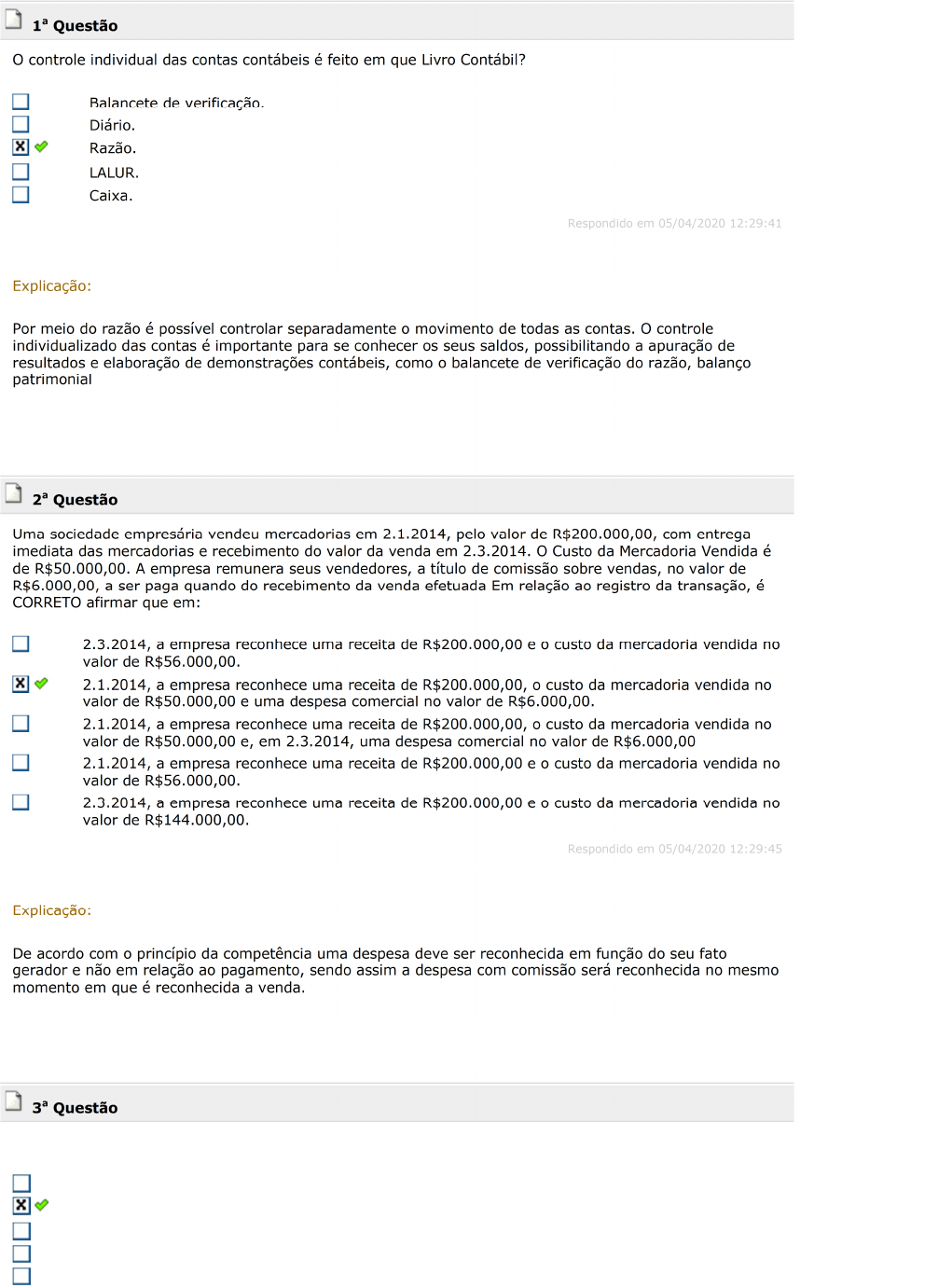 1a Questão O controle individual das contas contábeis é feito em que Livro Contábil? Balancete de verificação. Diário. Razão. LALUR. Caixa. Respondido em 05/04/2020 12:29:41 Explicação: Por meio do razão é possível controlar separadamente o movimento de todas as contas. O controle individualizado das contas é importante para se conhecer os seus saldos, possibilitando a apuração de resultados e elaboração de demonstrações contábeis, como o balancete de verificação do razão, balanço patrimonial 2a Questão Uma sociedade empresária vendeu mercadorias em 2.1.2014, pelo valor de R$200.000,00, com entrega imediata das mercadorias e recebimento do valor da venda em 2.3.2014. O Custo da Mercadoria Vendida é de R$50.000,00. A empresa remunera seus vendedores, a título de comissão sobre vendas, no valor de R$6.000,00, a ser paga quando do recebimento da venda efetuada Em relação ao registro da transação, é CORRETO afirmar que em: 2.3.2014, a empresa reconhece uma receita de R$200.000,00 e o custo da mercadoria vendida no valor de R$56.000,00. 2.1.2014, a empresa reconhece uma receita de R$200.000,00, o custo da mercadoria vendida no valor de R$50.000,00 e uma despesa comercial no valor de R$6.000,00. 2.1.2014, a empresa reconhece uma receita de R$200.000,00, o custo da mercadoria vendida no valor de R$50.000,00 e, em 2.3.2014, uma despesa comercial no valor de R$6.000,00 2.1.2014, a empresa reconhece uma receita de R$200.000,00 e o custo da mercadoria vendida no valor de R$56.000,00. 2.3.2014, a empresa reconhece uma receita de R$200.000,00 e o custo da mercadoria vendida no valor de R$144.000,00. Respondido em 05/04/2020 12:29:45 Explicação: De acordo com o princípio da competência uma despesa deve ser reconhecida em função do seu fato gerador e não em relação ao pagamento, sendo assim a despesa com comissão será reconhecida no mesmo momento em que é reconhecida a venda. 3a Questão O pagamento de uma dívida registrada no passivo circulante com atraso, acrescida de juros, ocasiona: Redução do PL, aumento do passivo circulante e redução do ativo circulante. Diminuição do passivo circulante, do ativo circulante e do Patrimônio Líquido. Aumento do PL e do passivo circulante e redução do ativo circulante. Redução do ativo e passivo circulante. Aumento do passivo circulante e do ativo circulante. Respondido em 05/04/2020 12:29:49 Explicação: O pagamento de uma dívida com juros por atraso pode ser representado pelo seguinte lançamento: D- Passivo (pela baixa da obrigação / Redução do Passivo) D- Despesa c/ juros (consequentemente irá reduzir o PL) C- Ativo (pela saída de recursos / Redução do Ativo) 4a Questão A Cia Comercial adquire de um fornecedor no mesmo município, a prazo, produtos para revenda, por R$28.000, com ICMS à alíquota de 18%, PIS à alíquota de 1,65% e COFINS à alíquota de 7,6%. O frete incidente no transporte e pago à vista pelo comprador foi de R$1.500. Com base nestes dados qual será o custo das mercadorias a ser registrado nos estoque e total de tributos a serem compensados em operações de venda destas mercadorias. R$21.370,00 e R$9.130,00 R$21.461,25 e R$8.038,75 R$20.370,00 e R$7.630,00 R$19.961,25 e R$8.038,75 R$21.870,00 e R$7.630,00 Respondido em 05/04/2020 12:29:54 Explicação: 28000 5040 18% ICMS 462 1,65% de PIS 2128 7,6% COFINS 20370 1500 Frete 21870 5a Questão Com relação ao encerramento do exercício, pode-se afirmar que: Os demonstrativos contábeis podem ser apurados independentemente da apuração do resultado do exercício Apuração e escrituração dos eventos que alteram a situação patrimonial, mas que não são documentados, devem ser omitidas A apuração do resultado poderá incluir eventos que não estejam de acordo com o regime de competência Os saldos indesejáveis podem ser excluídos da apuração sem nenhum reflexo no patrimônio Todos os saldos das contas do sistema patrimonial e de resultados, incluindo seus ajustes devem ser considerados por competência para a correta apuração do exercício Respondido em 05/04/2020 12:29:58 6a Questão O relatório onde estão relacionadas todas as contas utilizadas pela empresa, quer patrimonial quer de resultado, demonstrando seus débitos, créditos e saldos, é chamado de: Livro Diário DRE Balancete de Verificação Balanço Patrimonial Livro Razão Respondido em 05/04/2020 12:30:11 7a Questão O faturamento do mês de janeiro da Consultoria Controlar Ltda é de $ 200.000,00 e que no mesmo período a despesa financeira foi de R$ 15.000,00 e a receita de dividendos de R$ 20.000,00. A empresa tem ainda despesas compensáveis de PIS e Cofins que somam R$ 90.000,00 (crédito). Com base no texto, determine a contabilização e valor de despesa de PIS pelo sistema cumulativo: D. Despesa de Pis C. Pis a Pagar ...........................R$ 1.300,00 D. Pis a Pagar C. Despesa de Pisr ...........................R$ 1.430,00 D. Despesa de Pis C. Pis a Pagar ...........................R$ 1.332,50 D. Despesa de Pis C. Pis a Pagar ...........................R$ 1.815,00 D. Despesa de Pis C. Pis a Pagar ...........................R$ 1.430,00 Respondido em 05/04/2020 12:30:15 Explicação: De acordo com o regime não cumulativo, os impostos são calculados diretamente sobre o faturamento, sem possibilidade de compensação. A alíquota do pis cumulativo é de 0,65% 200.000 x 0,65% = 1.300,00 8a Questão Quando uma empresa comercial adquire mercadorias para revenda, a conta ser débita é classificada em que grupo do ativo? Despesa Antecipada Circulante investimento Diferido Imobilizado Respondido em 05/04/2020 12:30:21 Explicação: O Estoque de Mercadorias está classificado no Ativo Circulante.