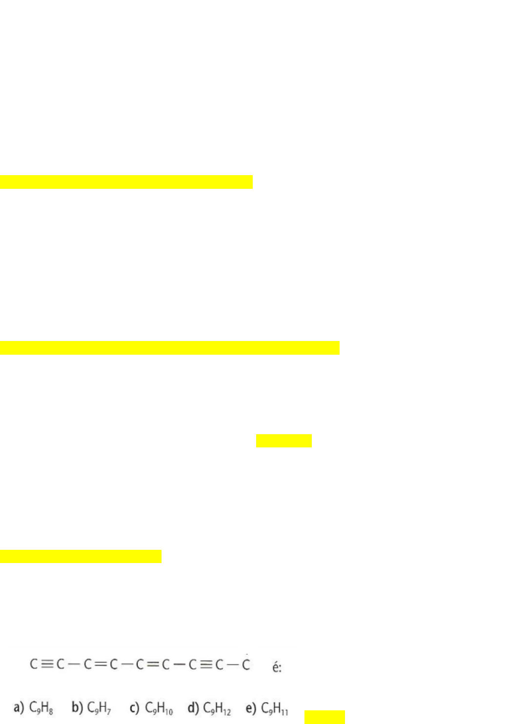 Lista de exercícios – Bioquímica Curso: Enfermagem 01) (UFAM-PSC) O pau-rosa, típico da região amazônica, é uma rica fonte natural do óleo essencial conhecido por linalol, o qual também pode ser isolado do óleo de alfazema. Esse óleo apresenta a seguinte fórmula estrutural: OH | H3C — C = CH — CH2 — CH2 — C — CH = CH2 | | CH3 CH3 Sua cadeia carbônica deve ser classificada como: a) acíclica, ramificada, saturada e heterogênea. b) acíclica, normal, insaturada e homogênea. c) alicíclica, ramificada, insaturada e homogênea. d) acíclica, ramificada, insaturada e homogênea. e) alicíclica, normal, saturada e heterogênea. 02) (ITE-SP) O composto orgânico de fórmula plana abaixo possui: CH3 | CH3 — C — CH — CH2 — CH3 | | CH3 CH3 a) 5 carbonos primários, 3 secundários, 1 terciário e 2 quaternários b) 3 carbonos primários, 3 secundários, 1 terciário e 1 quaternário. c) 5 carbonos primários, 1 secundário, 1 terciário e 1 quaternário. d) 4 carbonos primários, 1 secundário, 2 terciários e 1 quaternário. 03) (UFPA) No composto abaixo, quais as quantidades totais de átomos de carbono primário, secundário e terciário são, respectivamente, H3C | CH — CH — CH2 — CH — CH3 | | | H3C CH3 CH3 a) 5, 2 e 2. b) 5, 1 e 3. c) 4, 3 e 2. d) 3, 3 e 3. e) 2, 1 e 4. 04) Marque a alternativa que indica quantos carbonos saturados e insaturados, respectivamente, existem na fórmula: H2C …. C …. CH …. CH2 …. CH2 …. C …. N: a) 3 saturados e 3 insaturados. b) 2 saturados e 4 insaturados c) 1 saturado e 5 insaturados. d) 4 saturados e 2 insaturados e) 5 saturado e 1 insaturados. 05) (PUC – RS) A fórmula molecular de um hidrocarboneto com cadeia carbônica R: c9h8 06) Classifique em V ou F as sentenças relacionadas aos carbonos numerados da seguinte cadeia: a)( F ) os carbonos I, II e IV são primários b)( V ) o carbono III se classifica como secundário c)( V ) na cadeia há somente um carbono quaternário d)( V ) o carbono IV recebe a classificação de terciário e)( V ) existem 5 carbonos primários na cadeia 07) A substância responsável pelo sabor característico da laranja apresenta a seguinte estrutura simplificada: O ║ C ─ C │ O ─ C ─ C ─ C ─ C ─ C ─ C ─ C ─ C a) Qual é o número de átomos de hidrogênio presentes em uma molécula dessa substância? 20 CARBONOS b) Qual a fórmula molecular deste composto? H3C-COO-C8H17 08) (Fuvest) A vitamina K3 pode ser representada pela fórmula: Quantos átomos de carbono e hidrogênio existem em uma molécula desse composto? a)1 e 3 b)3 e 3 c)9 e 8 d)11 e 8 e)11 e 10 10) Complete as seguintes fórmulas estruturais, acrescentando os átomos de hidrogênio que estão faltando: 11) (UFF RJ) As substâncias a seguir indicadas provocam aumento da massa muscular e diminuição da gordura dos atletas. O uso indiscriminado dessas substâncias, porém, pode provocar efeitos colaterais sérios. Observe as estruturas. I) O H C H 3 O a b N a n d i o l o n e ( 1 ) II) D i a n a b o l O H C H 3 O C H 3 C H 3 c d ( 2 ) a) Quais as classificação dos carbonos assinalados (a;b e c; d) nas duas moléculas? A e B são saturados, cíclicos C e D são insaturados, acíclicos b) qual a fórmula molecular das substâncias: I) C18H26O2 II) C20H28O2 12) (UERJ) A nicotina, em mulheres grávidas fumantes, atravessam a barreira da placenta, alcançando o embrião e aumentando-lhe a frequência cardíaca, isto é, o "embrião fuma". Observe a estrutura da nicotina, representada abaixo: N N C H 3 Os carbonos secundários e terciários presentes nessa estrutura são em número de: a) 2 e 5 b) 10 e 1 c) 5 e 3 d) 5 e 1 e)10 e 3 13) (Valor 0,1) (UFMT) A testosterona, hormônio sexual masculino, é responsável pela maior massa muscular dos homens em relação às mulheres, o que é denominado efeito anabólico da testosterona. Devido a esse efeito, alguns atletas começaram a fazer uso de injeções de testosterona, na tentativa de aumentar a massa muscular, a força e a resistência. A fórmula estrutural da testosterona é: O H C H 3 C H 3 O A partir das informações acima, pode-se afirmar que a testosterona a) é um composto aromático. b) possui a fórmula molecular C19H7O2. c) possui os grupamentos funcionais relativos às funções químicas: álcool e cetona. d) possui trimetil ligado aos carbonos saturados. e) apresenta aldeído e ácido carboxílico na estrutura. 14) Relacione a identificação com sua respectiva classificação: I- C H 3 C H C H 2 C H 3 O C H 3 a) ( 5 ) saturada, homocíclica, normal II- C H 2 C H 2 b) ( 3 ) insaturada homocíclica, normal III- c) ( 4 ) saturada, normal, homogênea IV- C H 3 C H 2 C H 3 d) ( 2 ) insaturada, normal, homogênea V- e) ( 1 ) saturada, ramificada, heterogênea 1) 16) O petróleo é composto, principalmente, por hidrocarbonetos, que são substâncias orgânicas compostas, apenas por: a) sulfato de sódio b) carbono e hidrogênio c) ouro e cobre d) conservantes e) microorganismos 17) Classifique as cadeias carbônicas em relação: Quanto ao fechamento da cadeia: *Aberta (acíclica) ou fechada (cíclica) ou Aromática Disposição dos átomos dentro da cadeia: * Normal ou Ramifica Tipo de ligação entre carbonos *Saturada ou Insaturada Presença de átomos de outros elementos entre os carbonos (heteroátomos): *Homogênea ou Heterogênea (cadeias abertas) *Homocíclica ou Heterocíclica (cadeias fechadas) a) CH 3 CH 2 CH 2 CH 3 acíclica, normal, saturada, homogenia b) CH 3 CH CH 2 acíclica, normal, insaturada, homogenia c) CH 3 C CH CH 3 CH 3 acíclica, ramificada, insaturada, homogênea d) acíclica, ramificada, saturada, homogênea e) O acíclica, ramificada, saturada, heterogênea f) NH 2 acíclica, ramificada, insaturada, homogênea g) cíclica, normal, insaturada, homocíclica h) N CH 3 H cíclica, ramifica, saturada, heterocíclica 28) Classifique as cadeias carbônicas em: *Alcano * Alceno * Alcino * Alcadieno a) _ALCANO ________________