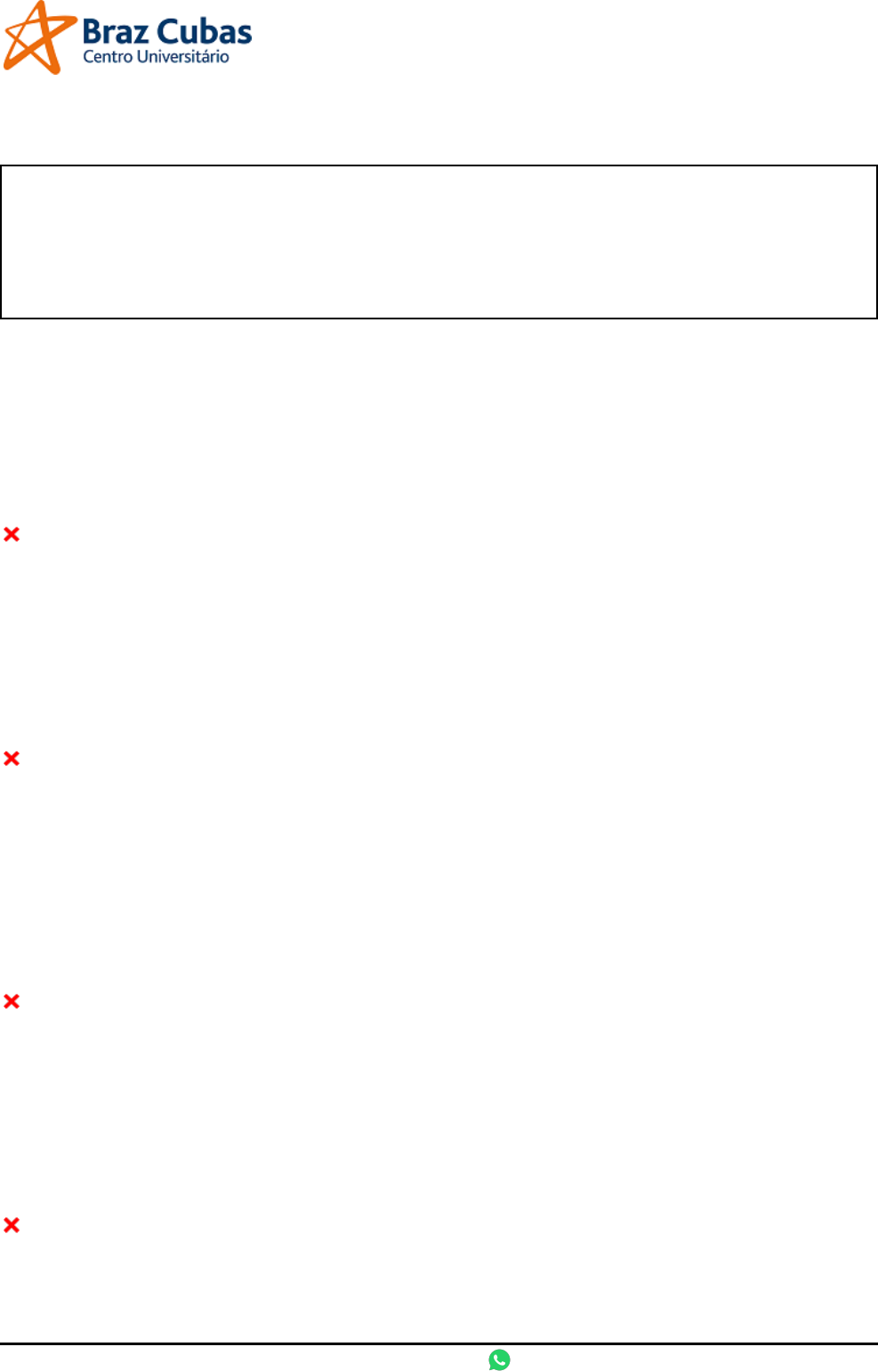 Revisão de Prova - Final Nome: Alex Sander da Conceição Barbosa RGM: 410076 Curso: Lingua Portuguesa: Redação e Oratória Turma: LIRE1908 Disciplina: IESDE01170 - CONCORDÂNCIA E REGÊNCIA Data geração: 05/03/2020 10:26:28 - Data conclusão: 09/03/2020 10:09:51 Nota: 0.00 Questão 1 (Peso: 2.00): Assinale a alternativa que possui inadequação formal quanto às regras da concordância nominal privilegiadas pela norma culta da língua. A) São necessárias as suas observações no corpo do texto. B) O rapaz e a moça apaixonados lançaram juras de amor. C) É necessário comida para alimentar os refugiados. D) A blusa está meia amassada. E) Não irei responder esta questão. Questão 2 (Peso: 2.00): Assinale a alternativa correta sob o ponto de vista da regência-padrão da língua culta. A) Aspiramos ao perfume das rosas todos os dias. B) Fui na secretaria buscar minhas notas. C) Assistimos ao filme que passou ontem na TV. D) Garoto, obedeça seus pais! E) Não irei responder esta questão. Questão 3 (Peso: 2.00): Assinale a alternativa que completa corretamente a frase "De vez em quando_____________ -se ruídos que _________________perturbar o silêncio em que eu e ela___________________. A) Ouviam - vinham - nos perdíamos. B) Ouvia - vinham - se perdiam. C) Ouviam - vinha - nos perdíamos. D) Ouvia - vinha - nos perdíamos. E) Não irei responder esta questão. Questão 4 (Peso: 2.00): Assinale a alternativa que traz a afirmação correta sobre os mecanismos linguísticos que configuram a concordância nominal. A) A marcação gramatical do gênero feminino e masculino coincide com a distinção semântica de sexo feminino e masculino. B) O sintagma nominal, quando assume a função de sujeito da oração, nunca está subordinado a outro termo da língua. C) Um sintagma nominal só é bem formado se não houver discordância de pessoa entre o núcleo do sintagma e seus constituintes. D) A concordância nominal se caracteriza pela harmonização de flexões de pessoa entre termos da língua com valor nominal. E) Não irei responder esta questão. Questão 5 (Peso: 2.00): BRAZCUBAS – Pós Graduação EAD – (11) 4791-8231 | (11) 97640-0420 – www.brazcubas.br 1 Em uma propaganda de pomada contra assaduras, veiculada pela revista Veja, aparece em destaque a frase: "Quem protege de verdade não desgruda do bebê". Analise essa frase e assinale a alternativa correta. A) A frase contém ambiguidade sintática e léxica. B) A frase não contém ambiguidade. C) A frase contém uma ambiguidade léxica. D) A frase contém uma ambiguidade sintática. E) Não irei responder esta questão. BRAZCUBAS – Pós Graduação EAD – (11) 4791-8231 | (11) 97640-0420 – www.brazcubas.br 2