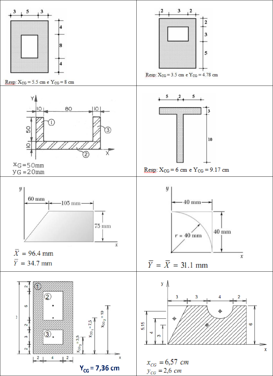 1) Para as figuras abaixo determine o Centro de gravidade; a) b) c) R: d) e) R: f) R: g) R:Na direção x há simetria h) R