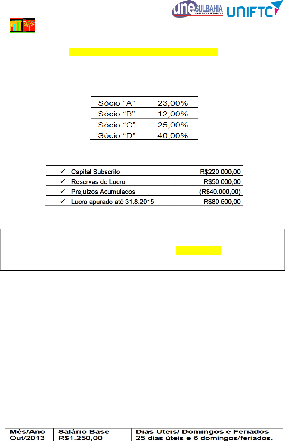 ( Prof. Helton Paiva ) ATIVIDADE PRÁTICA DE PERÍCIA CONTÁBIL – 7º CONTÁBEIS Maílla C. Salvador – 7° Ciências Contábeis 1) Os Sócios "A", "C" e "D" de uma Sociedade Empresária decidiram excluir o Sócio "B" da sociedade.Para esse fim, solicitaram que o contador da empresa apresentasse o Balanço Patrimonial Especial em 31 de agosto de 2015, visando demonstrar ao Sócio "B" a sua parte nos haveres.O quadro de participação societária era assim constituído: Após os ajustes, foi apresentado o Balanço Patrimonial Especial. O Patrimônio Líquido ficou assim representado: Pede-se: Com base nos dados acima, em uma Perícia Contábil de Apuração de Haveres, calcule o valor apurado para ser pago ao Sócio "B". R: Total do Patrimônio Líquido = R$ 310.500,00 Sócio B - 12% x R$ 310.500,00 = R$ 37.260,00 2) Uma Sociedade Empresária foi citada para apresentar os cálculos periciais referentes a um processo trabalhista. A sentença proferida em 1º grau, às folhas 59 a 67 dos autos, condenou a reclamada a pagar ao reclamante: · Horas extras diurnas, com 50% de acréscimo, 35 horas em outubro/2013, com integração no Repouso Semanal Remunerado – RSR. · Atualização monetária pelo índice fixo de 27%, abrangendo todo o período da verba reclamada até a data do laudo. · Juros de mora a contar da propositura da ação, que ocorreu em 1º de abril de 2015. Informações Adicionais: · A jornada de trabalho do reclamante era de 220 horas mensais. · A propositura da ação ocorreu em 1º de abril de 2015. · O laudo foi finalizado em 31 de julho de 2015. · Os Juros de Mora sobre o valor atualizado serão de 1% ao mês, regime de capitalização simples. · O salário, a quantidade de dias úteis e os domingos e feriados estão apresentados no quadro abaixo: Pede-se: De acordo com os dados apresentados, calcule o valor total devido ao reclamante de demonstre a memória dos cálculos para verificação dos resultados: R: Cálculo das Horas extras e Acréscimo (PARTE 1) Hora trabalhada – R$ 1.250/220 horas = R$ 5,68 Hora extra diurna – 35 horas x R$5,68 = R$ 198,86 Acréscimo de 50% - R$198,86 x 50% = R$ 99,43 Hora extra + acréscimo – R$ 198,86 + R$ 99,43 = R$ 298,30 Repouso Semanal Remunerado – (25 dias uteis e 6 domingos e feriados) RSR – (R$ 298,30/25 dias) x 6 dias = R$ 71,59 Total de hora extra – R$ 298,30 + R$ 71,59 = R$ 369,89 Cálculo do Juros (PARTE 2) Abril – Julho = 4% Juros – R$ 369,89 x 4% = R$ 14,80 Hora extra + Juros – R$ 369,89 + R$ 14,80 = R$ 384,68 Cálculo Atualização monetária (PARTE 3) 27% sobre o valor da Hora extra atualizada Atualização monetária – R$ 364,68 x 27% = R$ 103,86 Total do valor devido – R$ 364,68 + R$ 103,86 = R$ 488,55