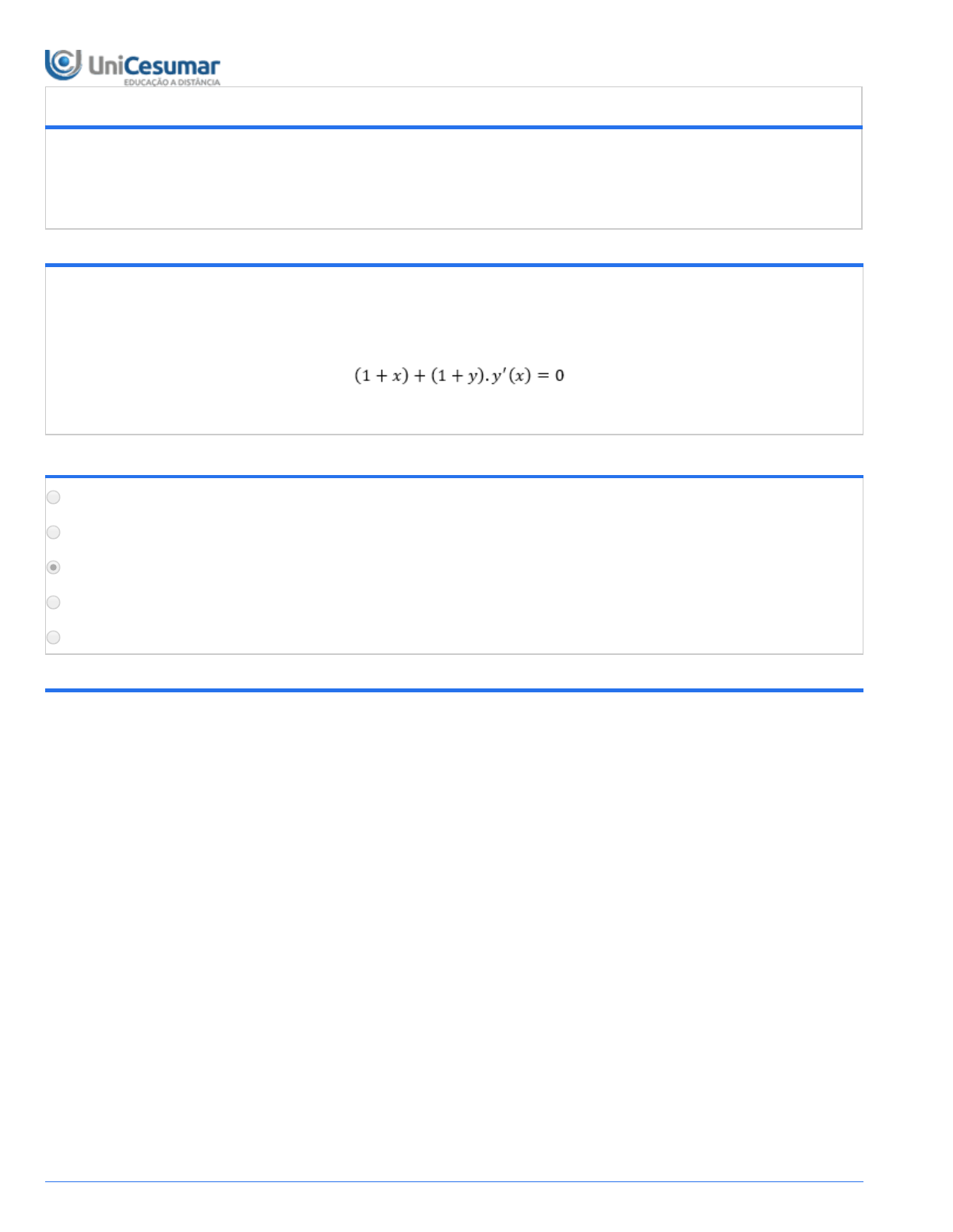 13/04/2020 Unicesumar - Ensino a Distância 1/8 ATIVIDADE 4 - ENG PROD - CÁLCULO DIFERENCIAL E INTEGRAL II - 51/2020 Período:30/03/2020 08:00 a 13/04/2020 23:59 (Horário de Brasília) Status:ABERTO Nota máxima:0,50 Gabarito:Gabarito será liberado no dia 14/04/2020 00:00 (Horário de Brasília) Nota obtida: 1ª QUESTÃO As EDOS de primeira ordem envolvem uma grande gama de modelos de funções e, basicamente, existem 3 métodos de resolução dessas EDOs. Resolva a EDO abaixo através do método da equação EXATA. O resultado será: ALTERNATIVAS x + y = C x² + y² = C x + x²/2 + y + y²/2 =C x² - y² = C x + y + x² + y² = C 2ª QUESTÃO 13/04/2020 Unicesumar - Ensino a Distância 2/8 O sistema massa-mola é um excelente exemplo físico para a aplicação de métodos de resolução de EDO de segunda ordem. Suponha que se tenha uma mola presa ao teto de uma sala e uma bola de massa “m” presa à mola. Para esse caso, a equação diferencial obtida é: Estão corretas: ALTERNATIVAS I, II e III Apenas I Apenas II Apenas III Apenas I e II 3ª QUESTÃO As equações diferenciais ordinárias de segunda ordem (EDOs de segunda ordem) são equações muito recorrentes nas avaliações de processos físicos, que envolvam um grandeza e suas variações, como em problemas envolvendo posição, velocidade e aceleração. Nesse sentido, é importante saber reconhecê-las. Averigue as EDOS abaixo: Estão corretas: 13/04/2020 Unicesumar - Ensino a Distância 3/8 ALTERNATIVAS I, II e III Apenas I Apenas II Apenas III Apenas I e II 4ª QUESTÃO As EDOS de primeira ordem envolvem uma grande gama de modelos de funções e, basicamente, existem 3 métodos de resolução dessas EDOs. Resolva a EDO abaixo através do método das variáveis separáveis. O resultado será: ALTERNATIVAS y² = 2x³/3 + C y = x y² = x³ + C y = x² y = x + C 5ª QUESTÃO As EDOS de primeira ordem envolvem uma grande gama de modelos de funções e, basicamente, existem 3 métodos de resolução dessas EDOs. Resolva a EDO abaixo através do método do fator integrante. O resultado será: ALTERNATIVAS x + c x² + cx x² + c/x x/2 + c/x x/2 13/04/2020 Unicesumar - Ensino a Distância 4/8 6ª QUESTÃO A equação de Legendre está entre uma das equações diferenciais ordinárias mais importantes da física matemática. Ela normalmente surge em aplicações na física e engenharia envolvendo simetria esférica. Um exemplo muito famoso em que a equação de Legendre aparece é na mecânica quântica, associada à solução da famosa equação de Schrödinger. Julgue as afirmações abaixo: Elaborado pelo Professor, 2019 Estão corretas: ALTERNATIVAS Apenas I, II e III. Apenas II, III e IV. Apenas I, III e IV. Apenas I, II e IV. I, II, III e IV. 7ª QUESTÃO 13/04/2020 Unicesumar - Ensino a Distância 5/8 Em equações diferenciais ordinárias de segunda ordem não homogêneas em que a parte não homogênea corresponda a uma função básica (polinomial, exponencial, trigonométrica elementar) a maneira mais adequada de se obter a solução do problema é através da variação de parâmetros. O mesmo procedimento é útil quando as soluções homogênea e particular são análogas. Considerando essa informação, julgue as afirmações abaixo: Elaborado pelo Professor, 2019 Estão corretas: ALTERNATIVAS Apenas I, II e III. Apenas II, III e IV. Apenas I, II e IV. Apenas I, III e IV. I, II, III e IV. 8ª QUESTÃO 13/04/2020 Unicesumar - Ensino a Distância 6/8 Uma sequência numérica é uma função real com domínio N que, a cada n associa um número real a . Os números a são chamados termos da sequência. É comum indicar uma sequência escrevendo apenas uma lista ordenada de seus termos. A série por outro lado, está relacionada à somatória de termos de uma determinada sequência. Sobre sequências e séries, julgue as afirmações abaixo: Elaborado pelo Professor, 2019 Estão corretas: ALTERNATIVAS Apenas I e III. Apenas II e III. Apenas I, II e IV. Apenas I e IV. Apenas I, II e III. 9ª QUESTÃO n n 13/04/2020 Unicesumar - Ensino a Distância 7/8 Os problemas físicos que podem ser representados por EDOs de segunda ordem possuem duas constantes indeterminadas em sua solução. Uma possibilidade de se determinar essas constantes é aplicar à equação as condições iniciais, o que é conhecido como problema de valor inicial (PVI). Considere o PVI abaixo: Elaborado pelo Professor, 2019 Estão corretas: ALTERNATIVAS Apenas I, III e IV. Apenas II, III e IV. Apenas I e III. Apenas II e IV. Apenas I, II e IV. 10ª QUESTÃO 13/04/2020 Unicesumar - Ensino a Distância 8/8 As equações diferenciais ordinárias de segunda ordem não são tão facilmente resolvidas quanto as equações diferenciais ordinárias de primeira ordem, que podem ser de variáveis separáveis, exatas ou mesmo solucionadas através do fator integrante. Para EDOs de segunda ordem o método clássico de resolução se dá por meio do polinômio característico. Sobre EDOs de 2ª ordem, afirma-se: Elaborado pelo Professor, 2019 Estão corretas: ALTERNATIVAS Apenas I, II e III. Apenas II, III e IV. Apenas I, II e IV. Apenas I, III e IV. I, II, III e IV.
