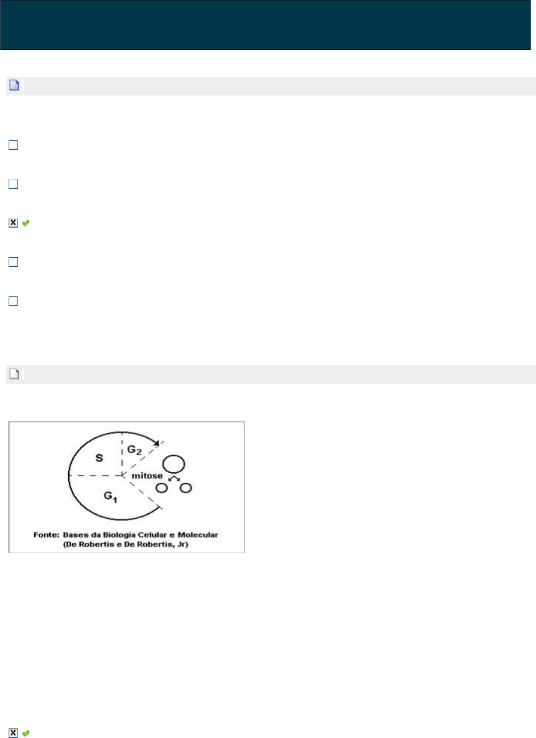 Disc.: GENÉTICA Aluno(a): Acertos: 10,0 de 10,0 14/04/2020 1a Questão (Ref.:201915350280) Acerto: 1,0 / 1,0 (FUC-MT) Cruzando-se ervilhas verdes vv com ervilhas amarelas Vv, os descendentes serão: 100% vv, verdes. 25% Vv, amarelas; 50% vv, verdes; 25% VV, amarelas. 50% Vv, amarelas; 50% vv, verdes. 100% VV, amarelas. 25% vv, verdes; 50% Vv, amarelas; 25% VV, verdes. Respondido em 14/04/2020 08:27:14 2a Questão (Ref.:201915439307) Acerto: 1,0 / 1,0 Sobre o esquema a seguir que representa o ciclo celular, são feitas 3 afirmativas: I - A duplicação do DNA acontece no período S. II - A síntese de proteínas é mais intensa durante a mitose. III - As células resultantes da mitose diferem da célula-mãe, devido ao fenômeno do "crossing-over". Está(ão) correta(s) a(s) afirmativa(s): Apenas I. Apenas II. Apenas III. Apenas I e II. Apenas II e III. Respondido em 14/04/2020 08:38:19 3a Questão (Ref.:201915350377) Acerto: 1,0 / 1,0 (Fazu-MG) Entre as frases a seguir, em relação à divisão celular por mitose, uma é incorreta. Aponte-a: A célula mãe dá origem a duas células filhas com metade do número de cromossomos. Na metáfase, todos os cromossomos, cada um com duas cromátides, encontram-se no equador da célula em maior grau de condensação. Ocorre nas células somáticas, tanto de animais como de vegetais. É um processo muito importante para o crescimento dos organismos. As células filhas são idênticas às células mãe. Respondido em 14/04/2020 08:40:34 4a Questão (Ref.:201915413244) Acerto: 1,0 / 1,0 Com base no conteúdo estudado sobre Biologia Molecular, conceitos de DNA e RNA e suas funções dentro de uma célula, assinale a alternativa que melhor expressa o conceito de gene: é uma sequência de bases nitrogenadas do RNA utilizada para a síntese de proteína. é um trecho de DNA utilizado para a produção de lipídios e açúcares nas células. é um segmento de RNA que contém informação para a determinação de uma característica. é uma sequência de bases nitrogenadas do DNA a partir da qual ocorrerá transcrição. é o nome dado ao conjunto de todas as bases nitrogenadas existente no interior celular. Respondido em 14/04/2020 08:50:10 5a Questão (Ref.:201915350407) Acerto: 1,0 / 1,0 O fator de crescimento é um sinal químico proveniente de células vizinhas que instrui a célula alvo a crescer e dividir. Poderíamos dizer que a célula nota o fator de crescimento e decide dividir-se, mas como esses processos realmente acontecem? A célula detecta o fator de crescimento por meio de uma ligação física entre o fator de crescimento e o receptor proteico na matriz extracelular. A ligação do fator de crescimento faz com que o receptor mude de forma, desencadeando uma série de eventos físicos na célula que inibem proteínas denominadas fatores de tradução. A célula detecta o fator de crescimento por meio de uma ligação física entre o fator de crescimento e o receptor proteico na superfície da célula. A ligação do fator de crescimento faz com que o receptor mude de forma, desencadeando uma série de eventos químicos na célula que inativam proteínas denominadas fatores de transcrição. A célula detecta o fator de crescimento por meio de uma ligação física entre o fator de crescimento e o receptor proteico na superfície da célula. A ligação do fator de crescimento faz com que o receptor mude de forma, desencadeando uma série de eventos químicos na célula que ativam proteínas denominadas fatores de transcrição. A célula detecta o fator de crescimento por meio de uma ligação física entre o fator de crescimento e o receptor glicídico na superfície da célula. A ligação do fator de crescimento faz com que o receptor não mude de forma, desencadeando uma série de eventos químicos na célula que ativam proteínas denominadas fatores de tradução. A célula detecta o fator de crescimento por meio de uma ligação química entre o fator de crescimento e o receptor lipídico na superfície da célula. A ligação do fator de crescimento faz com que o receptor não mude de forma, desencadeando uma série de eventos químicos na célula que inativam proteínas denominadas fatores de transcrição. Respondido em 14/04/2020 08:59:15 6a Questão (Ref.:201915350485) Acerto: 1,0 / 1,0 (UNIFESP-SP) Em abril de 2003, a finalização do Projeto Genoma Humano foi noticiada por vários meios de comunicação como sendo a decifração do código genético humano. A informação, da maneira como foi veiculada, está: correta, porque agora se sabe toda a sequência de nucleotídeos dos cromossomos humanos. correta, porque agora se sabe toda a sequência de genes dos cromossomos humanos. errada, porque o código genético diz respeito à correspondência entre os códons do DNA e os aminoácidos nas proteínas. errada, porque o Projeto decifrou os genes dos cromossomos humanos, não as proteínas que eles codificam. errada, porque não é possível decifrar todo o código genético, existem regiões cromossômicas com alta taxa de mutação. Respondido em 14/04/2020 09:01:18 7a Questão (Ref.:201915350512) Acerto: 1,0 / 1,0 (PUC-PR) Analisando o heredograma a seguir, conclui-se que dois dos dez indivíduos são vítimas de uma anomalia causada pela ação de um gene recessivo. Assinale a opção que contém os números que representam indivíduos cujos genótipos não podem ser determinados: 1, 2, 5, 6, 7, 8 e 10 1, 2, 3, 5 e 6 3, 8 e 10 7, 8 e 10 5, 6 e 7 Respondido em 14/04/2020 09:03:49 8a Questão (Ref.:201915382799) Acerto: 1,0 / 1,0 As mutações introduzem constantemente variação genética nas populações. Nos casos em que essas variações aumentam o valor adaptativo, indivíduos portando a variação têm mais oportunidade de sobreviver e se reproduzir do que aqueles com características de menor valor adaptativo. Esse conceito é conhecido como: Mutualismo. Seleção artificial. Seleção natural. Equilíbrio pontuado. G