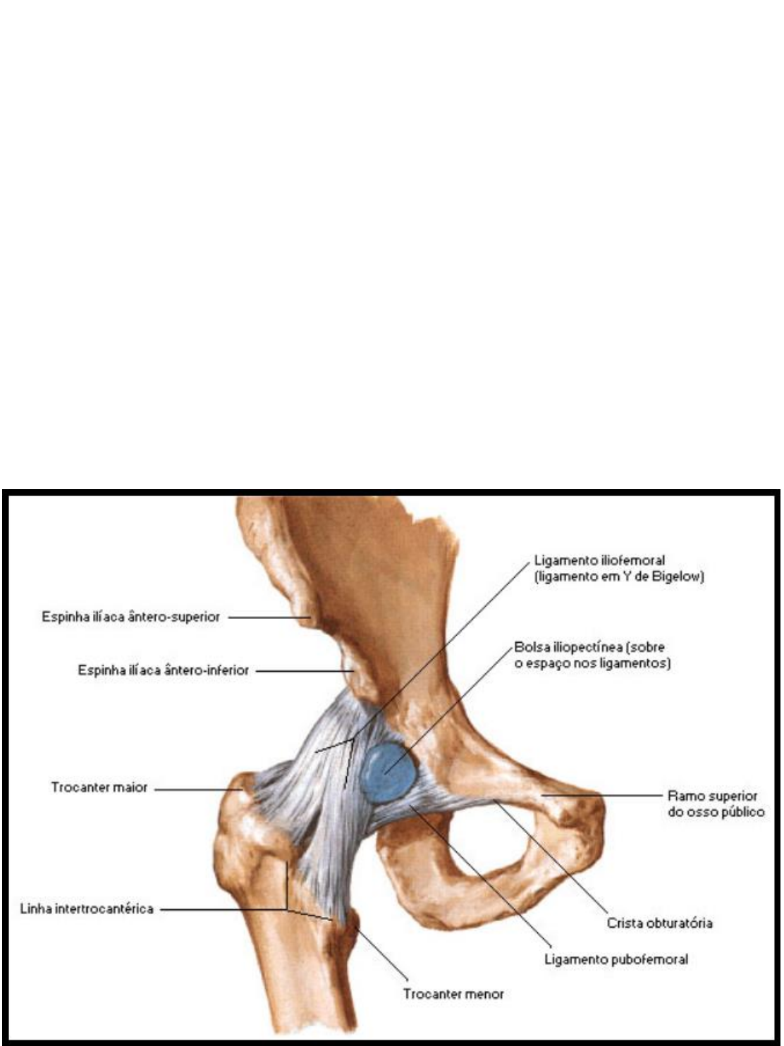 QUADRIL É uma articulação do tipo esférica formada pela cabeça do fêmur e a cavidade do acetábulo. Os ligamentos que formam essa articulação são: Cápsula Articular – A cápsula articular é forte e espessa e envolve toda a articulação coxo-femoral. É mais espessa nas regiões proximal e anterior da articulação, onde se requer maior resistência. Posteriormente e distalmente é delgada e frouxa. Ligamento Iliofemoral – É um feixe bastante resistente, situado anteriormente à articulação. Está intimamente unido à cápsula e serve para reforçá-la. Ligamento Pubofemoral – Insere-se na crista obturatória e no ramo superior da pube; distalmente, funde-se com a cápsula e com a face profunda do feixe vertical do ligamento iliofemoral. Ligamento Isquiofemoral – Consiste de um feixe triangular de fibras resistentes, que nasce no ísquio distal e posteriormente ao acetábulo e funde-se com as fibras circulares da cápsula. Ligamento da Cabeça do Fêmur – É um feixe triangular, um tanto achatado, inserindo-se no ápice da fóvea da cabeça do fêmur e na incisura da cavidade do acetábulo. Tem pequena função como ligamento e algumas vezes está ausente. Orla Acetabular – É uma orla fibrocartilagínea inserida na margem do acetábulo, tornando assim mais profunda essa cavidade. Ao mesmo tempo protege e nivela as desigualdades de sua superfície, formando assim um círculo completo que circunda a cabeça do fêmur e auxilia na contenção desta em seu lugar. Ligamento Transverso do Acetábulo – É uma parte da orla acetabular, diferindo dessa por não ter fibras cartilagíneas entre suas fibras. Consiste em fortes fibras achatadas que cruzam a incisura acetabular.