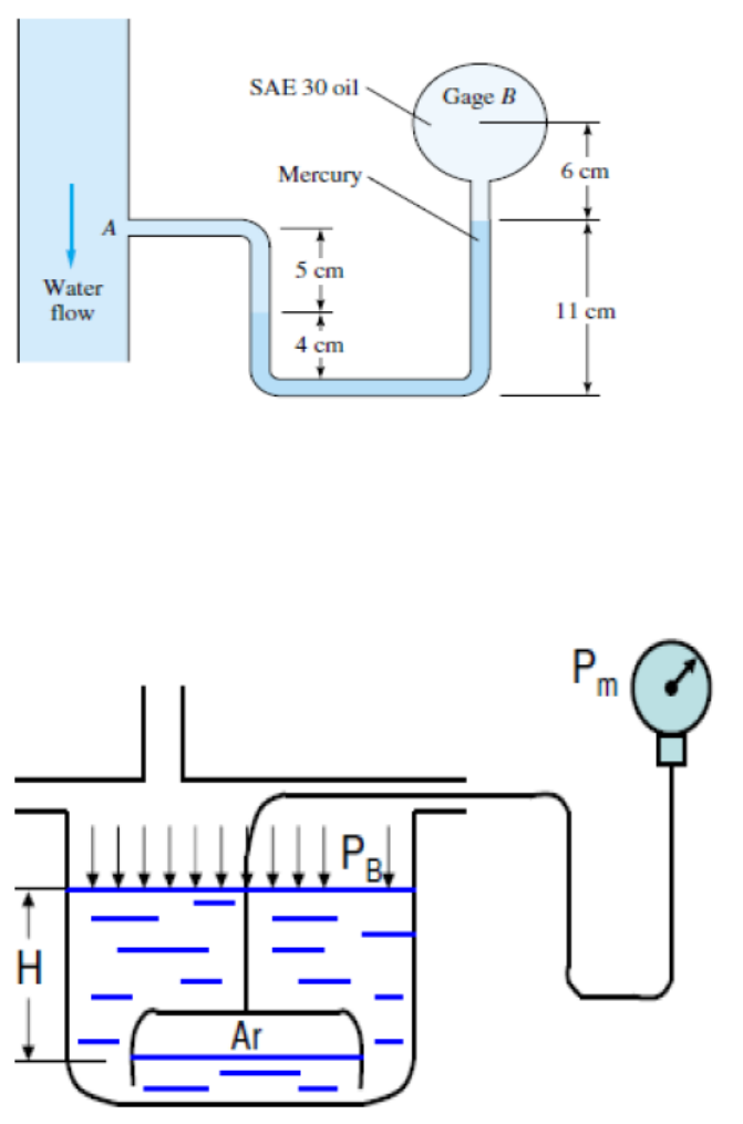 FICHA DE EXERCICIOS IV 1.A pressão no barómetro B serve para medir a pressão de fluxo de água no ponto A. Se a pressão no barómetro for de 87kPa, qual será a pressão em A em kPa? Assume todos fluídos a uma temperatura de 20ºC. Para medir o nível de líquido num reservatório usa-se um dispositivo que se chama Sino de Ar (ver a figura ao lado). A pressão do ar dentro do sino depende da coluna do líquido H no reservatório e mede-se pelo manómetro. Determinar a altura do líquido cuja massa específica é 960 / 3, se a leitura do manómetro for de15.4kPa. 3. A figura abaixo representa um descarregador automático AOB. O ângulo AOB é rígido. OA=150cm e OB=180cm. AO pesa 3000kgf enquanto que OB pesa 3600kgf. A dimensão b, normal ao desenho, é de 4m. Desprezar o atrito em O e em B. O contrapeso situa-se a OW=1,65m. O descarregador está em equilíbrio quando o nível de água se encontra nas condições indicadas na figura. Determinar: a) A força devido a pressão de água sobre OA; b) O centro de pressão sobre AO (distância a partir de O); c) A força de pressão da água sobre OB; d) O centro de pressão em OB (distância a partir de O); e) O valor do contrapeso W; e f) O valor da reacção em O: direcção e sentido. 4. A figura abaixo mostra uma massa cilíndrica que flutua sobre a água e que se encosta na ponta de uma parede de betão sob acção da pressão de óleo que banha a metade do hemisfério superior. A massa cilíndrica comporta-se como uma barragem. Sabe-se que =800 / 3 e R=2m. Determinar: a) A força por metro linear que comprime a massa cilíndrica contra a barragem b) O peso unitário da massa c) A massa específica do corpo cilíndrico Data de entrega: 19/04/2020 E – mail: leviodasilva09@gmail.com Whatsapp: 847091577 mailto:leviodasilva09@gmail.com