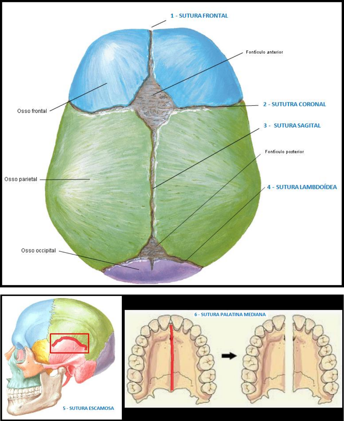 1 - SUTURA FRONTAL - 2 - SUTUTRA CORONAL - 3 - SUTURA LAMBDOÍDEA 4 - SUTURA SAGITAL - 5 - SUTURA ESCAMOSA - 6 - SUTURA PALATINA MEDIANA