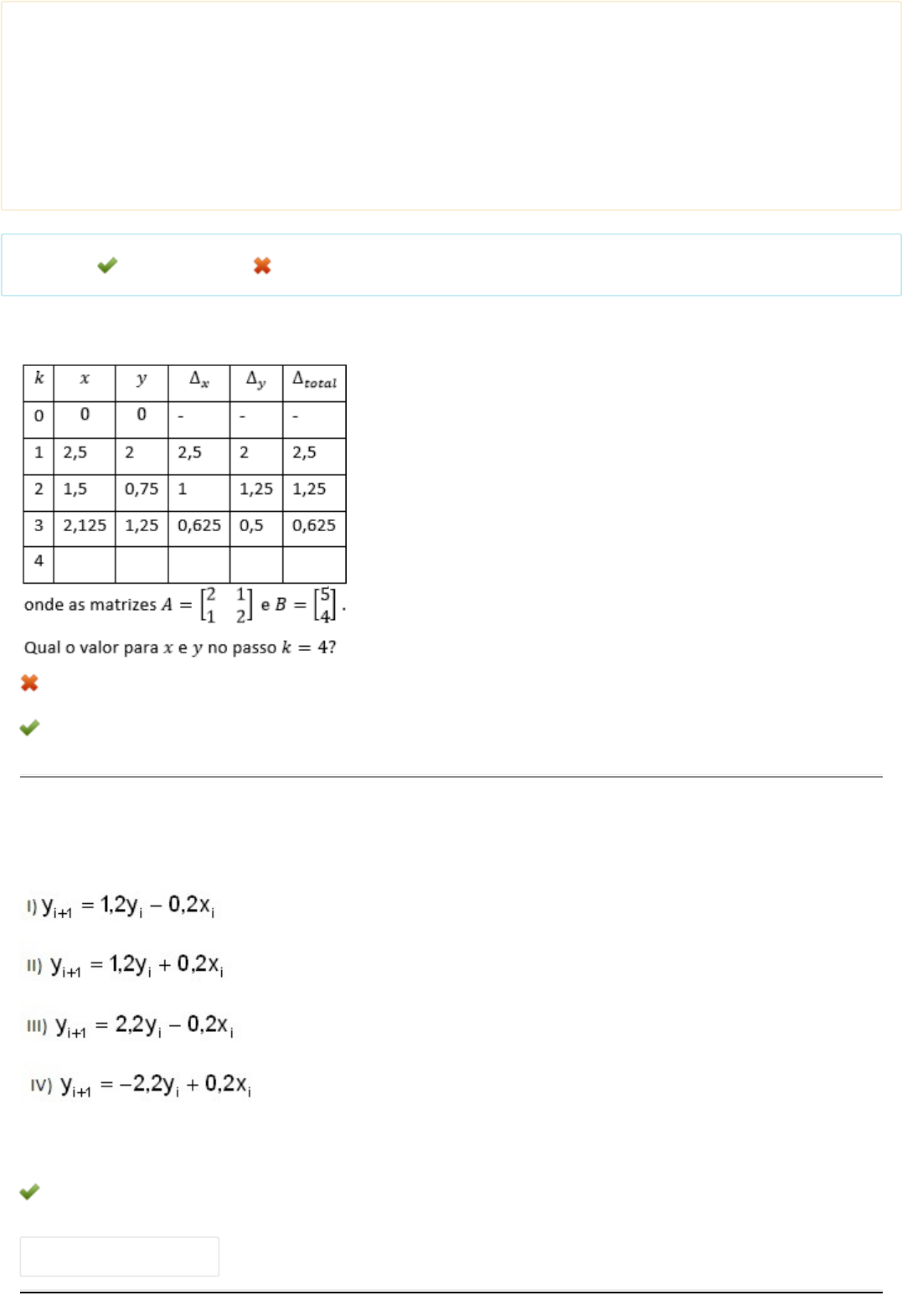 Acadêmico: Disciplina: Avaliação: Cálculo Numérico (MAT28) Avaliação Final (Objetiva) - Individual Semipresencial ( Cod.:460824) ( peso.:3,00) Prova: 12412052 Nota da Prova: 7,00 Legenda: Resposta Certa Sua Resposta Errada 1. Usando o método de Gauss-Seidel, podemos resolver sistemas lineares com uma aproximação da solução. O sistema linear AX = B foi resolvido com o método de Gauss-Seidel e foi encontrada a seguinte tabela: a) x = 0,25 e y = 0,3125. b) x = 0,625 e y = 1,0625. c) x = 1,875 e y = 0,9375. d) x = 3,125 e y = 3,0625. 2. Quando se torna inviável resolver uma equação diferencial ordinária, lançamos mão dos métodos numéricos para encontrar uma aproximação f a esta solução y. O método de Euler é um destes métodos numéricos. Neste contexto, considere a EDO dada por y' = y - x definida no intervalo [0, 1] tal que y(0) = 2. Tomando h = 0,2, a equação de iteração é: a) Somente a opção III está correta. b) Somente a opção IV está correta. c) Somente a opção II está correta. d) Somente a opção I está correta. Anexos: CN - Metodo de Euler2 https://portaldoalunoead.uniasselvi.com.br/extranet/layout/request/imag_prova_ead_anexo_n2.php?action1=MTI0MTIwNTI=&action2=MTc5ODU3 3. Um dos métodos de aproximação estudado foi o método de regressão linear simples através dos mínimos quadrados. Utilizando os pontos no quadro a seguir, calcule o coeficiente: a) 6,0624 b) 9,4142 c) - 0,0070 d) - 0,0359 Anexos: CN - Regressao Linear2 4. Ao estudar matemática financeira, o professor de Luiz comentou que para determinar o prazo em um financiamento no sistema Price é necessário utilizar um método numérico. O professor de Luiz passou o seguinte problema: suponha que um financiamento no sistema Price no valor de R$ 20.000,00 está aplicado a uma taxa de 2% ao mês e o valor de cada parcela seja de R$ 609,05, determine o prazo desse financiamento. Luiz, lembrando o que seu professor falou em sala, resolveu usar o Método da Bissecção para encontrar o prazo. Luiz fez as seguintes anotações: a) 52,5 e 53,75. b) 53,75 e 54,0625. c) 55 e 52,5. d) 53,75 e 54,375. https://portaldoalunoead.uniasselvi.com.br/extranet/layout/request/imag_prova_ead_anexo_n2.php?action1=MTI0MTIwNTI=&action2=MTc5ODU5 5. Quando efetuamos a análise de um Sistema de Equações Lineares, deparamos com situações diversas, as quais se classificam em: possível e determinado, possível e indeterminado, indeterminado, convergente ou divergente. Para verificar se um Sistema de Equações Lineares é Convergente ou Divergente, existem dois critérios. O primeiro se chama Critério de Linhas, que diz o seguinte: para cada linha k da matriz de coeficientes de um sistema, considere a soma dos elementos desta linha em seus valores absolutos com exceção do valor que pertence à diagonal principal, tendo em vista que esse valor irá dividir a soma. Realizando este processo para todas as linhas, é necessário verificar se o maior deles é menor do que a unidade. Se for, a sequência de elementos que encontraremos no processo de iteração converge para a solução do sistema. O segundo critério recebe o nome Sassenfeld, ou seja, Gauss-Seidel, que também gera uma sequência (x^k) convergente para a solução do sistema, independentemente da escolha da aproximação inicial xº. Além disso, quanto menor for o valor adotado para B, mais rápida será a convergência. Considerando o critério de linhas, método de Jacobi e ao mesmo tempo, o método de Gauss-Seidel, critério de Sassenfeld, verifique se a solução do sistema linear dado pelas equações: a) O sistema satisfaz o critério de linhas, convergência garantida. b) O sistema não satisfaz o critério das linhas, mas, no entanto, satisfaz o critério de Sassenfeld; portanto, a convergência está garantida. c) O sistema é convergente e divergente ao mesmo tempo. d) O sistema não satisfaz o critério de linhas, convergência não garantida. 6. A equação diferencial ordinária (ou EDO) é um estudo da matemática e em particular da análise. Trata-se de uma equação que envolve as derivadas de uma função desconhecida de uma variável. Sobre Equações Diferenciais Ordinárias, analise as sentenças a seguir: I- Para uma mesma equação diferencial, existem várias soluções possíveis. II- Chamamos de Problema de Valor Inicial (PVI) a equação diferencial da qual conhecemos o seu valor inicial. III- O Teorema de Existência e Unicidade (TEU) garante que todas as equações diferenciais apresentam uma única solução. IV- Os Problemas de Valor Inicial (PVI) sempre têm solução, ao contrário dos Problemas de Valor de Contorno (PVC). Assinale a alternativa CORRETA: a) As sentenças II e III estão corretas. b) As sentenças I e IV estão corretas. c) As sentenças I e II estão corretas. d) As sentenças III e IV estão corretas. 7. Para resolver um sistema linear através do método iterativo podemos usar o método da iteração linear. No entanto, no caso de equações não lineares, nem sempre é possível aplicar o método. Para podermos aplicar o método, precisamos que ele satisfaça três condições, sendo que uma delas é que as derivadas parciais das funções F e G satisfaçam os itens a) Os itens I e II não são satisfeitos. b) Somente o item I é satisfeito. c) Somente o item II é satisfeito. d) Os itens I e II são satisfeitos. 8. Com relação à integração numérica, o método 1/3 de Simpson Generalizado consiste em aplicar o método de Simpson tantas vezes quantas forem os pontos em que conheçamos o valor da função f. Consideremos então o intervalo [1, 5], e vamos aplicar este método para a função f, supondo n = 4. Se utilizarmos 4 casas decimais nos cálculos, o valor encontrado para a integral numérica de f(x) = ln(x) será: Atenção: h = (b-a)/n a) O valor encontrado para a integral será 4,0414. b) O valor encontrado para a integral será 6,2832. c) O valor encontrado para a integral s