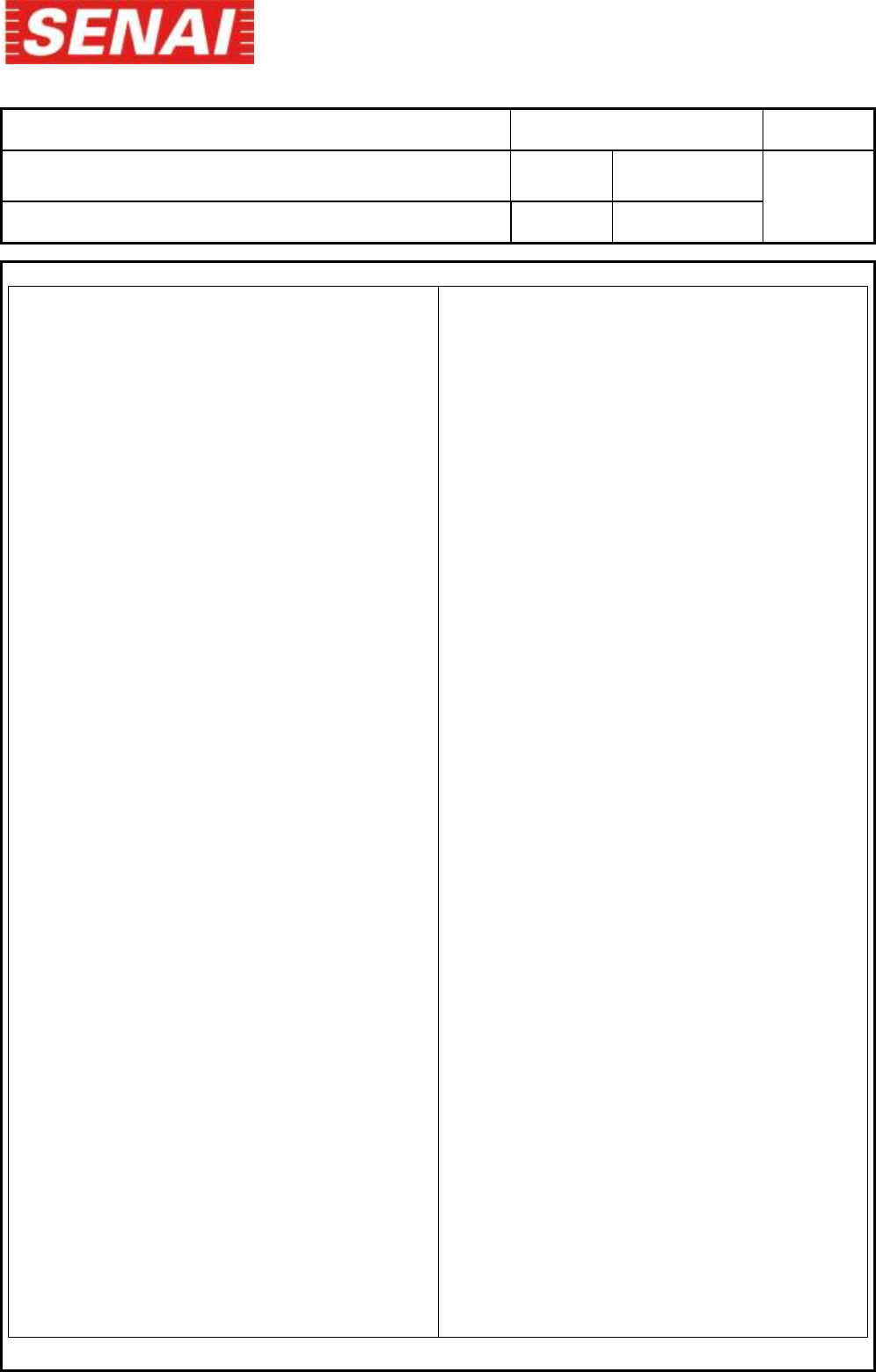 Página 1 de 4 F:\publico\Formulários do SGQ - 5.01 5.01-FR-97 v.4 Escola e Faculdade de Tecnologia SENAI “Roberto Mange” Unidade curricular: LIP Atividade: Avaliação Estruturas Nota: Conteúdo formativo: Situação aprendizagem 1 – Estruturas IA: A Data: / / Aluno: N°: Turma: Fundamento: Utilizar algoritmo para resolução de problemas Critério: Acertou ao menos 2 dos 3 exercícios da avaliação sobre Estruturas condicionais 1) Qual das estruturas abaixo é uma estrutura condicional: A) Se – Entao – Senao B) Enquanto – Faca C) Escolha – Caso D) Para – de – ate – Faca E) As alternativas A e C são corretas 2) Determine qual será a saída do código abaixo, sabendo que A5, B3 e C2 SE (A + B < 10) ENTAO SE (B + C > 10) ENTAO ESCREVA(3 * B) SENAO SE (C < 0) ENTAO ESCREVA(A - C) SENAO ESCREVA(A * B * C) FIMSE FIMSE SENAO ESCREVA(3 * A) FIMSE A) 15 B) 3 C) 30 D) 9 E) 20 3) Determine qual será a saída do código abaixo, sabendo que A8, B1 e C12 SE (A + B < 10) ENTAO SE (B + C > 10) ENTAO ESCREVA(3 * B) SENAO SE (C < 0) ENTAO ESCREVA(A - C) SENAO ESCREVA(A * B * C) FIMSE FIMSE SENAO ESCREVA(3 * A) FIMSE A) 24 B) 3 C) 30 D) 96 E) -4 Fundamento: Utilizar algoritmo para resolução de problemas Critério: Acertou ao menos 2 dos 3 exercícios da avaliação sobre Estruturas de repetição 1) É necessário construir um algoritmo que mostre na tela números de 1 ate 20. Qual dos loops de repetição abaixo podemos utilizar para construí-lo? A) Enquanto – Faca B) Repita – Ate C) Para – De – Ate – Faca D) Nenhuma das alternativas E) Alternativas A, B e C são corretas Página 2 de 4 F:\publico\Formulários do SGQ - 5.01 5.01-FR-97 v.4 Escola e Faculdade de Tecnologia SENAI “Roberto Mange” 2) A estrutura de repetição permite ao desenvolvedor criar um bloco de instruções que poderá ser executado por diversas vezes, respeitando determinada condição preestabelecida. Com base nas atribuições às variáveis definidas e no algoritmo anexo, analise as sentenças a seguir: I- Ao atribuir os valores 5, 4, 2 e 0 às variáveis CONT, RES, X e N, respectivamente, o resultado impresso será 4. II- Ao atribuir os valores 1, 3, 1, 3 às variáveis CONT, RES, X e N, respectivamente, o resultado impresso será 6. III- Ao atribuir os valores 4, 3, 0, 2 às variáveis CONT, RES, X e N, respectivamente, o resultado impresso será 10. IV- Ao atribuir os valores 2, 2, 2, 2 às variáveis CONT, RES, X e N, respectivamente, o resultado impresso será 8. Assinale a alternativa CORRETA: A) As sentenças II, III e IV estão corretas. B) As sentenças I e IV estão corretas. C) As sentenças I e II estão corretas D) Somente a sentença III está correta E) Todas estão erradas 3) Analise o trecho de código abaixo e responda qual será o valor final da variável x, independente de sua escrita na tela. x: inteiro x 1 Enquanto (x <= 10) faca Escreval(x) x x + 1 FimEnquanto A) 8 B) 9 C) 10 D) 11 E) 12 Página 3 de 4 F:\publico\Formulários do SGQ - 5.01 5.01-FR-97 v.4 Escola e Faculdade de Tecnologia SENAI “Roberto Mange” Fundamento: Utilizar algoritmo para resolução de problemas Critério: Acertou ao menos 2 dos 3 exercícios da avaliação sobre Estruturas sequenciais 1) Analise as sentenças abaixo em relação às estruturas sequenciais utilizadas para construção de algoritmos. I. Na estrutura de repetição Enquanto / Faça o bloco de repetição pode ser executado várias vezes ou até nenhuma vez. A condição é testada antes de entrar na estrutura de repetição. II. A estrutura de repetição Repita / Até efetua um teste lógico no fim do laço, garantindo que pelo menos uma vez as instruções deste sejam executadas. III. Toda repetição condicional pode ser representada por uma estrutura do tipo Enquanto / Faça ou Repita / Até, sendo que a primeira repete somente quando a condição é falsa e a segunda somente quando a condição é verdadeira. IV. Para se impedir a situação conhecida como loop infinito é necessário que, nos laços de repetição, a variável que é testada esteja sempre associada a uma instrução que a atualize no interior desse laço. As afirmações corretas são: A) I, II e IV B) I, II C) III e IV D) II, III e IV E) Todas são corretas 2) Análise o trecho do código a seguir e determine a sequência que será impressa no console, sendo x uma variável do tipo inteira. A) 2,4,8,16,32,64, B) 2,4,8,16,32, C) 1,2,4,8,16,32, D) 1,2,4,8,16,32,64, E) 2,4,8,16,32,50, 2) Análise o trecho do código a seguir e determine a sequência que será impressa no console sendo x uma variável do tipo inteira A) 2,6,18,162,486, B) 6,18,54,162,486, C) 6,18,54,162,486,972, D) 2,6,18,162,486,972, E) nenhuma das sequencias Página 4 de 4 F:\publico\Formulários do SGQ - 5.01 5.01-FR-97 v.4 Escola e Faculdade de Tecnologia SENAI “Roberto Mange” Fundamento: Utilizar algoritmo para resolução de problemas Critério: Acertou ao menos 2 dos 3 exercícios da avaliação sobre vetores e matrizes 1) Analise o código a seguir e encontre o penúltimo número desse vetor Num[9]. A) 27 B) 30 C) 29 D) 24 E) 26 2) Preenchendo o vetor abaixo conforme descrição, qual será o valor de sua última posição? A) 100 B) 90 C) 80 D) 120 E) 110 3) Preenchendo a matriz abaixo conforme descrição, qual será o valor que estará presente na linha 10 e coluna 10? A) 81 B) 80 C) 100 D) 70 E) 72 ELABORAÇÃO DATA APROVAÇÃO DATA LUCIANO SANTOS 24/ 01 / 2019 / /