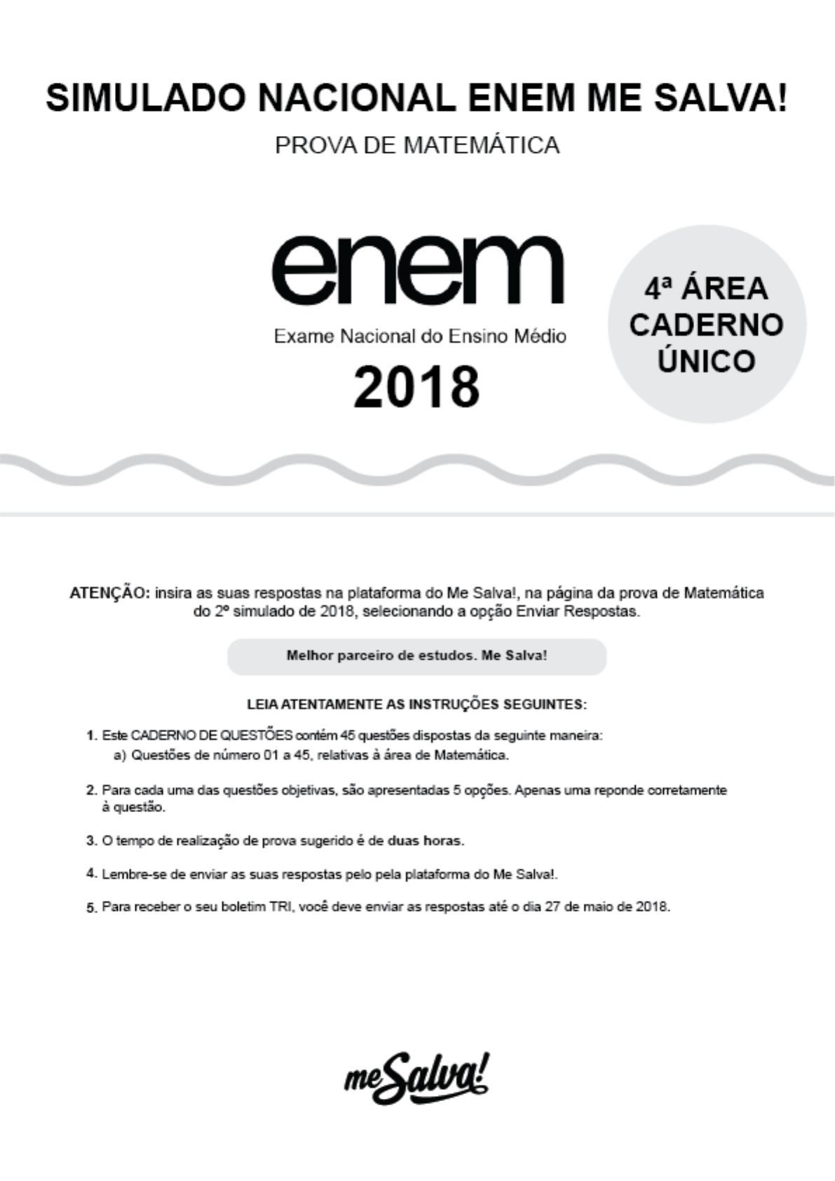 L IN G U A G E N S M A T E M Á T IC A 2º SIMULADO ENEM 2018 QUESTÃO 03 Um dos clássicos dos games antigos é o PitFall, para o console Atari. O jogo foi lançado em 1982 se passa numa selva, onde nosso protagonista precisa enfrentar desafios e ganhar pontos ao longo de várias fases. https://overgameretro.com.br/pitfall-para-atari-2600/ A imagem acima nos mostra um dos desafios icônicos do jogo, onde o nosso protagonista precisa se agarrar num cipó e passar por cima de três jacarés em uma lagoa. Em pleno ar nosso herói faz um movimento parabólico. Dado que a trajetória do nosso herói é dada pela função h(x) = x²-6x+15, onde h é a altura, em metros, do herói pendurado no cipó e x é a distância percorrida por ele, podemos afirmar a altura em que nosso herói mais se aproxima dos jacarés é de: A 4 metros B 5 mestros C 6 metros D 3 metros 1 metro QUESTÃO 04 A Grande Esfinge de Gizé, ou apenas Esfinge é uma estátua de pedra calcária localizada no palácio de Gizé. Trata-se da maior escultura feita de monólito, uma única estrutura ou peça maciça de pedra, no mundo. Sua altura mede 19,8 metros. Abaixo nós temos também uma foto da pirâmide de Queóps, ou simplesmente Grande Pirâmide, cuja altura é de 146,4 metros. https://pt.wikipedia.org/wiki/Pir%C3%A2mide_de_Qu%C3%A9ops QUESTÃO 01 A figura abaixo nos mostra parte de um projeto de quadro de bicicleta, onde o círculo com centro em A oferece suporte e resistência para as retas CB e CD. Ambas as retas são tangentes ao círculo. Dado que o ângulo BCD = 60° e que CD = CB = 10 cm, podemos afirmar que a área da região hachurada do quadro bicicleta é igual, em cm² a: (use pi = 3) A 50/3 B 100/3 C 150 D 10√3/3 E √3/3 QUESTÃO 02 Um famoso tipo de piso que existe no subúrbio de São Paulo é ilustrado na figura abaixo. Chamado por muitos de “piso de caquinhos”, este piso era feito com sobras de produção de lajotas vermelhas. É muito possível que você já tenha entrado numa casa com esse tipo de piso. https://www.soumeier.com.br/noticias/o-piso-que-marcou-historia-do-suburbio/ Supondo que uma caixa de pisos vermelhos como as da figura acima venha com 4 placas de pisos de dimensão 0,3x0,3 metros. Se quisermos reproduzir este estilo de piso em uma área retangular cujas medidas são de 4,2m x 3,9, a quantidade de caixas que devemos comprar é de: A 46 B 40 C 182 D 6 E 10 M A T E M Á T IC A 2º SIMULADO ENEM 2018 A 80,1% B 80% C 72,3% D 10,5% E 18% QUESTÃO 07 Jonatas pretende reformar seu quarto. Cansado das cores das paredes, Jonatas foi a uma loja de ferragem para comprar um galão de tinta. Entretanto, se deparou com mil especificações. Sabemos que existem galões grandes de tinta que possuem um rendimento menor, pintam uma área menor de parede, do que latas de tinta menores e de boa qualidade. Ou seja, tamanho não é documento. Em meio a tantas dúvidas Jonatas pediu ajuda e foi indicado a ele uma lata de tinta da marca Coloral com as seguintes especificações: Cor: Verde Limão, tom: ninguém aqui vai dormir. Volume: 2,6 litros de tinta Rendimento: 100m² por demão. O quarto do Jonatas possui as dimensões 9x12x3 (largura, comprimento e altura). Dado que Jonatas pretende pintar APENAS as paredes internas de seu quarto, quantas latas de tinta deve comprar, sabendo que para um bom acabamento devemos fazer duas demãos? A 1 B 2 C 3 D 4 E 5 QUESTÃO 08 Um reservatório de água é abastecido com a abertura de duas torneiras, A e B, conforme a figura abaixo. As duas torneiras possuem vazões distintas. Sabemos que enquanto a torneira A, trabalhando sozinha, demora 4 horas pra encher o reservatório por completo, a torneira B demora 6 horas. http://www.gazetadopovo.com.br/haus/imoveis/saiba-quanto-custa-e-como-limpar-su- a-caixa-dagua/ Com base nestes dados, podemos afirmar que a razão entre a altura da Esfinge para a altura da Grande Pirâmide é de: A 99/224 B 33/732 C 99/1464 D 33/244 E 244/33 QUESTÃO 05 O projeto de uma escola foi desenhado numa planta sob a escala de 1:150. A planta representa todos os espaços da escola, como banheiros, sala de aula, laboratórios e etc. Ao projetar uma sala de aula, é importante dimensionarmos a quantidade de carteiras, mesas escolares, que podemos colocar na sala. A figura abaixo nos mostra um exemplo deste tipo de planta. Dado que na planta cada mesa possui dimensões de 0,4 cm de largura por 0,6 cm de comprimento, determine as dimensões reais de cada mesa desta sala. A 15 cm x 20 cm B 40cm x 60 cm C 60 cm x 90 cm D 45 cm x 65 cm E 80 cm x 120 cm QUESTÃO 06 O estudo divulgado pelo IBGE mostra que ainda, infelizmente, mulheres ganham menos que homens. A conclusão apontada pelo IBGE aponta que “o caminho a ser percorrido em direção à igualdade de gênero, ou seja, em um cenário onde homens e mulheres gozem dos mesmos direitos e oportunidades, ainda é longo”. A diferença entre os salários não é a única desigualdade apontada pelo estudo. Além da jornada de trabalho, mulheres possuem uma carga horária para afazeres domésticos de 18,1 horas semanais, contra as 10,5 horas semanais dos homens. Em relação a quantidade de horas dos afazeres domésticos. Podemos apontar que a carga horária que as mulheres possuem em relação aos homens é superior, percentualmente em: L IN G U A G E N S M A T E M Á T IC A 2º SIMULADO ENEM 2018 O aro de uma bicicleta indica a altura de sua roda em polegadas. Ou seja, uma bicicleta de aro 20, possui uma roda de 20 polegadas (1 polegada = 2.5 cm) . Imagine a roda da figura acima planificada, como um círculo de diâmetro de 20 polegadas com 28 arestas metálicas. A medida do perímetro da roda com as 28 arestas é, em metros: (use pi = 3) A 0,70 B 0,635 C 0,85 D 15,5 E 1,2 QUESTÃO 11 A praia de Santos, em São Paulo, é conhecida por diversos motivos. Um deles são os prédios tortos de Santos. Procure prédio torto em Santos no Google e você com certeza vai se divertir. Os prédios foram constru