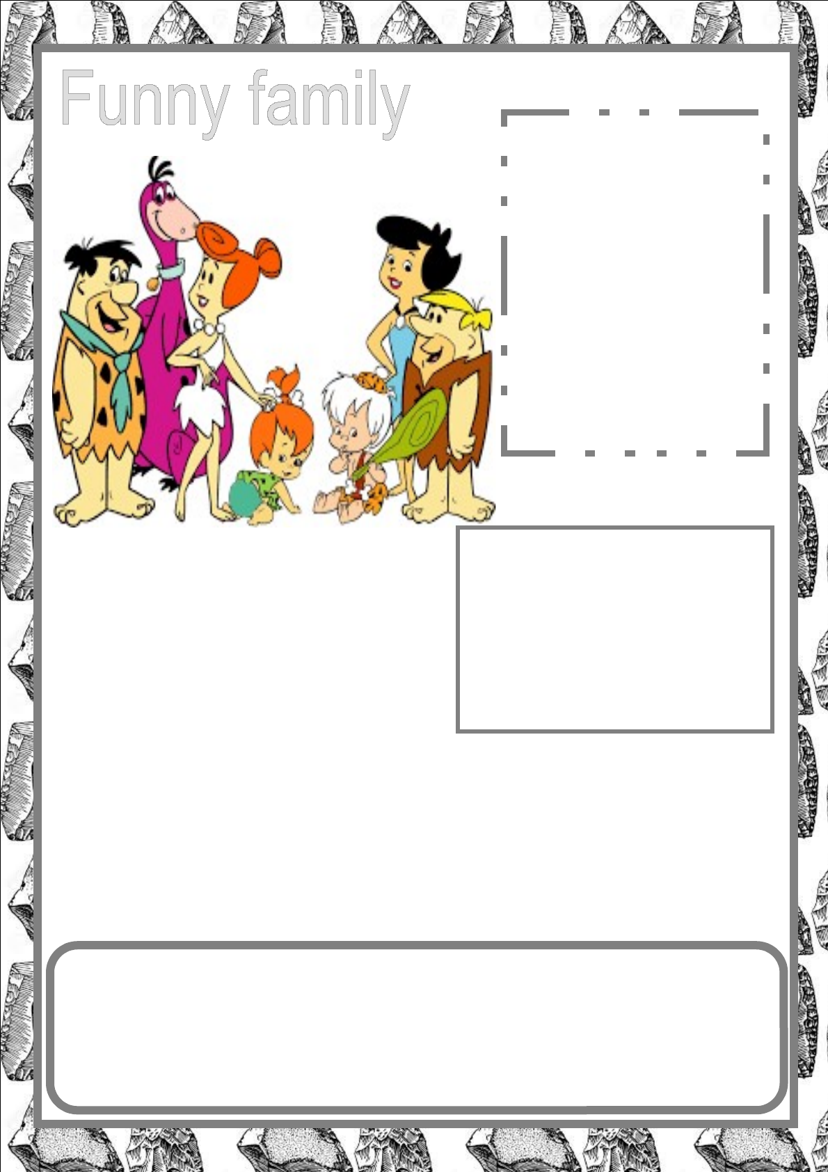 The Flinston family The Flintstones are a happy family. Fred is the father and Wilma is the mother. Pebbles, the little girl, is the daughter. The Flintstones have a pet called Dino. It is a dinosaur. Betty and Barney are their friends. They have a strong boy called Bam-Bam. These families are so funny and a little strange. Answer true or false. Fred Flintstone is the mother ( ). Wilma Flintstone is the daughter( ). Bam-Bam is the pet ( ). The animal is a dog. ( ) Fred and Barney aren’t friends ( ). The Flintstones is a sad family ( ). Bam-Bam is strange. ( ) The families are strong. ( ) Answer the questions with whole sentences. What’s the father’s name? __________________________________________ Who is the mother? __________________________________________ Who is the daughter? __________________________________________ What is the pet name? __________________________________________ What kind of a pet is it? __________________________________________ Who are their friends? __________________________________________ What is the little boy’s name? __________________________________________ How is he? __________________________________________ Is Pebble a boy? __________________________________________ Write about your family. ______________________________________________________________________________________________________________________________________________________________________________________________________________________________ ____________________________________________________________________________________________________________________________________________________