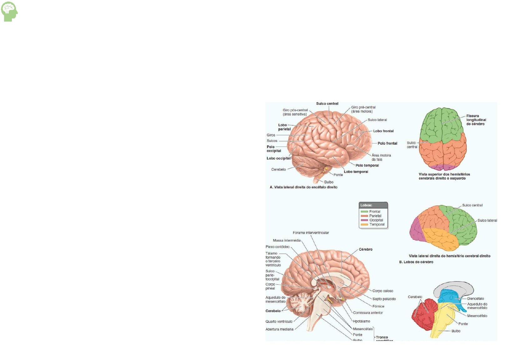 Izabela Sena ENCÉFALO Moore – Capítulo 8 ENCÉFALO • Controla e coordena todas as funções • Diferencia espécie humana de outros animais • Origem de 11 dos 12 nervos cranianos PARTES DO ENCÉFALO: • Telencéfalo (cérebro) • Diencéfalo • Cerebelo • Tronco encefálico TELENCÉFALO/CÉREBRO • Hemisférios cerebrais e núcleos da base • Fissura longitudinal do cérebro – separa hemisférios • Sulco central: separa os lobos frontais dos lobos parietais. • Sulco lateral (fissura de Sylvius e fissura lateral) separa o lobo frontal e o lobo parietal do temporal.. • Lobos occipitais: córtex visual. • Sulco parietoccipital: separa lobo occipital dos lobos parietal e temporal. • Polos frontal e temporal: são os pontos mais anteriores dos lobos frontal e temporal, respectivamente. • Polo occipital: ponto posterior extremo do lobo occipital. DIENCÉFALO • Epitálamo • Tálamo • Hipotálamo • Forma o núcleo central do encéfalo MESENCÉFALO • Parte anterior do tronco encefálico Neuro Ciência • Fossa Interpeduncular: emerge o n. oculomotor, o assoalho é perfurado, sendo chamado de substancia perfurada posterior, por onde passam ramos de algumas artérias. Isso é no MESENCÉFALO, não sei porque anotei aqui. PONTE • Parte do tronco encefálico situada entre o mesencéfalo rostralmente e o bulbo caudalmente • Estriações transversais: região ventral, formada por feixe de fibras que convergem de cada lado para formar o pedúnculo cerebelar médio, que emerge o nervo trigêmeo. • O nervo trigêmeo emerge por duas raizes: uma sensitiva, maior e outra motora, menor. • Sulco basilar: na superfície ventral, artéria basilar. • Sulco bulbo-pontino: na parte inferior na ponte, divide a ponte e o bulbo. De cada lado desse sulco, vão emergir os pares VI, VII e VIII. • A parte dorsal é o assoalho do IV ventrículo. BULBO/ MEDULA OBLONGA • Os NC IX, X e XII estão associados ao bulbo, ao passo que os NC VI a VIII estão associados a junção da ponte e do bulbo CEREBELO • Grande massa encefálica • Situa-se sob o tentório do cerebelo na fossa posterior do crânio. Consiste em dois hemisférios laterais unidos por uma parte intermediária estreita, o verme do cerebelo. Angelo Machado – Capítulo 5 ANATOMIA MACROSCÓPICA DO TRONCO ENCEFÁLICO E DO CEREBELO TRONCO ENCEFÁLICO Constituição: - corpos de neurônio -→ se agrupam em núcleos - fibras nervosas -→ se agrupam em feixes (tratos, fascículos ou lemniscos) • Muitos dos núcleos do tronco encefálico emitem ou recebem fibras nervosas que entram na constituição dos nervos cranianos. Dos 12 pares de nervos cranianos, 10 fazem conexão com o tronco encefálico! Divisão: • Bulbo • Mesencéfalo • Ponte BULBO ou MEDULA OBLONGA • Continua caudalmente com a medula espinhal Izabela Sena • Não existe demarcação nítida entre medula e bulbo. O limite é considerado: plano horizontal que passa imediatamente acima do filamento radicular mais cranial do primeiro nervo cervical, o que corresponde ao nível do forame magno do osso occipital. • Sulco bulbo-pontino: margem inferior da ponte, corresponde limite superior do bulbo. • A superfície dele é percorrida por sulcos que continuam longitudinalmente com os sulcos da medula. Os sulcos delimitam as áreas anterior, lateral e posterior dos bulbo. • Na área ventral (anterior): fissura mediana anterior, e de cada lado dela adiste uma eminência alongada, a pirâmide. • A pirâmide é formada por um feixe compacto de fibras nervosas descendentes que ligam áreas motoras do cérebro aos neurônios motores da medula - trato corticoespinhal. • Decussação das pirâmides: fibras do trato cruzam obliquamente o plano mediano em feixes interdigital que obliteram fissura mediana anterior. • Área lateral do bulbo é entre os sulcos lateral anterior e lateral posterior. Nela se observa a eminência oval, a oliva. • Metade caudal do bulbo: porção fechada do bulbo. Estreito canal que é continuação direta do canal central da medula. Esse canal de abre para formar o IV ventrículo • Sulco mediano posterior: limites laterais do IV ventrículo • Área posterior do bulbo: entre o sulco mediano posterior e o sulco lateral posterior • Sulco intermédio posterior divide o fascículo grácil e o fascículo cuneiforme. • Os fascículos são constituídos por fibras nervosas ascendentes, provenientes da medula que terminam em duas massas de substância cinzenta – os núcleos grácil e cuneiforme. • Os núcleos se situam na parte mais cranial dos fascículos • Os núcleos determinam um aparecimento de uma eminência – tubérculo do núcleo grácil e o tubérculo do núcleo cuneiforme – nesses fascículos • Medialmente: o tubérculo do núcleo grácil • Lateralmente: o tubérculo do núcleo cuneiforme • Pedúnculo cerebelar inferior: grosso feixe de fibras que fletem dorsalmente para penetrar no cerebelo. PONTE • Repousa sobre a parte basilar do osso occipital e o dorso da sela túrcica do esfenoide • Sulco bulbo-pontino: delimitação entre ponte e bulbo, somente na vista anterolateral, origem aparente dos nn. Abducente, facial e vestíbulo coclear • Sulco basilar: longitudinal, formado pela passagem da artéria basilar OLIVA: - área lateral do bulbo - núcleo olivar inferior: grande massa de substância cinzenta - centralmente a ela: os filamentos radiculares do nervo hipoglosso (XII par craniano) emergem do sulco lateral anterior - do sulco lateral posterior emergem filamentos radiculares que se unem para formar o nervo glossofaríngeo (IX par) e vago (X par) Neuro Ciência • Apresenta várias estrias transversais, devido ao trajeto das fibras que passam na ponte • Na parte lateral emerge o n. trigêmeo: limite virtual da ponte, separando ela medialmente do pedúnculo cerebelar médio QUARTO VENTRÍCULO • Situação e comunicações: • O quarto ventrículo é formado pela cavidade do ro