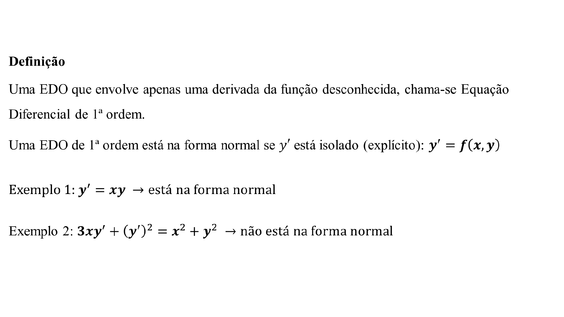 EQUAÇÃO DIFERENCIAL DE 1ª ORDEM Definição Uma EDO que envolve apenas uma derivada da função desconhecida, chama-se Equação Diferencial de 1ª ordem. Uma EDO de 1ª ordem está na forma normal se está isolado (explícito): Exemplo 1: Exemplo 2: RB EQUAÇÃO DIFERENCIAL DE 1ª ORDEM Interpretação geométrica Através de considerações geométricas é possível deduzir o comportamento das soluções de uma EDO. Definição Dada uma EDO de 1ª ordem, podemos calcular o coeficiente angular de em cada ponto e desenharmos um pequeno segmento de reta com esta declividade, centrado em . O conjunto destes segmentos chama-se campo das direções. As soluções de uma ED são as curvas traçadas tangenciando em cada um dos pontos do campo de direções. Geometricamente, resolver uma EDO significa encontrar as curvas que tangenciam o campo das direções. RB EQUAÇÃO DIFERENCIAL DE 1ª ORDEM Interpretação geométrica Exemplo 1: Exemplo 2: Equações Diferenciais com variáveis separáveis Definição: Uma EDO de 1ª ordem, pode ser resolvida por separação de variáveis quando, onde são funções de x e y. RB EQUAÇÃO DIFERENCIAL DE 1ª ORDEM Equações Diferenciais com variáveis separáveis Exemplos Resolver as seguintes EDO’s e PVI’s. RB EQUAÇÃO DIFERENCIAL DE 1ª ORDEM Equações Diferenciais com variáveis separáveis Exercícios Resolver as seguintes EDO’s e PVI’s. RB EQUAÇÃO DIFERENCIAL DE 1ª ORDEM Equações Diferenciais com variáveis separáveis Exercícios Resolver as seguintes EDO’s e PVI’s. RB EQUAÇÃO DIFERENCIAL DE 1ª ORDEM Equações Diferenciais com variáveis separáveis Exercícios Resolver as seguintes EDO’s e PVI’s. RB EQUAÇÃO DIFERENCIAL DE 1ª ORDEM Equações Diferenciais com variáveis separáveis Exemplos: 1. Uma xícara de café esfria de acordo com a lei de resfriamento de Newton. Sabendo que a temperatura T(t), tem se que a Temperatura do meio é 80°F e a temperatura inicial T(0) é de 170°F. Determine a temperatura T em um modelo da forma de problema de valor inicial de primeira ordem. Dado: 2. Quando um bolo é tirado do forno, sua temperatura é 300. Três minutos mais tarde, sua temperatura é 200. Quanto tempo levará para o bolo resfriar até a temperatura ambiente de 70 RB EQUAÇÃO DIFERENCIAL DE 1ª ORDEM Equações Diferenciais Exatas Definição: Uma equação diferencial do tipo é exata se existe uma função satisfazendo: e , assim a solução geral é Condição de Euler: Se o domínio de M e N é IR, uma ED é exata se e somente se (necessário e suficiente) RB EQUAÇÃO DIFERENCIAL DE 1ª ORDEM Equações Diferenciais Exatas Se a Equação Diferencial é exata, a solução será onde só depende de y. Para obter , deriva-se ] e em seguida fazemos RB EQUAÇÃO DIFERENCIAL DE 1ª ORDEM Equações Diferenciais Exatas Exemplos: Resolva as equações diferenciais, pela técnica das exatas. RB EQUAÇÃO DIFERENCIAL DE 1ª ORDEM Equações Diferenciais Exatas Exercícios: Resolva as equações diferenciais, pela técnica das exatas. RB EQUAÇÃO DIFERENCIAL DE 1ª ORDEM Equações Diferenciais Exatas e Fatores Integrantes Definição: Geralmente uma equação diferencial não é exata, as vezes pode-se encontrar uma função (x,y) , chamado de fator integrante tal que (x,y) torna-se exata. Exemplo: Resolva a equação diferencial Para transformar a equação não exata em exata, basta encontrar o fator integrante que depende: RB EQUAÇÃO DIFERENCIAL DE 1ª ORDEM Equações Diferenciais Exatas e Fatores Integrantes Exemplos: Resolva as equações diferencias RB EQUAÇÃO DIFERENCIAL DE 1ª ORDEM Equações Diferenciais Exatas e Fatores Integrantes Exemplos: Resolva as equações diferencias RB