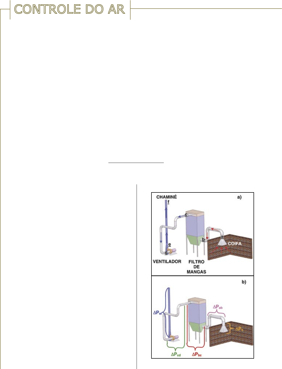 CONTROLE DO AR 32 | Meio Filtrante |Março/Abril 2007 por Tito A. Pacheco CONTROLE AVANÇADO DE FILTROS DE MANGAS E m meados de 2000, após ter ministrado dezenas de cursos sobre Filtração Industrial Seca nos mais variados clientes ao longo de todo Brasil, verifiquei que a maioria dos maiores Fabricantes de Equipamentos nacionais ado- tava uma tecnologia de controle de filtros ainda ba- seada nas antigas placas analógicas. Os manômetros, na sua grande maioria, eram em tubo de “U”. Os demais instrumentos, como: medidores de vazão, umidade, temperatura, então, eram raríssimos. Atualmente cerca de 50% dos fabricantes já utilizam controladores digitais e demais instrumentos de medição em seus Projetos. Os demais ainda alegam que não os utilizam por razões de custo, mesmo que, na ponta do lápis, isso não represente mais que 0,5% do custo total do equipamento de despoeiramento. A prova que o custo não é impeditivo é que a maioria dos Fabricantes que incorporam os sistemas digitais nos projetos de filtros é, justamente, o de menor porte, o qual o considera não apenas um diferencial competitivo, mas, principalmente, um meio para obtenção de uma excelente performance em seus produtos. Os sistemas de despoeiramento seguem os princípios da Ventilação Local exaustora, razão pela qual é importante revisar alguns conceitos básicos, a fim de compreender a lógica de controle destes sistemas. Conheça o que há de moderno e eficaz para otimização do desempenho de filtros de mangas, sejam os de pequeno ou de grande porte Princípios da Ventilação Local Exaustora Fig.1: a) Croqui de um sistema de ventilação local exaustora. b) Identificação das perdas de carga C ré d ito : D iv ul ga çã o Esta ventilação é chamada de local exaustora porque há uma ou mais coifas de captação em pontos específicos e próximos da geração de pó, as quais são interligadas por dutos ventilados através de um ventilador com ou sem filtração dos gases. Na Fig.1- a) temos um sistema com filtro de mangas, cuja filtração é por Pressão Negativa, porque o ventilador está depois do filtro, gerando assim uma pressão menor que a atmosférica da coifa até a entrada no ventilador. Da mesma forma, se o ventilador estivesse antes do filtro, ela seria chamada de filtração por Pressão Positiva, pois haveria uma pressão superior à atmosférica, tanto na câmara suja como na câmara limpa do filtro. Deve ser lembrado que a pressão antes do ventilador é sempre negativa e depois do ventilador é sempre positiva. Um Projeto de Sistema de Despoeiramento começa justamente na coifa através da determinação de sua área de captação e da velocidade de ar necessária para captar toda a emissão pulverulenta gerada no local a ser despoeirado. Pois, o produto desta área pela velocidade é justamente a Vazão de Captação. Visto que existe uma velocidade ótima para transporte do particulado através dos dutos, uma vez conhecendo a vazão, é determinado, então, o diâmetro inicial das tubulações, o qual serve de partida para os Softwares de Balanceamento de Dutos e Projeto de Filtros, como o Simulador de Filtração Industrial Proteus, desenvolvido pelo Eng. Tito A Pacheco (ver edição n° 04 da Revista Meio Filtrante). Na Tabela 1 são exemplificados valores típicos de pressão estática em 6 pontos da tubulação do Sistema, representado no croqui da Fig.1. Estes valores são normalmente obtidos por medições, a partir dos quais é calculada a pressão diferencial, também chamada de Perda de Carga entre os principais trechos. Estas perdas de carga também podem ser Tabela 1: Medições típicas da pressão estática de um sistema como o do croqui da Fig.1 CONTROLE DO AR 34 | Meio Filtrante |Março/Abril 2007 calculadas teoricamente com base justamente nos dados dimensionais da coifa, dos dutos e da vazão e densidade do ar captado (Simulador Proteus). Estas informações são necessárias para especificação da pressão total do ventilador, as quais, juntamente com a vazão, correspondem as principais informações para o seu dimensionamento. Por fim, a perda de carga do filtro de mangas, em geral, é arbitrária, apresentando valores típicos como: 50, 80, 100, 120 ou 150mmCA, dependendo da tecnologia do filtro e do processo de filtração. Para obter a perda de carga desejada no filtro, existem ajustes na regulagem do sistema de limpeza que precisam ser feitos, os quais serão abordados mais adiante neste artigo. Controle do filtro como recurso para solução de problemas A falha em filtros de mangas pode ser classificada em dois tipos: * Entupimento (baixa captação de particulado); *Alta emissão na chaminé (passagem de pó pelo filtro). Tabela 2: Alguns medidores de Pressão Diferencial e Estática Um melhor entendimento do funcionamento de um Sistema de Despoeiramento pode ser feito através dos gráficos da Fig.2, onde são representadas as operações possíveis. O somatório das perdas de carga do sistema aumenta com o aumento da vazão, conforme a Curva do Sistema (vermelha). Visto que a potência do conjunto motor- ventilador é limitada, para um aumento de pressão corresponde uma diminuição da vazão de acordo com o representado na Curva do Ventilador (azul). Onde estas duas se encontram, temos então o ponto de operação real do sistema de ventilação, em termos de Pressão total (PPROJETO ou PVENTILADOR) e Vazão obtida (VPROJETO). Ao passo que a Curva do Ventilador somente se altera se a rotação do variar, a Curva do Sistema pode variar bastante. Algumas causas da variação dessa curva podem ser: * Alto PFILTRO devido ao entupimento do filtro de mangas; * Baixo PFILTRO devido ao excesso de limpeza do filtro ou falta de particulado; * Uso de dumpers para controle de vazão; * Entupimento da tubulação; * Uso de dumpers para entrada de Ar-falso (normal- mente para controle de temperatura / fagulhas); * Adição de mais pontos de captação e/ou desa