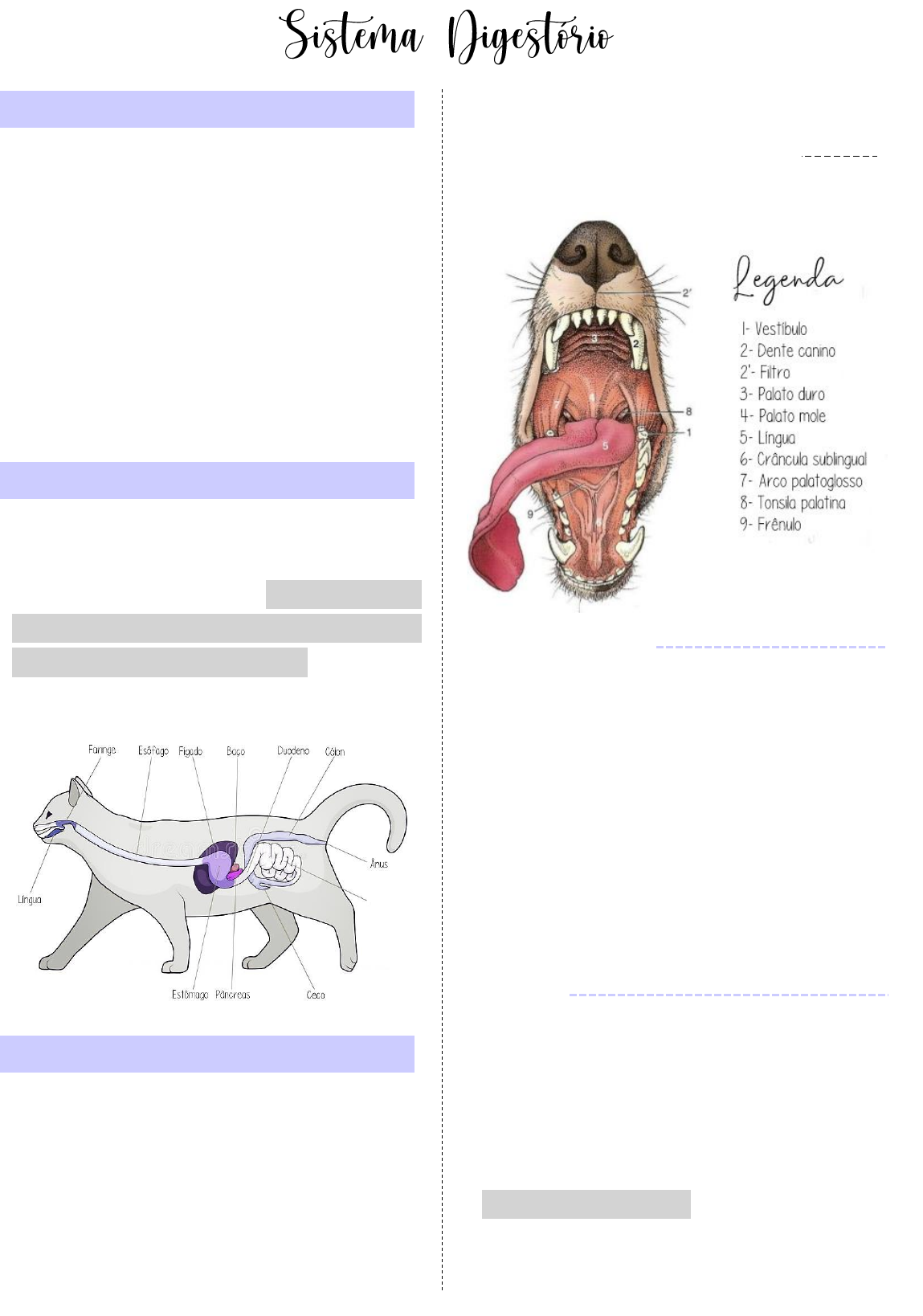 Como o nome já deixa claro, todas as funções realizadas pelo sistema digestório estão direta ou indiretamente ligadas à digestão de alimentos, podendo ser citadas como: apreensão dos alimentos; mastigação; ingestão; digestão e absorção; eliminação dos resíduos. O sistema digestório engloba todos os órgãos relacionados com a recepção até a eliminação de alimentos e líquidos, sendo eles: a boca, a faringe, o esôfago, o estômago, os intestinos delgado e grosso e as glândulas acessórias – glândulas salivares, pâncreas e fígado. Consiste no conjunto de: cavidade bocal, estruturas acessórias (dentes, língua e lábios) e as glândulas salivares; Suas principais funções são: a apreensão, a mastigação e a insalivação dos alimentos, podendo também desempenhar um papel na agressão e defesa do animal, além de servir como via aérea quando o fluxo pelo nariz está comprometido. Cavidade Oral - se inicia entre os lábios e segue até a faringe; - é dividida em vestíbulo, externamente, e em cavidade oral propriamente dita, centralmente; - o vestíbulo se encontra no espaço entre os dentes e os lábios, se estendendo caudalmente em direção à mandíbula e o músculo masseter; - suas proporções variam de acordo com os hábitos alimentares dos animais, sendo maiores em carnívoros e menores em herbívoros e roedores. Lábios - são responsáveis por selecionar o alimento que será ingerido; - são compostos por pele, uma camada intermediária de músculo, tendão e glândulas, e pela mucosa oral; - ovinos, caprinos e equinos possuem lábios macios e flexíveis, pois são usados para apreender o Funções Primárias: Órgãos Constituintes: Boca: @lilyfazvet @lilyfazvet alimento e levá-lo até a boca; - bovinos, suínos e felinos possuem lábios menos móveis e de menor tamanho, já que não são utilizados para selecionar o alimento do animal; - os cães possuem lábios longos e finos, que são de extrema importância para a comunicação da espécie, podendo sinalizar intenções agressiva ou submissa. Bochechas - tendem a ser mais amplas em animais herbívoros e tem uma estrutura similar aos lábios; - são responsáveis por retornar a cavidade central o alimento que tenha escapado do vestíbulo; - possuem uma mucosa suficientemente frouxa para permitir a abertura da boca do animal; - nos ruminantes, possuem um epitélio mais espesso e cornificado, por conta da alimentação mais seca e dura desses animais. Palato Duro - encontra-se na parte rostral do teto bocal sobre os processos palatinos dos ossos incisivos, maxilar e palatino; - geralmente é chato e coberto por uma mucosa espessa repleta de “rugas” que ajudam a guiar o alimento para trás; - em herbívoros possui um epitélio fortemente queratinizado. Língua - ocupa a maior parte da cavidade oral e se estende até a orofaringe; - sua raiz e seu corpo são fixos, porém seu ápice é livre e é capaz de realizar movimentos precisos que auxiliam na alimentação do animal; - a raiz se fixa ao osso hioide e o corpo à região da sínfise da mandíbula; - no cão a língua também é usada para facilitar a perda de calor corporal por meio de ofegos - as papilas são elevações do epitélio e são encontradas em uma enorme variedade, sendo elas: papilas filiformes: oferecem proteção adicional a língua; papilas cônicas duras: tornam a língua dos felinos eficientes para a higienização pessoal; papilas fungiformes, folhadas e valadas: possuem botões gustativos e são distribuídas de acordo com a espécie em questão. Fenda Palatina » é uma doença de origem congênita e pode afetar o palato duro ou o palato mole dos animais fazendo com que haja uma ligação da boca com a região nasal; » muitos animais que apresentam esta anomalia chegam a adoecer de pneumonia, devido ao alimento ir diretamente para seu pulmão. @lilyfazvet Músculos da Mastigação - os músculos que auxiliam no processo de mastigação são: músculo temporal; músculo masseter; pterigóide medial; pterigóide lateral. - todos esses músculos são inervados pelo nervo mandibular. Dentição - os mamíferos raramente excedem 44 dentes em sua dentição permanente, a qual é determinada de acordo com a espécie; - os dentes se desenvolvem em diferentes regiões da boca, buscando suprir a melhor maneira as necessidades fisiológicas dos animais – essa característica é conhecida com heterodontia; - alguns animais podem ser classificados como difiodontes, ou seja, animais que substituem sua dentição primária por uma mais forte e melhor adaptada a sua maxila e mandíbula; - pode-se acontecer casos em que a segunda dentição do animal nasça sem que a primeira tenha sido eliminada, o que pode causar problemas no processo mastigatório do animal; - eles são implantados em alvéolos dispostos ao longo das margens da maxila e mandíbula, que consiste num arranjo chamado de tecodonte; - uma particularidade da dentição dos ruminantes é a ausência dos dentes superiores, dando lugar a um coxin dental denso e queratinizado, chamado de almofada dentária. Glândulas Salivares - secretam a saliva, que mantem úmido o interior da boca, facilita a mastigação do alimento e lubrifica sua passagem; - podem produzir secreções mucosas (glândulas menores) ou secreções fluidas (glândulas maiores); Almofada Dentária @lilyfazvet ocorre entre a boca, a faringe e o esôfago e é dividido em três etapas, sendo elas: 1ª etapa: voluntária (mastigação); 2ª etapa: passagem do alimento pela faringe; 3ª etapa: passagem do alimento pelo esôfago por meio dos movimentos peristálticos. a faringe situa-se atrás da boca e segue continuamente até o esôfago; ela é dividida em duas partes pelo óstio intrafaríngeo: a nasofaringe e a orofaringe; Nasofaringe: - é a considerada parte da cavidade nasal, uma vez que, não participa do processo digestório e serve passivamente para condução do ar; - contém numerosas glândul