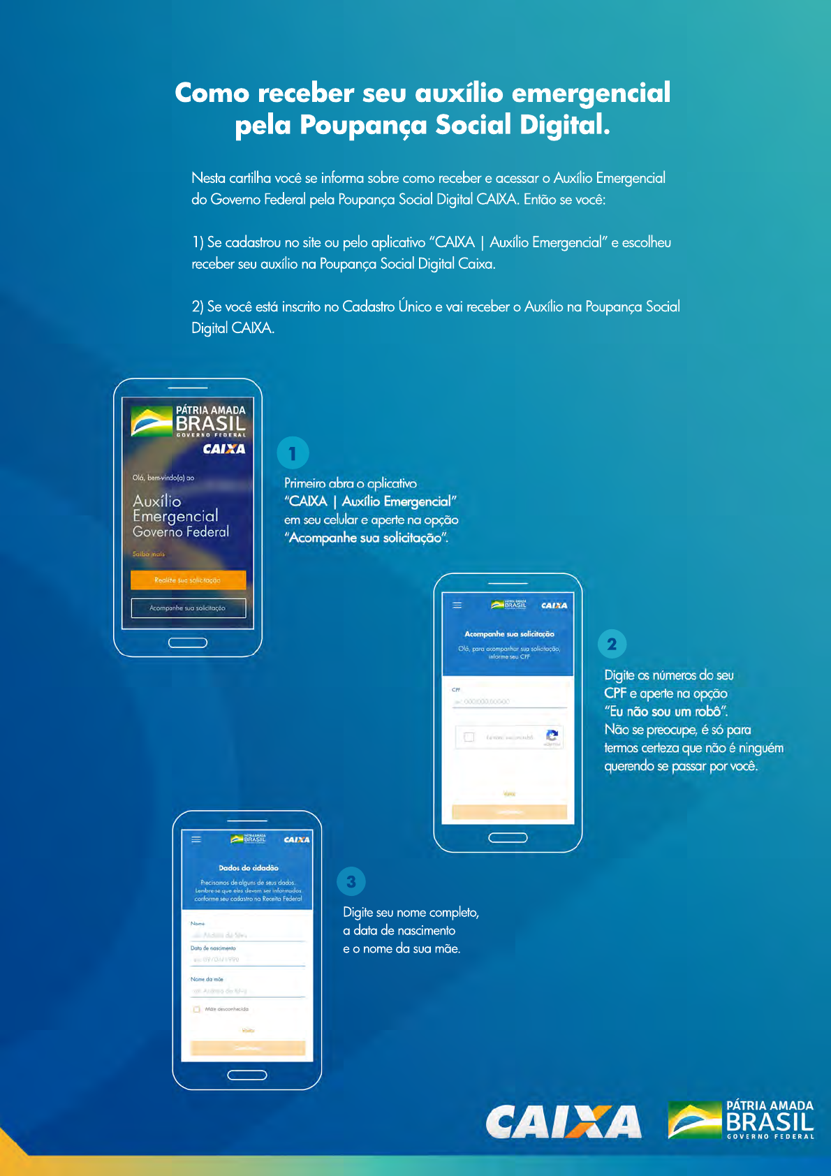 Nesta cartilha você se informa sobre como receber e acessar o Auxílio Emergencial do Governo Federal pela Poupança Social Digital CAIXA. Então se você: 1) Se cadastrou no site ou pelo aplicativo “CAIXA | Auxílio Emergencial” e escolheu receber seu auxílio na Poupança Social Digital Caixa. 2) Se você está inscrito no Cadastro Único e vai receber o Auxílio na Poupança Social Digital CAIXA. Como receber seu auxílio emergencial pela Poupança Social Digital. 1 2 3 Digite seu nome completo, a data de nascimento e o nome da sua mãe. 4 5 6 O aplicativo é o da imagem ao lado. É só apertar em “Instalar”. 7 8 Digite os números do seu CPF. 9 Agora você precisa sair do aplicativo e ir até a caixa de mensagens (SMS) do celular. Lá você vai anotar os números que recebeu por mensagem e digitar no aplicativo CAIXA Tem, na na tela ao lado. Agora, você vai precisar usar aquele código que recebeu em mensagem (SMS) no celular. Se não lembrar do código, não tem problema. Aqui você pode gerar novo código. A mensagem (SMS) recebida vem assim: Auxílio: Seu código é XXXXXX, válido até XX/04/2020. Não Compartilhe. 10 Quando digitar os números, vai aparecer essa tela. Isso quer dizer que tudo está dando certo. 11 12 Se você já fez o cadastro no Login Caixa em outros aplicativos, como o do FGTS ou Habitação Caixa, por exemplo, pode usar a mesma senha de acesso. Não precisa fazer novo cadastro. Agora, para continuar, você precisa acessar o Login Caixa. Se você não fez o cadastro ainda, precisamos de algumas informações pessoais. Primeiro digite os números do seu CPF e seu nome completo. 13 Agora, digite a data do seu nascimento e seu e-mail. Você precisa digitar o mesmo e-mail duas vezes. 14 Chegou a hora de escolher uma senha. Ela não pode ter mais do que 2 números em sequência (1 e 2 ou 8 e 9 por exemplo) nem ser o dia do seu aniversário. Depois disso é só clicar em “Não sou um robô”. 15 Saia do aplicativo CAIXA Tem, vá até ele e procure por uma mensagem recebida com o nome “Login CAIXA”. Quando abrir, é só clicar no link para confirmar suas informações. Se não achar o e-mail, vverifique a pasta SPAM. Lembra daquele e-mail que digitou aqui? Login CAIXA 16 Para fazer o Login, digite o número do seu CPF na primeira tela e a sua senha na segunda tela. 17 Agora vamos confirmar mais algumas informações. Digite o número do seu celular e os números do CEP de onde mora. 18 Tudo certo até aqui. O aplicativo vai te levar para a página principal, como na imagem ao lado, aí é só apertar em “Auxílio Emergencial”. 19 Quando aparecer a tela ao lado, aperte em “Consultar o Auxílio na Poupança Social Digital”. 20 Estamos quase acabando. Talvez você precise responder mais algumas perguntas para termos a certeza de que está tudo certo. Muita atenção, aaqui as informações não podem estar erradas, isso pode atrapalhar o cadastro, então digite com calma. 21 Se você já respondeu às perguntas ou veio direto para essa tela, é só apertar em “Receber Código”, olhar de novo a caixa de mensagens (SMS) do seu celular e digitar o novo código. 22 Escolha um nome para que você lembre qual celular está cadastrado no Login Caixa. Pode ser a marca ou modelo do seu celular, por exemplo. Aplicativo: CAIXA | Auxílio Emergencial Site: www.auxilio.caixa.gov.br Central telefônica:111 Se tiver ficado com alguma dúvida, procure um de nossos canais oficiais. Podemos te ajudar também por lá. 23 Agora vai aparecer esta tela. Aperte em “Consultar a minha Poupança Social Digital” e pronto. Você pode consultar seu saldo, extrato e fazer transferências e pagamentos.