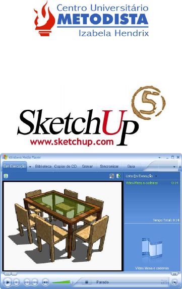 Curso de Arquitetura e Urbanismo - Disciplina de Informática Tutorial de SketchUp 5.0 - Avançado Materiais, Sombras, Cortes e Exportação de Imagens e Vídeos Elaborado por: Ezequiel Mendonça Rezende Janeiro / 2006 CENTRO UNIVERSITÁRIO METODISTA IZABELA HENDRIX Faculdade de Arquitetura e Urbanismo - Disciplina de Informática Elaborado pelo professor do Unicentro Izabela Hendrix - Arq. Ezequiel Mendonça Rezende 2 Índice: Primeira Etapa: Aplicando materiais: ..................................................................................................3 Segunda Etapa: Configurando sombras: ..............................................................................................5 Terceira Etapa: Exportando imagens: ..................................................................................................6 Quarta Etapa: Exportando modelos 3D e 2D:......................................................................................7 Exportando em 3D: ..........................................................................................................................7 Exportando em 2D: ..........................................................................................................................8 Quinta Etapa: Criando seções: .............................................................................................................9 Sexta Etapa: Criando animação: ........................................................................................................10 Preparando a animação: .................................................................................................................10 Exportando a animação:.................................................................................................................10 Bibliografia: .......................................................................................................................................13 CENTRO UNIVERSITÁRIO METODISTA IZABELA HENDRIX Faculdade de Arquitetura e Urbanismo - Disciplina de Informática Elaborado pelo professor do Unicentro Izabela Hendrix - Arq. Ezequiel Mendonça Rezende 3 Tutorial de SketchUp 5.0 - Avançado Materiais, Sombras, Cortes e Exportação de Imagens e Vídeos Obs.: Este tutorial foi desenvolvido com o SketchUp 5.0 (Versão 5.0.232). Primeira Etapa: Aplicando materiais: Com o seu modelo pronto, agora devemos aplicar o material. O SketchUp 5.0 vem com um grande número de materiais, que você pode aplicar nas superfícies do seu modelo. Estes materiais podem ser simples cores sólidas ou imagens (texturas) que podem ser aplicadas às superfícies dos objetos. O SketchUp 5.0 também permite utilizar materiais com transparência. Como foi apresentado anteriormente, para o tampo de vidro da mesa foi aplicada um material transparente, sendo: 1. Vá ao menu WINDOW→ Material Browser, ou clique no ícone PAINT BUCKET , aparecerá o quadro de materiais (Materials). 2. Dentro da aba Library - (biblioteca), escolha os materiais transparentes (Glass+Transparent). Escolha uma transparência desejada, e aplique na face que representa o vidro. Note que após aplicar o material, este aparecerá na aba “In Model”. Também note que o botão “Edit” estará habilitado, permitindo que você modifique as características deste material aplicado. Clicando no botão “Edit” abrirá o quadro ao lado, permitindo que você modifique as características do material selecionado, tais como: 1. Nome do material, 2. Exibição prévia (preview) do material, 3. Utilização de imagem (jgp, png, tif, tga, bmp) para o material, 4. Botão de navegação para a escolha da imagem, 5. Dimensões (horizontal e vertical) da imagem, 6. Opacidade da imagem - para vidro e água, 7. Color Whell, HLS, HSB, RGB - Estas opções permitem o ajuste da cor do material. Se a cor não estiver agradando, click no botão Reset Color (8), para iniciar novamente a escolha da cor. Para uma aplicação de material mais cuidadosa, deve-se primeiramente verificar como está agrupado o seu modelo. No caso do nosso jogo de mesa e cadeiras, ao final do trabalho apresentado, todos os objetos foram transformados em um único componente. Portanto, se aplicar um material diretamente ao modelo, este será aplicado em todos os objetos que compõe o modelo (com exceção do tampo de vidro, que recebeu um material transparente no desenvolvimento do trabalho). CENTRO UNIVERSITÁRIO METODISTA IZABELA HENDRIX Faculdade de Arquitetura e Urbanismo - Disciplina de Informática Elaborado pelo professor do Unicentro Izabela Hendrix - Arq. Ezequiel Mendonça Rezende 4 Veja o exemplo abaixo com a aplicação de um material na mesa. Como pode-se notar, o material também foi aplicado às cadeiras indiscriminadamente. Para evitar este inconveniente, deve-se aplicar o material apenas no objeto desejado (normalmente faça isto antes de agrupá-lo ou de transformá-lo em componente). Para aplicar o material apenas na mesa, você deve trabalhar “dentro” do componente. Para isto, com a ferramenta de seleção , dê um duplo clique no modelo e este entrará no modo de edição de grupo (aparecerá uma caixa pontilhada em volta do modelo). Agora é só aplicar o material desejado na mesa. Note que as cadeiras não receberam o material. Veja a figura ao lado. Se você desejar aplicar um outro material nas cadeiras, siga o mesmo procedimento. Mas se você desejar aplicar um material diferente apenas no assento da cadeira, você deverá dar mais dois cliques para entrar no grupo da cadeira, e então, executar esta tarefa. Veja a figura ao lado. Para finalizar a edição deste componente (ou grupo), basta clicar fora do modelo com a ferramenta de seleção . CENTRO UNIVERSITÁRIO METODISTA IZABELA HENDRIX Faculdade de Arquitetura e Urbanismo - Disciplina de Informática Elaborado pelo professor do Unicentro Izabela Hendrix - Arq. Ezequiel Mendonça Rezende 5 Segunda Etapa: Configurando sombras