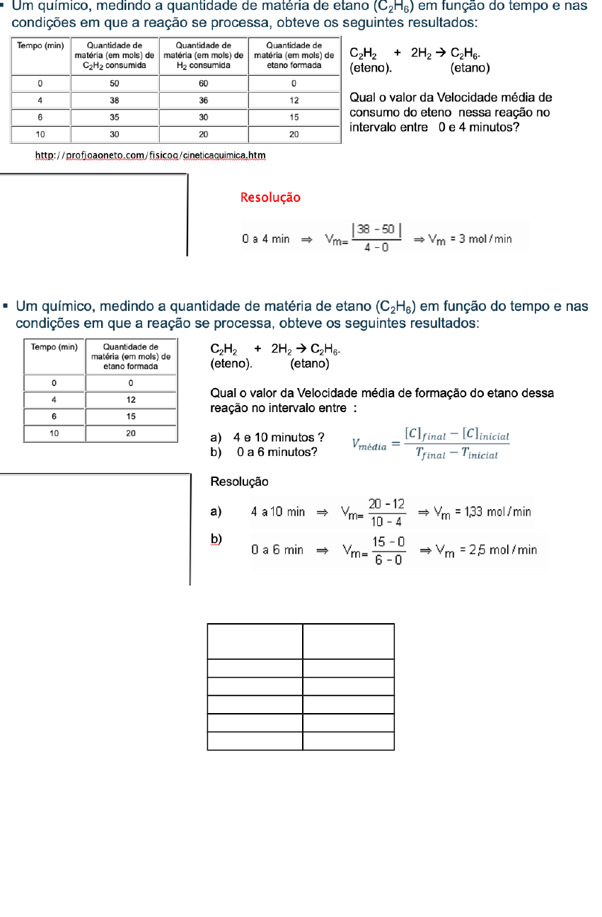 EXERCÍCIO DE FIXAÇÃO – CINÉTICA QUÍMICA – PARTE A Exemplo de cálculo de velocidade média b) Exercícios: Dada a tabela abaixo em relação à reação 2HBr à H2 + Br2 : Tempo (min) Mols de HBr 0 0,200 5 0,175 10 0,070 15 0,040 20 0,024 a) Qual a velocidade média desta reação em relação ao HBr, no intervalo de 0 a 5 minutos? Resposta:Podemos afirmar que a velocidade média desta reação em relação ao HBr, no intervalo de 0 a 5 minutos é de 0,005. Vm HBr= [n2-n1 / t2 - t1] Vm = [0,175 - 0,200 / 5 - 0] Vm = [-0,025 / 5] Vm = [- 0,005 ] Vm = 0,005 mols/min. b) Qual a velocidade média dessa reação, no intervalo citado anteriormente, em relação ao gás hidrogênio? Afirma-se que a velocidade média dessa reação, no intervalo citado anteriormente, em relação ao gás hidrogênio, é de 0,0025 mols/min. Vm H2 : 2mols de HBr ----------1 Mol de H2 0,005 ---------------------x 2x = 0,005 x = 0,005 / 2 x = 0,0025 mols/min. c) Determine a velocidade média dessa reação para o HBr e para o Br2, no intervalo de 10 a 15 mim. Podemos dizer que a velocidade média dessa reação para o HBr e para o Br2, no intervalo de 10 a 15 min, é de 0,006 mol/min. Vm HBr= [n2-n1 / t2 - t1] Vm = [0,040 - 0,070 / 15 - 10] Vm = [-0,030 / 5] Vm = [ -0,006] Vm = 0,006 mols / minuto. Vm Br2 2 HBr -------------- 1 Br2 0,006--------------- x 2x = 0,006 x = 0,006 / 2 x = 0,003 mols/min