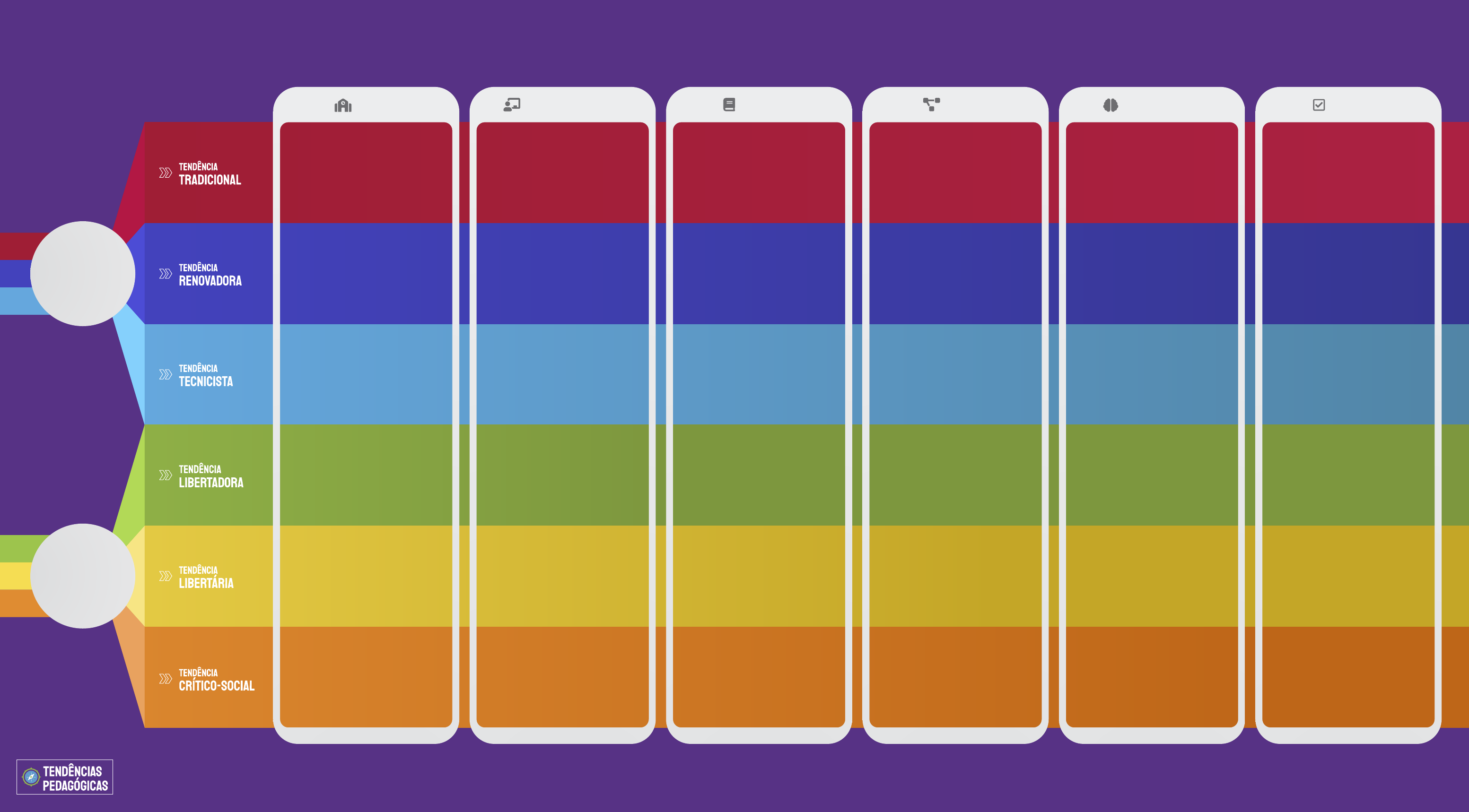 pedagogia LIBERAL pedagogia PROGRESSISTA escola conteúdoprofessor-aluno método avaliaçãoaprendizagem Procura adequar os alunos, considerando suas individualidades, às necessidades da sociedade. Essa adaptação integra, na medida do possível, as exigências do meio social aos interesses e às experiências dos alunos. São definidos a partir das experiências que os alunos vivenciam na construção da aprendizagem. Valoriza-se mais o processo de apreensão do conhecimento do que o saber acumulado. O professor deve estabelecer uma relação harmônica com os alunos, pois isso contribuirá para que lidere as experiências de aprendizagem. Estimulam o aprender-fazendo, com atividades de pesquisa e experimentação. As atividades também são elaboradas considerando a etapa de desenvolvimento do aluno. É contínua e busca identificar os êxitos dos alunos durante o processo ensino-aprendizagem. É uma atividade de descoberta. O aluno é estimulado a experimentar o conhecimento. A avaliação da aprendizagem é contínua, ou seja, ocorre durante o processo de aprendizagem. Prepara o aluno intelectualmente e desenha o caminho que todos devem percorrer para chegar ao conhecimento. São os conhecimentos enciclopédicos, aqueles acumulados pela sociedade, que possuem valor intelectual. O professor é a autoridade em sala de aula, pois é ele quem domina o conhecimento científico. Ele deve valorizar a disciplina e estabelecer uma relação de respeito perante os alunos. São expositivos, focam na comunicação oral do conteúdo e na demonstração feitas pelo professor. Os exercícios de repetição são valorizados, pois permitem que o aluno memorize os conceitos e as fórmulas. É feita por meio de provas orais e escritas, testes e exercícios para casa, com o objetivo de metrificar o conhecimento. É receptiva e mecânica, o aluno deve seguir todos os passos estabelecidos pelo professor para assimilar o conteúdo. Por isso, são usados exercícios de repetição para garantir que o aluno aprendeu a matéria. Organiza o ensino, articulando-o ao sistema produtivo. Dessa forma, a escola pode formar os alunos, tornando-os competentes para o mercado de trabalho. São baseados em leis científicas e organizados de maneira lógica e sequencial. Tudo o que é ensinado precisa ser mensurado. O professor é um técnico responsável por executar o programa educacional e ao aluno cabe reproduzir aquilo que foi instruído a fazer. Utilizam técnicas de repetição, cópia, treino e correção para que o aluno possa executar as experiências de aprendizagem de maneira eficiente. Usa recursos para medir a aprendizagem dos alunos, como provas e testes. O aprendizado se dá quando o aluno é capaz de executar eficientemente aquilo que foi direcionado a fazer. Nesse sentido, a aprendizagem ocorre quando o aluno apresenta comportamentos diferentes daqueles que manifestava quando iniciou o processo de ensino-aprendizagem. Tem o papel de estimular a conscientização da realidade social para transformá-la. São estabelecidos a partir de temas geradores, que partem da vida prática dos alunos. É construída com base no diálogo, no qual professor e aluno são livres para expressarem as suas contribuições ao processo de ensino-aprendizagem. Possuem como base o diálogo, com o objetivo de garantir a participação do aluno. Para isso, são organizados grupos de discussão. É uma atividade de problematização de uma situação, com o objetivo de tornar o aluno mais crítico. Busca construir indivíduos livres e autogestores. Resultam das necessidades do aluno e não são impostos. O professor está a serviço do aluno, atuando com um conselheiro. Contemplam a liberdade de expressão e valorizam a vivência em grupo. Enfatiza a aprendizagem informal e coletiva. Não é punitiva e o aluno é estimulado a se autoavaliar. É valorizada como local de aquisição dos saberes. São os conhecimentos universais, acumulados pela sociedade, que são constantemente reavaliados frente às realidades sociais. Professor e aluno são colaboradores e trocam conhecimentos. Devem favorecer a relação dos conteúdos com os interesses dos alunos. Não é um julgamento, mas busca evidenciar o progresso do aluno e a sua aquisição de conhecimentos mais sistematizados. Compreende a capacidade do aluno de processar as informações, ligando os conceitos específicos aos mais gerais. É feita uma avaliação mútua, entre professor e aluno, além de se permitir a autoavaliação.