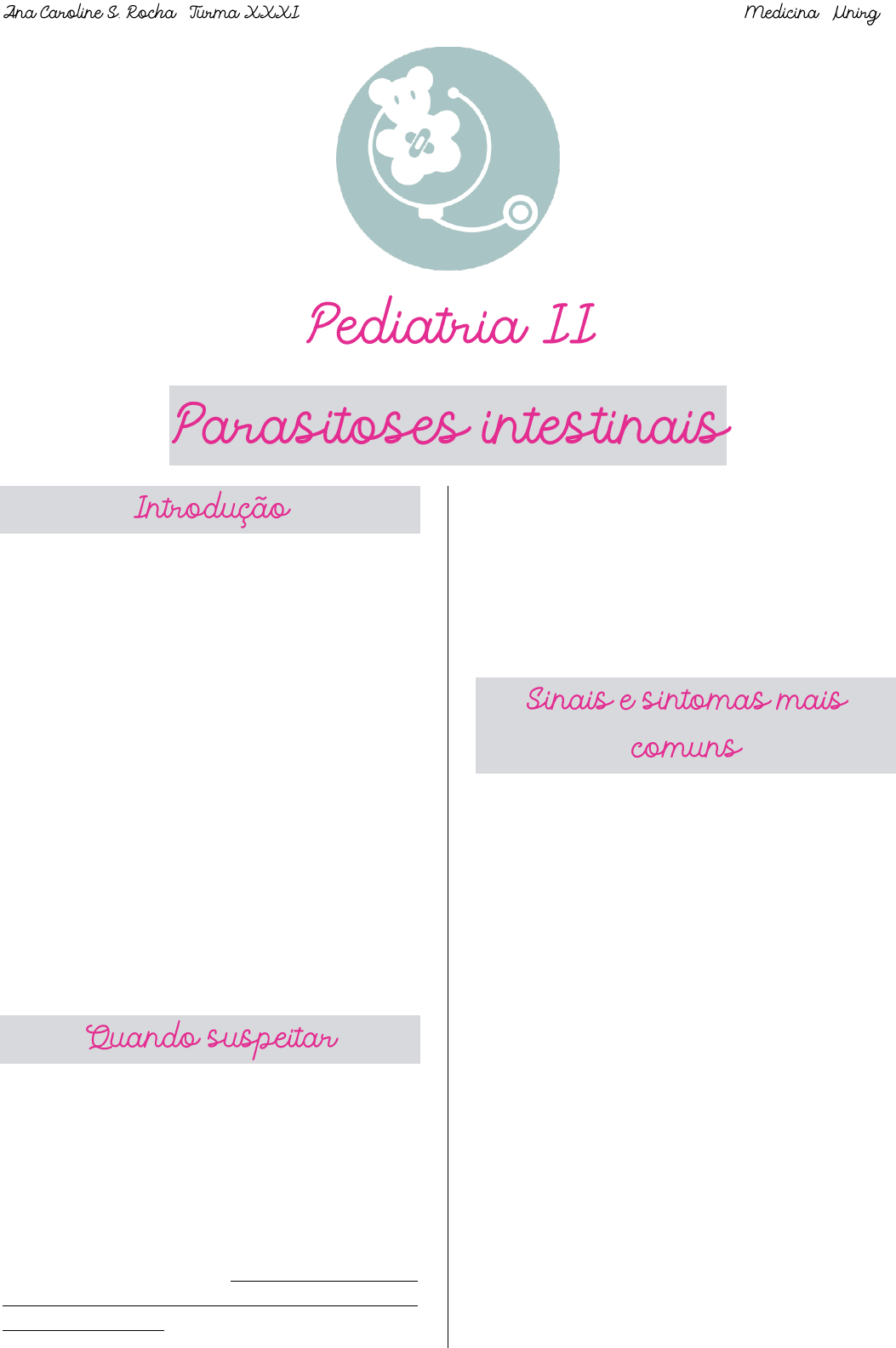 - - - As parasitoses apresentam alta prevalência intimamente relacionada a: Regiões sem saneamento; Locais sem água tratada e esgoto, coleta de lixo. - Relaciona-se ainda com: Baixa renda; Educação; Qualidade precária e deficiente dos serviços de saúde. - A repercussão e gravidade das parasitoses estão intimamente relacionadas com: Idade; Estado nutricional; Hábitos de vida; Imunocompetência; Doenças associadas. - O grau da lesão e a gravidade também se relacionam com a carga parasitária - Aspectos epidemiológicos da região onde o paciente se encontra. Devendo ser tratada sistematicamente em comunidades de alta prevalência. - Discrepância entre áreas urbanas bem desenvolvidas e periferias menos privilegiadas (EPF com positividade de 1 a 5% e de 50% respectivamente) = exame de fezes. - O relato de eliminação do parasita é conclusivo, história de parasitoses em irmãos e eosinofilia. - Repetição do tratamento: deve ser realizada após alguns dias para evitar a reinfecção endógena ou exógena, ou garantir. - O aspecto do parasito é de fundamental importância para o diagnóstico: Ascaris = 10 a 25 cm; Ancilóstomo = 0,8 a 1,2 cm; Oxiúros = 0,3 a 12cm; Proglotes de tênias; Trichuris = 0,4 a 0,5cm = prolapso. - Em todas as crianças desnutridas, deve ser pesquisada a possibilidade de parasitoses intestinais. - Diante de quadros de desnutrição e miséria, torna-se difícil a diferenciação diagnostica entre a parasitose e a condição de precariedade. - Manifestações digestivas: Anorexia; Dificuldade de ganhar peso; Irritabilidade; Dor e ou distinção abdominal; Náuseas e vômitos; Distúrbios no sono; Diarreia (fezes amolecidas) intermitentemente; Constipação; Ranger de dentes; Pancreatite-apendicite (verme migra para o apêndice); Suboclusão intestinal; Prurido anal ou vulvar. - Manifestações alérgicas: Manchas de pele; Prurido; - - Tosse paroxística; Urticária; Dispneia asmática; Edema de Quincke. - Manifestações pulmonares: Tosse espasmódica; Dispneia; Síndrome de Löffler ou Loeffler (pneumonia podem ser encontrada na fase pulmonar de ciclos de nematódeos) = é migratória. - Alterações comportamentais: Alteração do comportamento e humor. - Sinais gerais: Febre; Astenia; Anorexia; Anemia. - Anormalidades do hemograma: Leucocitose; Eosinofilia. - Platelmintos: Hymenolepis nana; Taenia solium; Taenia saginata; Schistossoma mansoni. - Nematelmintos: Ascaris lumbricoides; Enterobius vermicularis; Trichuris trichura; Ancylostoma duodenale; Strongyloide stercoralis; Necator americanus. - Sarcomastigophora: Entamoeba histolytica; Giardia lamblia. - Ciliophora: Balantidium coli. - Apicomplexa: Criptosporidium; Isospora belli. - Microsporida. - Larva livre na luz do TGI penetra ativamente na mucosa (ceco) ganha a circulação venosa passa pelo fígado e vai em direção ao pulmão encaminhando-se aos pulmões após, são deglutidas com as secreções respiratórias. - Síndrome de Löffler: Pneumonite; Tosse irritativa; Dispnéia; Broncoespasmo; Infiltrados pulmonares migratórios. - Vermes que causam essa síndrome: Ascaris lumbricoides; Ancylostoma duodenale; Necatur americanos; Strongyloides stercoralis. - Classificação: nematelminto “Ascaris lumbricoides” ou “lombriga”. - Ciclo biológico: Ingestão de ovos embrionados; Eclosão = as larvas liberadas dos ovos invadem o intestino e alcançam a corrente sanguínea, fígado e, posteriormente os pulmões; As larvas, através das vias respiratórias atingem a epiglote; São deglutidas e se transformam em vermes adultos no intestino delgado, completando o ciclo. - - - Sintomas: * Estágio larvar: Síndrome de Löffler. * Eliminação espontânea do verme adulto. Dor periumbilical; Desconforto abdominal; Náuseas; Vômitos; Flatulência; Obstrução intestinal; Perfuração intestinal; Penetração em via biliopancreática, apêndice, via respiratória e tuba auditiva. - Tratamento: * Piperazina Para uma suboclusão intestinal: A piperazina atua na junção mioneural do áscaris, produzindo uma paralisia flácida; O peristaltismo elimina os vermes vivos. Para uma obstrução intestinal: Jejum oral; Piperazina por sonda nasogástrica (100mg/kg + 30ml de óleo mineral 3/3 horas, por 24 horas); Hidratação parenteral; Se o quadro inalterado em 48 horas: intervenção cirúrgica. * Pamoato de Pirantel Paralisia dos vermes; Custo elevado. * Levamisol Contratura sustentada da musculatura do parasita; Reduz o risco de migração e de formação do bolo de áscaris; Droga ideal para ascaridíase isolada. * Mebendazol Polivalente; Inibe a captação de glicose pelos helmintos determinando morte dos vermes; Contraindicado na gravidez; Dose: 100mg 2xd 3d. * Albendazol Polivalente; Interfere no metabolismo da glicose dos vermes; Contraindicado em grávidas; Dose única de 400mg; Deve haver uma repetição após 30 dias. Obs: repetir o tratamento após 30 dias. - Classificação: Tricocefalose, tricocefalíase, tricurose, Tricuríase; Nematóide “Trichocephalus Trichuris” ou “Trichura Trichuris”. Não é muito comum aqui - Sintomas: Diarreia; Cólicas abdominais, Disenteria (causa sangue nas fezes); Tenesmo, Prolapso retal; Enterorragia; Anemia ferropriva. - Ciclo biológico: Vermes adultos localizam-se preferencialmente no ceco, apêndice, íleo terminal; Ovos eliminados nas fezes e embrionados no solo; Contaminação através da ingestão dos ovos do parasita. - Tratamento: Albendazol; Mebendazol. Obs: repetir o tratamento após 30 dias. - Classificação: “Necator americanus” e “Ancylostoma duodenale”; Amarelão ou Doença do Jeca-Tatu. - Ciclo biológico: Ovos nas fezes larvas pele íntegra (dermatite pruriginosa) corrente sanguínea pulmões (pneumonite eosinofílica) tubo digestivo intestino delgado sintomas = Dor abdominal; Vômitos; Diarreia (com sangue as vezes); - - Anemia espoliativa (sucção do sangue); Palidez; Perversão do apetite; Geofagia. Vermes adultos sintoma