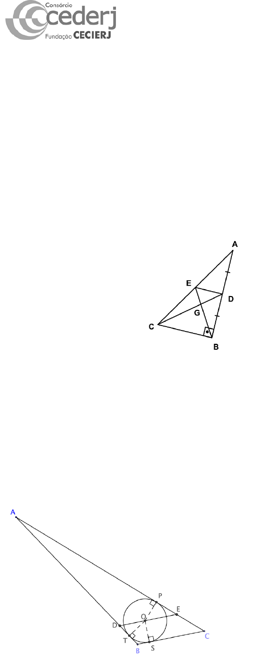 Fundação Centro de Ciências e Educação Superior a Distância do Estado do Rio de Janeiro Centro de Educação Superior a Distância do Estado do Rio de Janeiro Geometria Plana – EP07 – Gabarito _________________________________________________________________________________ Prezado(a) aluno(a), O conteúdo desta semana conforme Cronograma é Aula 6: Pontos Notáveis de um Triangulo. - É importante desenvolver a visão geométrica. Habitue-se a representar suas próprias figuras antes de verificar a resposta. - Leia e resolva os exercícios da Aula 6 até página 128. - Faça um resumo do conteúdo abordado por aula. - Compare a sua justificativa com a solução do Gabarito. Preencher somente os valores na figura não é justificativa. _________________________________________________________________________________ Errata: No exercício proposto 1 da página 126, do Livro texto, o triângulo ABC é retângulo em B. Figura correta: ___________________________________________________________________________________ Exercício: a) Defina lugar geométrico. b) Na aula 6 foram apresentados 2 teoremas. Enuncie os dois teoremas dessa aula. c) Defina baricentro, incentro, ortocentro e circuncentro de um triângulo. d) Defina triângulo órtico. e) A figura em Geogebra do exercício proposto 3 da Aula 6 está na Sala de aula dessa Semana. Arraste o vértice C. Segue a figura: Na figura acima observe que D não coincide com o ponto de tangência da circunferência inscrita! Geometria Plana EP07 - Gabarito 2 Exercício proposto 2 - página 126: Considere um triângulo ABC, tal que as medianas BM e CN , que se cortam em G, sejam iguais. Mostre que: a) 𝐵𝐺̅̅ ̅̅ = 𝐶𝐺̅̅ ̅̅ , b) que os triângulos CGM e BGN são congruentes, c) que o triângulo ABC é isósceles. Solução: Seja o triângulo ABC, tal que as medianas BM e CN cortam-se em G (baricentro) e 𝐵𝑀̅̅ ̅̅̅ = 𝐶𝑁̅̅ ̅̅ . a) 𝐵𝐺̅̅ ̅̅ = 2 3 𝐵𝑀̅̅ ̅̅̅ e 𝐶𝐺̅̅ ̅̅ = 2 3 𝐶𝑁̅̅ ̅̅ , então 𝐵𝐺̅̅ ̅̅ = 𝐶𝐺̅̅ ̅̅ , já que 𝐵𝑀̅̅ ̅̅̅ = 𝐶𝑁̅̅ ̅̅ b) ΔCGM ≡ ΔBGN , pois 𝐵𝐺̅̅ ̅̅ = 𝐶𝐺̅̅ ̅̅ 𝑁𝐺�̂� = 𝑀𝐺�̂� (ângulo oposto pelo vértice) e 𝐺𝑁̅̅ ̅̅ = 𝐺𝑀̅̅̅̅̅ = 1 3 𝐶𝑁̅̅ ̅̅ = 1 3 𝐵𝑀̅̅ ̅̅̅, pelo caso LAL. c) Do item b) temos 𝑁𝐵̅̅ ̅̅ = 𝑀𝐶̅̅̅̅̅ = 𝐴𝑁̅̅ ̅̅ = 𝐴𝑀̅̅̅̅̅, onde M e N são pontos médios de AC e AB. Daí 𝐴𝐵̅̅ ̅̅ = 𝐴𝐶̅̅ ̅̅ , portanto o triângulo ABC é isósceles. _____________________________________________________________________________________________________________ Exercício 1: Quais pontos notáveis de um triângulo nunca se posicionam externamente em relação a sua região triangular? a) Baricentro e ortocentro. b) Incentro e circuncentro. c) Baricentro e circuncentro. d) Incentro e ortocentro. e) Baricentro e incentro. Solução: Resposta é o item (e). Justificativa: Geometria Plana EP07 - Gabarito 3 Se G é o baricentro do Δ ABC, temos que AG = 2 3 AM1, BG = 2 3 BM2 e CG = 2 3 BM3. Se I é o incentro, então I é o centro do círculo inscrito no triângulo. _____________________________________________________________________________________________________________ Exercício 2: Na figura, as medianas 𝐴𝐸̅̅ ̅̅ , 𝐵𝐹̅̅ ̅̅ e 𝐶𝐷̅̅ ̅̅ são concorrentes em Q. a) Defina mediana de um triângulo. b) Se 𝐴𝐸̅̅ ̅̅ = 9 cm, quanto vale 𝐴𝑄̅̅ ̅̅ ? c) Se 𝑄𝐷̅̅ ̅̅ = 5 cm, quanto vale 𝐶𝐷̅̅ ̅̅ ? d) Se 𝐵𝑄̅̅ ̅̅ = 12 cm, quanto vale 𝑄𝐹̅̅ ̅̅ ? e) Se 𝑄𝐸̅̅ ̅̅ = 4 cm, quanto vale 𝐴𝑄̅̅ ̅̅ ? Solução: a) Veja definição na página 31 do material didático. Como 𝐴𝐸̅̅ ̅̅ , 𝐵𝐹̅̅ ̅̅ e 𝐶𝐷̅̅ ̅̅ são medianas, temos que: b) Se 𝐴𝐸̅̅ ̅̅ = 9 cm, 𝐴𝑄̅̅ ̅̅ = 2 3 𝐴𝐸̅̅ ̅̅ logo 𝐴𝑄̅̅ ̅̅ = 2 3 . 9 = 6 cm. c) Se 𝑄𝐷̅̅ ̅̅ = 5 cm, 𝑄𝐷̅̅ ̅̅ = 𝐶𝐷̅̅ ̅̅ 3 então 5 = CD̅̅̅̅ 3 ⇒ 𝐶𝐷̅̅ ̅̅ = 3 ∙ 5 = 15 cm d) Se 𝐵𝑄̅̅ ̅̅ = 12 cm, 𝐵𝑄̅̅ ̅̅ = 2 ∙ 𝑄𝐹̅̅ ̅̅ , então 12 = 2 ∙ 𝑄𝐹̅̅ ̅̅ ⇒ 𝑄𝐹̅̅ ̅̅ = 12 2 = 6 cm. e) Se 𝑄𝐸̅̅ ̅̅ = 4 cm, 𝐴𝑄̅̅ ̅̅ = 2 ∙ 𝑄𝐸̅̅ ̅̅ , então 𝐴𝑄̅̅ ̅̅ = 2 ∙ 4 = 8 cm. _____________________________________________________________________________________________________________ Exercício 3: ABC é um triângulo retângulo no qual a medida do ângulo �̂� é 58° e AH, AM e AD são, respectivamente, altura, mediana e bissetriz interna traçadas pelo vértice A do ângulo reto. a) Defina bissetriz e altura de um triângulo. b) Faça a figura do enunciado. c) Calcule as medidas dos ângulos 𝐵𝐴�̂�, 𝑀𝐴�̂�, 𝐷𝐴�̂�, e 𝐻𝐴�̂�. Solução: a) Definições nas páginas 31 e 32 do material didático. Geometria Plana EP07 - Gabarito 4 b) e c) Considere um triângulo ABC retângulo no qual a medida do ângulo �̂� é 58° e AH, AM e AD são, respectivamente, altura, mediana e bissetriz interna traçadas pelo vértice A do ângulo reto. Do enunciado podemos concluir que: 𝐴𝑀̅̅̅̅̅ = 𝐵𝑀̅̅ ̅̅̅ = 𝐶𝑀̅̅̅̅̅ Δ AMC é isósceles pois 𝐴𝑀̅̅̅̅̅ = 𝐶𝑀̅̅̅̅̅ . Logo m(𝑀𝐴�̂�) = 58°. Então m(𝐵𝐴�̂�) = 90° − 58° = 32°. Como o triângulo AHC é retângulo, então m(𝐻𝐴�̂�) = 90° − 58° = 32°. Como AD é bissetriz, m(𝐷𝐴�̂�) = 90° 2 = 45°, então m(𝑀𝐴�̂�) = 58° − 45° = 13° e m(𝐷𝐴�̂�) = 45° − 32° = 13° _____________________________________________________________________________________________________________ Exercício 4: Na figura, M é o ponto médio do lado BC e CN é bissetriz interna. Determine a medida de α, em graus. Exercício: Reescreva o enunciado desta q