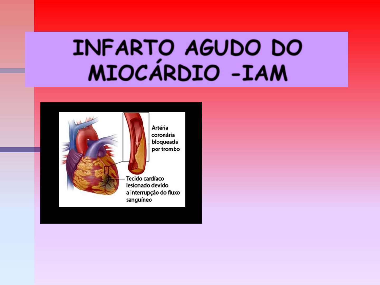 INFARTO AGUDO DO MIOCÁRDIO -IAM M.Sc. Glívia Barros Graduação em Fisioterapia- UFPE Mestre em Patologia– Núcleo de Pós-Graduação em Patologia/UFPE Coordenadora de Fisioterapia- Santa Casa de Misericórdia de Recife Docente Estácio- Recife MECANISMOS DETERMINANTES DA ISQUEMIA MIOCÁRDICA NAS SÍNDROMES CORONÁRIAS AGUDAS Aterosclerose: É a situação caracterizada pelo depósito de colesterol, detritos celulares, cálcio e fibrina (material da coagulação do sangue) na camada média das artérias. Arteriosclerose: É definida pelo endurecimento e espessamento da parede das médias e grandes artérias, em virtude da perda ou diminuição da elasticidade arterial. Arteriolosclerose: Apresenta a mesma definição de arteriosclerose, mas ocorre em pequenas artérias, as arteríolas. NÃO CONFUNDIR! Anatomia da Irrigação do Miocárdio DAC Obesidade Vida Sedentária Estresse Diabetes Hipertensão Dislipidemia Tabagismo FATORES DE RISCO FATORES DE RISCO PARA DAC INALTERADOS C/ EXERCÍCIO IDADE: 35 A 50 ANOS SEXO: ANTES DOS 50 ANOS HOMENS APÓS OS 55 PARA AS MULHERES RAÇA: NEGRA HEREDITARIEDADE: 50% SE DUPLA ALTERADOS C/ EXERCÍCIO SEDENTARISMO EXERC. 30 A 55% RISCO DE DAC HIPERCOLESTEROLEMIA EXERC. HDL E LDL DIABETES A RESISTÊNCIA A INSULINA FACILITANDO A UTILIZAÇÃO DE GLICOGÊNIO PERIFÉRICO FATORES DE RISCO PARA DAC HIPERTENSÃO ARTERIAL EXERC. 10 mmHg PAS VASCULARIZAÇÃO E VASODILATAÇÃO FUNCIONAL REDUZ OS NÍVEIS CIRCULANTES DE CATECOLAMINAS REAJUSTA OS QUIMIO E BARORRECEPTORES , AUMENTANDO A SENSIBILIDADE DA MUSCULATAURA LISA VASCULAR NO E FIBRINOGÊNIO FATORES DE RISCO PARA DAC CLASSIFICAÇÃO CARACTERÍSTICAS Tipo I Lesão microscópica, invisível a olho nu, caracterizada pelo aparecimento das células espumosas, que são macrófagos cheios de gordura, acometendo a íntima vascular. Esse tipo de lesão já pode ocorrer antes mesmo do primeiro ano de vida. Tipo II Lesão conhecida como “estria gordurosa”. É a primeira fase visível a olho nu. É composta por macrófagos, células musculares lisas e pequenos grãos de gordura extracelular. Lesões desse tipo são encontradas antes da terceira década de vida. Tipo III Denominada de pré-ateroma, origina-se, sobretudo, das lesões tipo II e difere destas por possuir maior quantidade de lipídeo formando pequenos núcleos visíveis a olho nu. Pode-se afirmar que é uma fase de transição para a formação da lesão tipo IV. Tipo IV Nessa lesão, a placa de ateroma já está formada. Possui um núcleo lipídico individualizado, formado pela fusão das ilhotas de gordura das lesões tipo III. Esse núcleo é também chamado de centro necrótico por possuir, além de macrófagos e gordura livre, uma quantidade significativa de fragmentos de células necrosadas. Tipo V Lesão caracterizada pela presença de tecido fibroso envolvendo o núcleo lipídico Tipo VI Essa lesão é a placa complicada por trombo, fissura, rotura, hemorragia ou erosão. É considerada a causa dos eventos isquêmicos agudos e, geralmente, é procedente de placas do tipo IV ou V CLASSIFICAÇÃO FISIOPATOLÓGICA DAS LESÕES SEGUNDO A ASSOCIAÇÃO AMERICANA DO CORAÇÃO PATOGENIA DA ISQUEMIA DO MIOCÁRDIO Demanda miocárdica de oxigênio Freqüência cardíaca Contratilidade Tensão da parede volume ventricular pressão ventricular Suprimento miocárdica de oxigênio Diferença artério-venosa de oxigênio Fluxo sangüíneo coronário Pressão de perfusão coronária Resistência coronária: ateroma espasmo trombo Isquemia Alteração do ECG Angina Disfunção V. E. MORTE DO TECIDO DO MIOCÁRDIO ESTENOSE >75% DA ARTÉRIA CORONÁRIA OCLUSÃO Regenga, M, 1998 David, D. R; Vale, D.G, 2003 ALTERAÇÃO HISTOLÓGICA IRREVERSÍVEL A Célula Necrosada Sintomatologia Clínica Alterações no ECG Elevação de enzimas Alterações na contratilidade cardíaca: hipocinesia Sociedade Brasileira de Cardiologia. 2001 TROMBOSE INTRALUMINAL SÍNDROME CORONARIANA AGUDA: Angina Instável Infarto Agudo do Miocárdio Principal causa de MORTALIDADE INSUFICIÊNCIA VASCULAR CEREBRAL AGUDA: Ataque Isquêmico Transitório Acidente Vascular Cerebral Principal causa de INCAPACIDADE RUPTURA DA PLACA ATEROSCLERÓTICA ISQUEMIA PROLONGADA INFARTO TIPOS DE DAC ANGINA ESTÁVEL ANGINA INSTÁVEL IAM SEM SUPRA ST IAM COM SUPRA ST (Lopes et al. 2006) ANGINA DO PEITO Dor ou desconforto nas regiões precordial, mandíbula, epigástrio, dorso, MMSS. Tipicamente dura 5-15min. Causas: • Pacientes com DAC de pelo menos uma artéria epicárdica. • Miocardiopatia hipertrófica, HAS, Doenças Valvares. •Coronárias normais e espasmo por disfunção endotelial. O exame físico geralmente é normal, porém com obstrução parcial do fluxo sangüíneo; desequilíbrio oferta O2 X demanda. Sociedade Brasileira de Cardiologia. 2001 ANGINA ESTÁVEL DOR RETROESTERNAL OU PRECORDIALGIA DURAÇÃO 2 A 5 MIN. DESENCADEADO ESFORÇO, STRESS ALIVIA C/ REPOUSO, VASODILAT. SUBLING. ECG NORMAL 85% CASOS INSTÁVEL NÃO É ALIVIADA COM O REPOUSO/MEDICAÇÕES INÍCIO SÚBITO/ NÃO SEGUE PADRÃO RELACIONADO COM TÔNUS ARTERIAL COR. VARIANTE (PRINZMETAL) DOR EM REPOUSO ALÍVIO – MEDICAÇÃO Angina de Prinzmetal • Espasmo de uma artéria coronariana • Paciente em repouso • Arritmias cardíacas Infarto Agudo do Miocárdio - IAM NECROSE IRREVERSÍVEL 50% MORREM NA 1 HORA ARRITMIAS FREQUENTES E VARIÁVEIS PRINCIPAL CAUSA MORTE EM PAÍSES INDUSTRIALIZADOS (PESARO, 2004) Classificação do IAM (BEVILACQUA.1985) (ROBBINS, 2000). LOZOVOY, et al. 2008 DIAGNÓSTICO DO IAM ECG ALTERAÇÕES ELETROCARDIOGRÁFICAS Ponto J Mansur, et al. 2006 O diagnóstico eletrocardiográfico é dado pela análise do ECG 12 derivações, o qual apresenta alterações de ST / T / onda Q Miocárdio Íntegro Infarto recente Infarto antigo ECG normal Elevação de ST Onda Q importante Inversão de onda T Mansur, et al. 2006 ISQUEMIA LESÃO NECROSE ALTERAÇÕES ELETROCARDIOGRÁFICAS NO IAM Mansur, et al. 2006 DOSAGEM ENZIMÁTICA ENZIMAS I